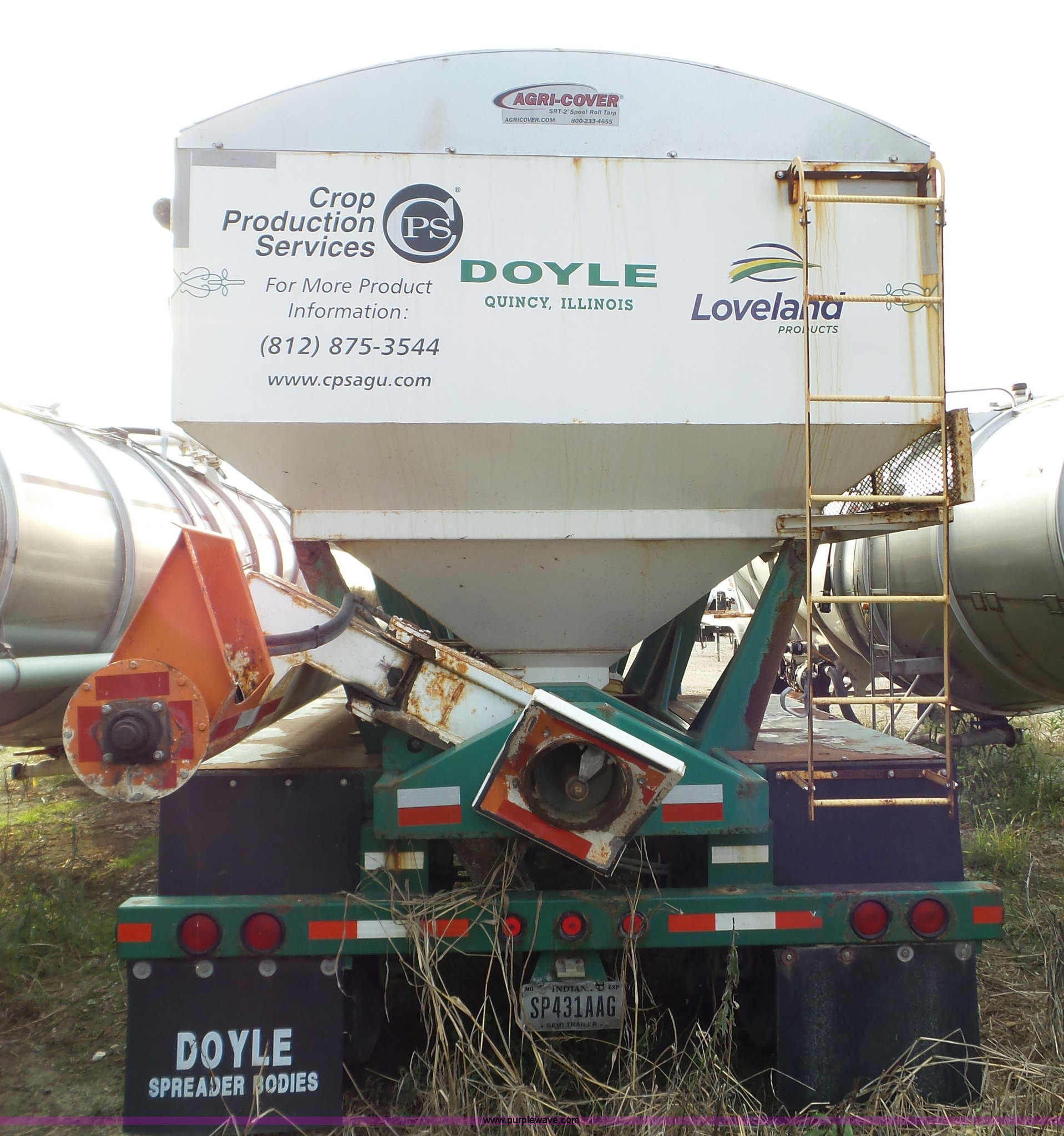 2007 Doyle tender trailer. Approx. 33'L x 8'W, 24 ton capacity, 8" auger Hydraulic operation, Electric rollover tarp, Dual leg landing gear, Spring suspension, Air brakes, 255/70R22.5 tires, GVWR 68,000 lbs, Unit# 13355. Title distribution may be delayed up to 30 days from verification of funds. 1N9DD342X7B175776. Crop Production Services. 4130 W 315 N. Switz City, IN 47465