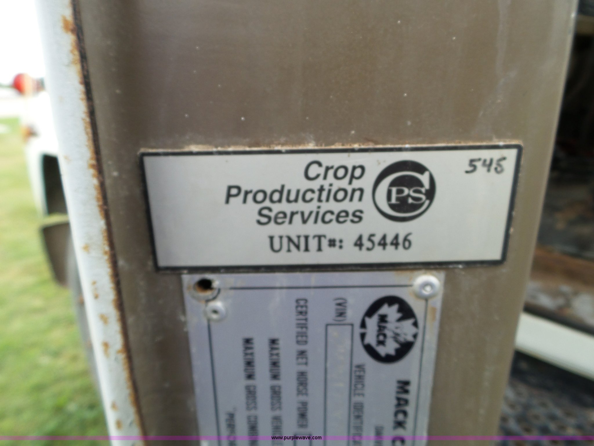1982 Mack R686ST truck cab and chassis. 557,189 miles on odometer, Mack E6 11.0L six cylinder turbo diesel engine, Six speed manual transmission, Tandem axle, Full differential lock, Heat, AM/FM/cassette, Air suspension seat, Block heater, PTO, Exterior visor, Front tow hooks, Single exhaust stack, Dual fuel tanks, Spring over walking beam suspension, Air brakes, Engine brake, Double frame, 200" wheelbase, 11R22.5 tires, Unit# 45446. Title distribution may be delayed up to 30 days from verification of funds. 2M2N179Y7CC079924. Crop Production Services. 10237 E 200 N. Otwell, IN 47564