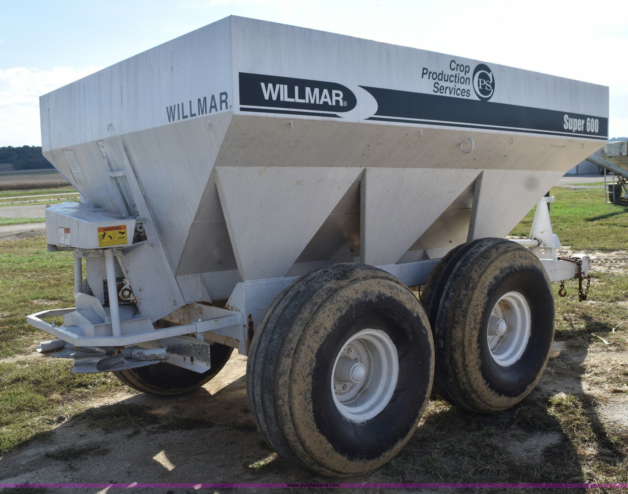 Purple Wave is selling a used Fertilizer or Seed Tender in Indiana. This item is a Willmar Super 600 spreader with the following: 10'L box, Dual spreader, 8"W conveyor, 540 PTO, Pin hitch, 19-16 tires, Unit# 50607