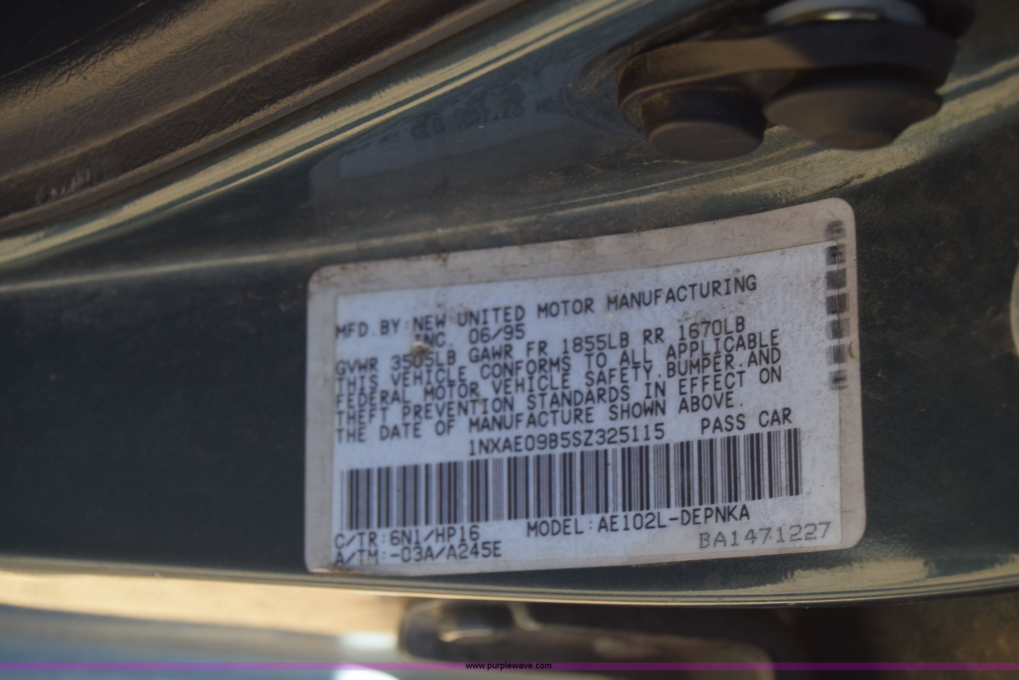 Purple Wave is selling a used Passenger Vehicle in Kansas. This item is a 1995 Toyota Corolla with the following: 180,608 miles on odometer, 1.8L L4 DOHC gas engine, Automatic transmission, Heat, Tilt, Power windows and locks, Cloth interior, 185/65R14 tires, Interior/exterior cosmetic damage, Dents, Scratches, Paint faded, Hood will not open, Case# 15CO50433