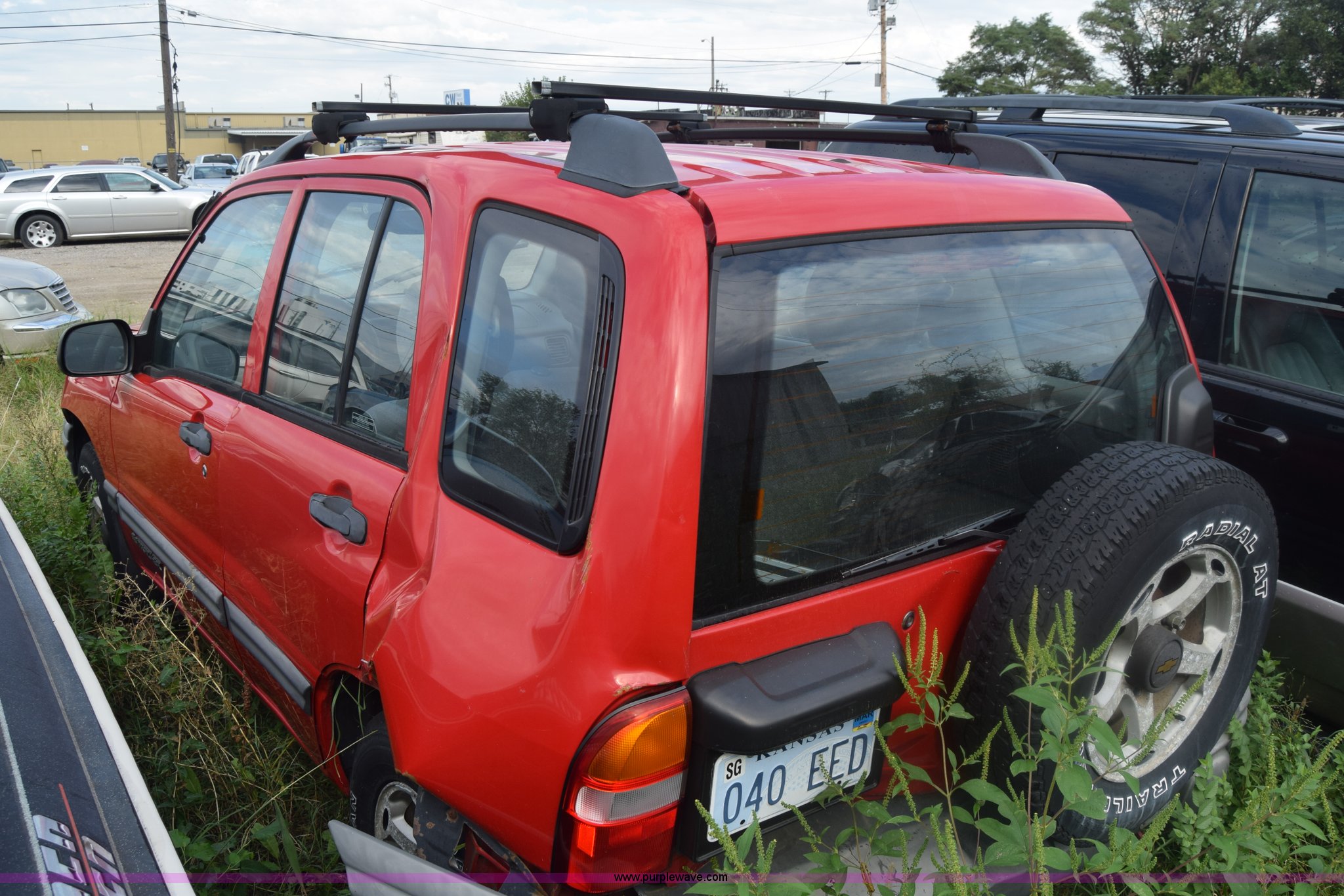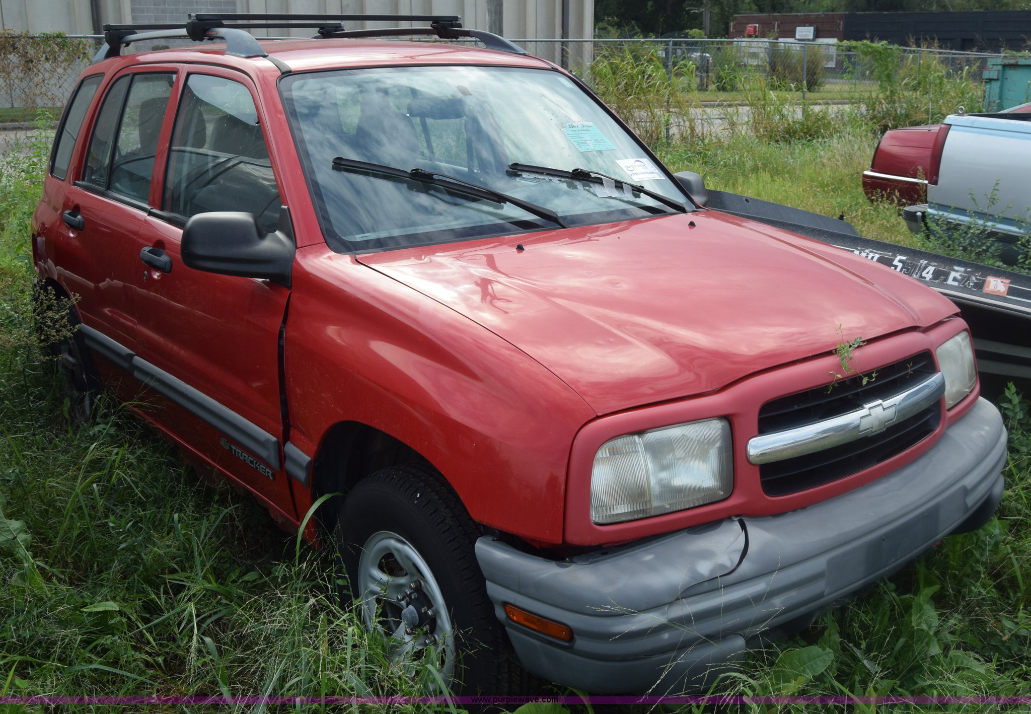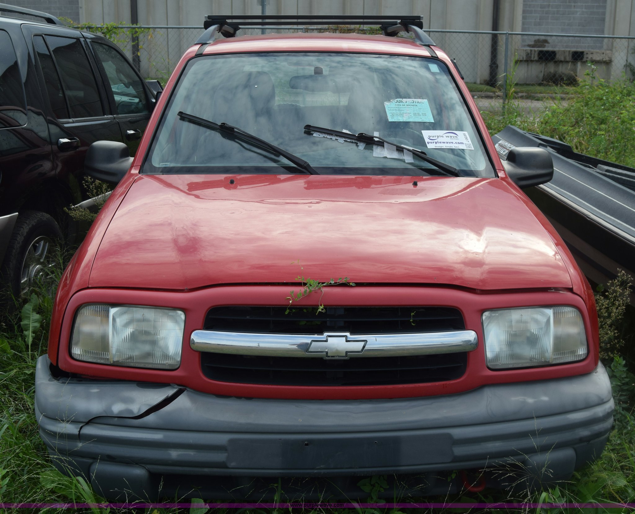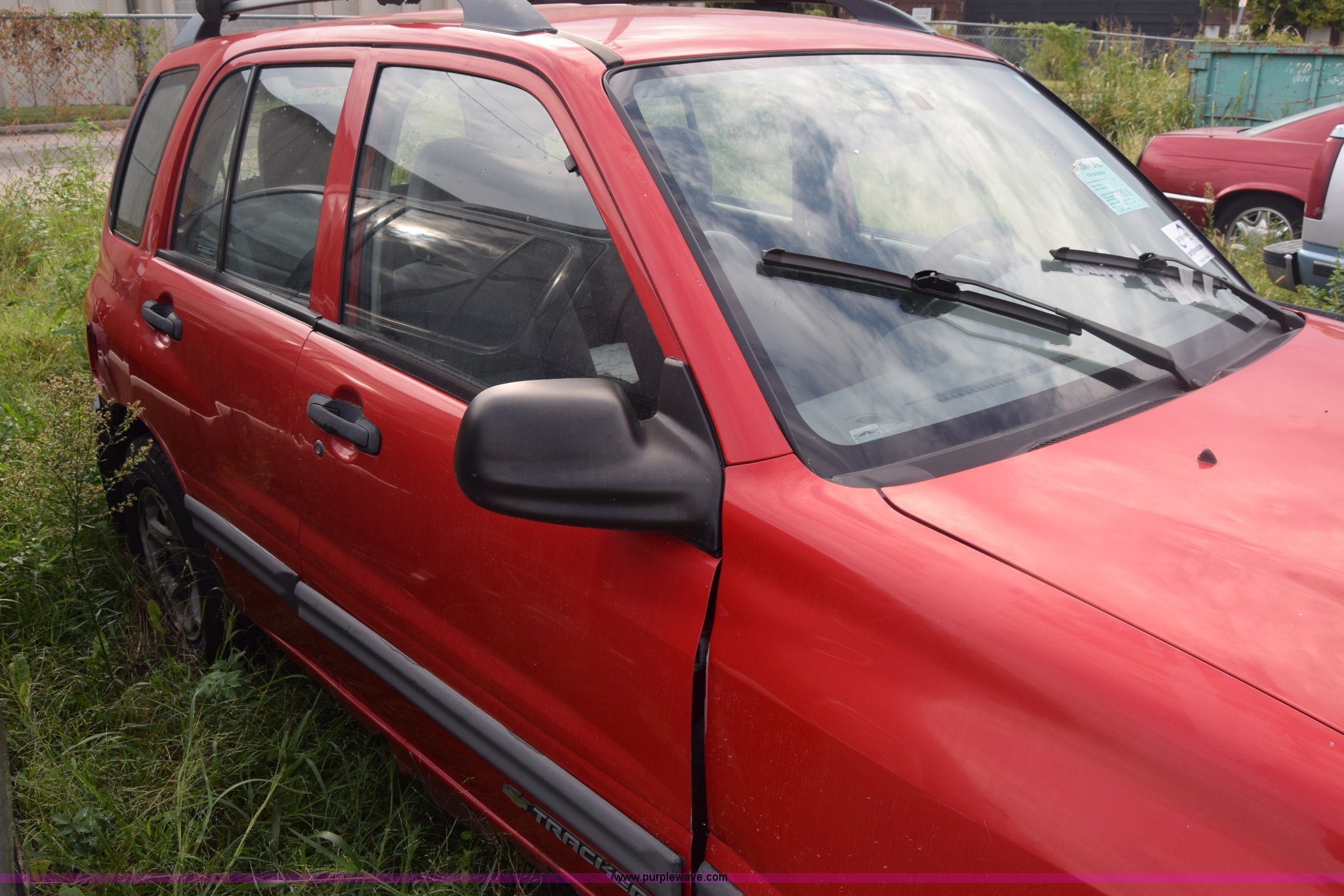 Purple Wave is selling a used Passenger Vehicle in Kansas. This item is a 1999 Chevrolet Tracker SUV with the following: Unknown miles on odometer, 2.0L L4 DOHC 16V gas engine, Automatic transmission, Four wheel drive, AC and heat, Tilt, AM/FM/cassette, Manual windows and locks, Cloth interior, 205/75R15 tires, Interior/exterior cosmetic damage, Dents, Paint scratched, Body damage, Front bumper damaged, Doors locked, Case# 15C43013