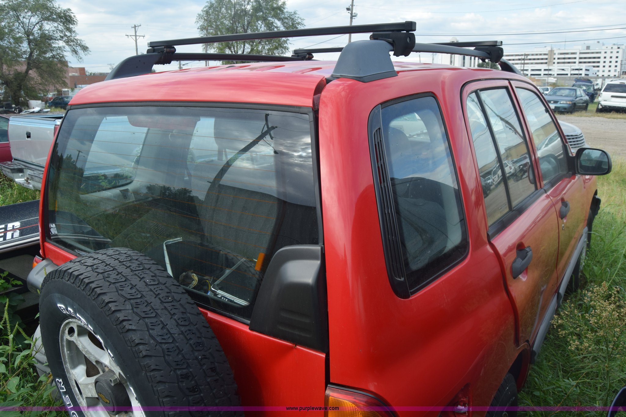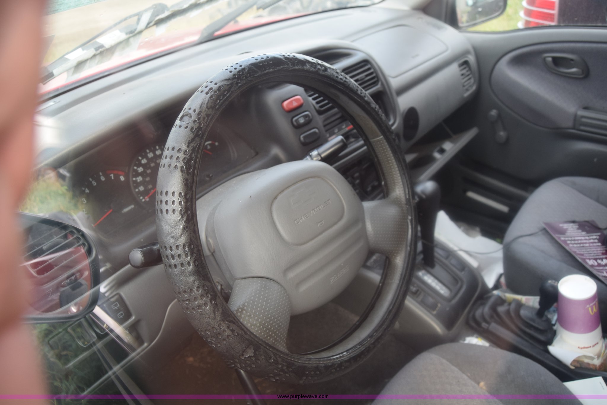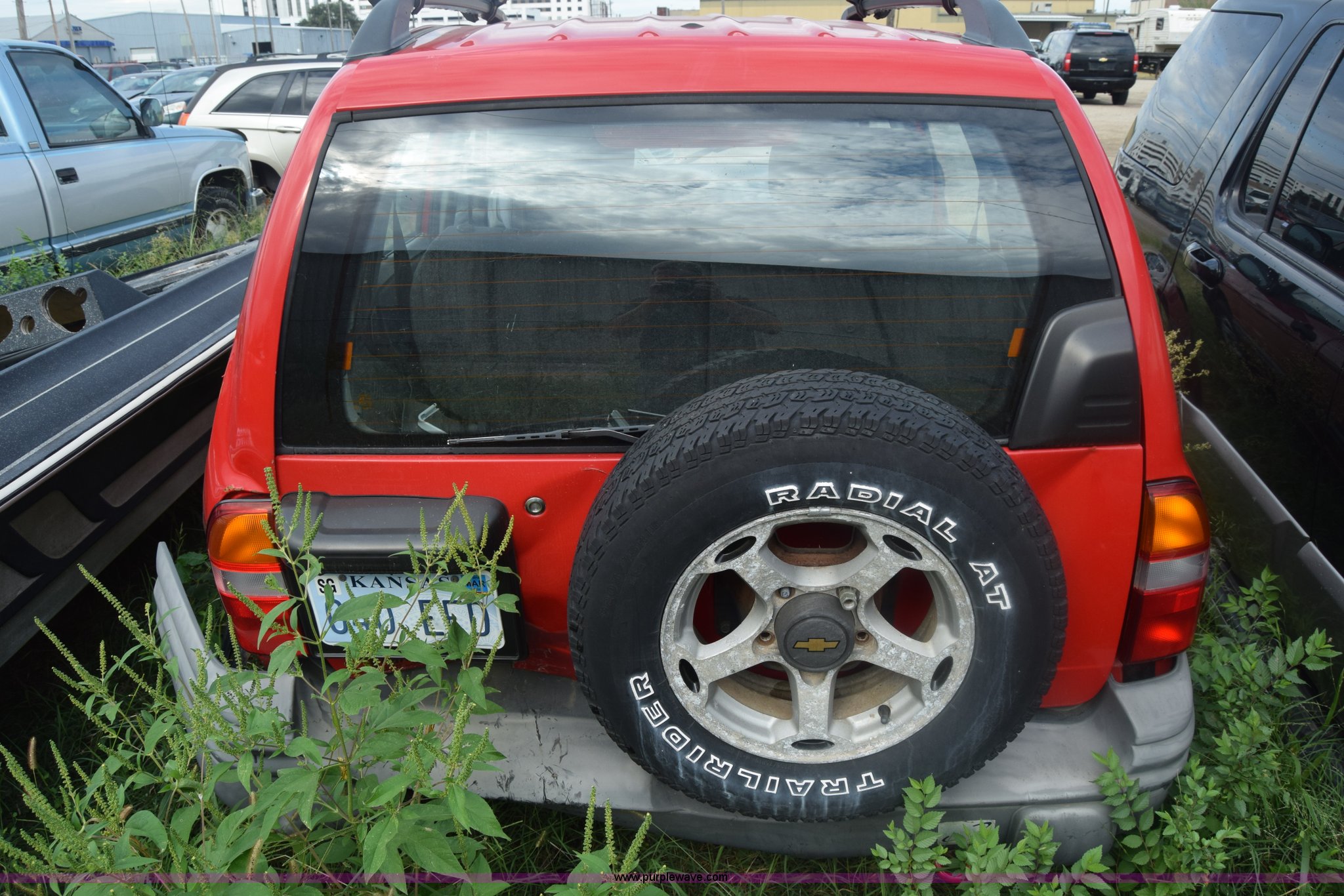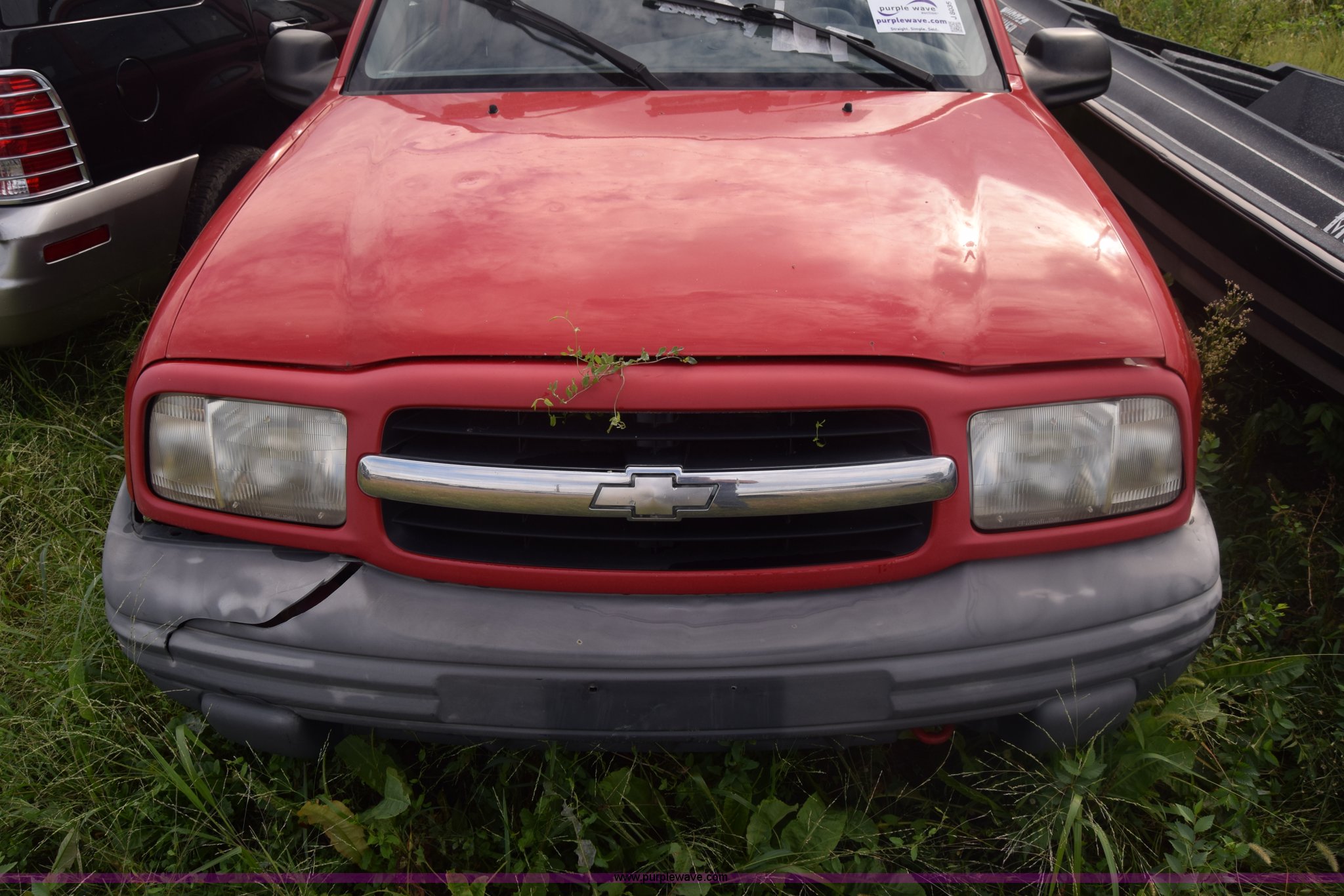 Purple Wave is selling a used Passenger Vehicle in Kansas. This item is a 1999 Chevrolet Tracker SUV with the following: Unknown miles on odometer, 2.0L L4 DOHC 16V gas engine, Automatic transmission, Four wheel drive, AC and heat, Tilt, AM/FM/cassette, Manual windows and locks, Cloth interior, 205/75R15 tires, Interior/exterior cosmetic damage, Dents, Paint scratched, Body damage, Front bumper damaged, Doors locked, Case# 15C43013