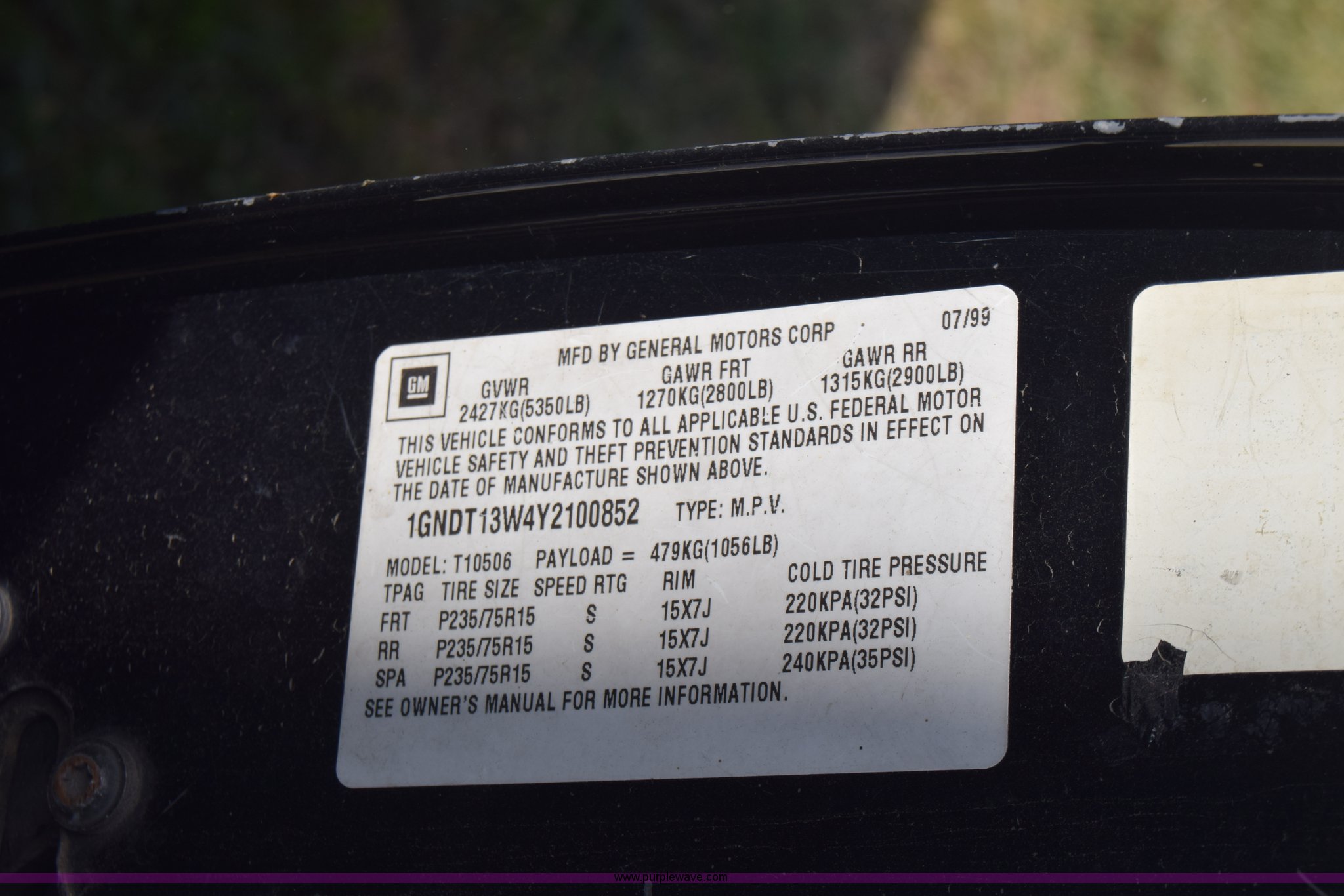 Purple Wave is selling a used Passenger Vehicle in Kansas. This item is a 2000 Chevrolet Blazer SUV with the following: Unknown miles on odometer, 4.3L V6 gas engine, Automatic transmission, AC and heat, Tilt, Cruise, AM/FM/CD, Power windows and mirrors, Cloth interior, Receiver hitch, 235/75R15 tires, Interior/exterior cosmetic damage, Dents, Scratches, Case# 15C50920