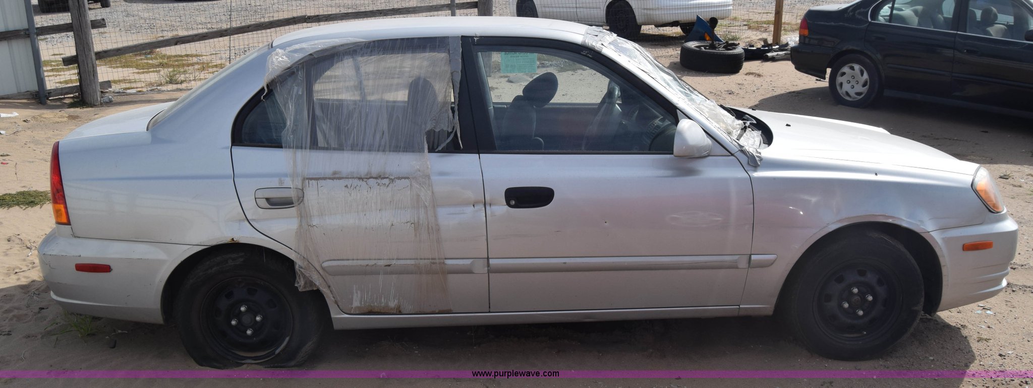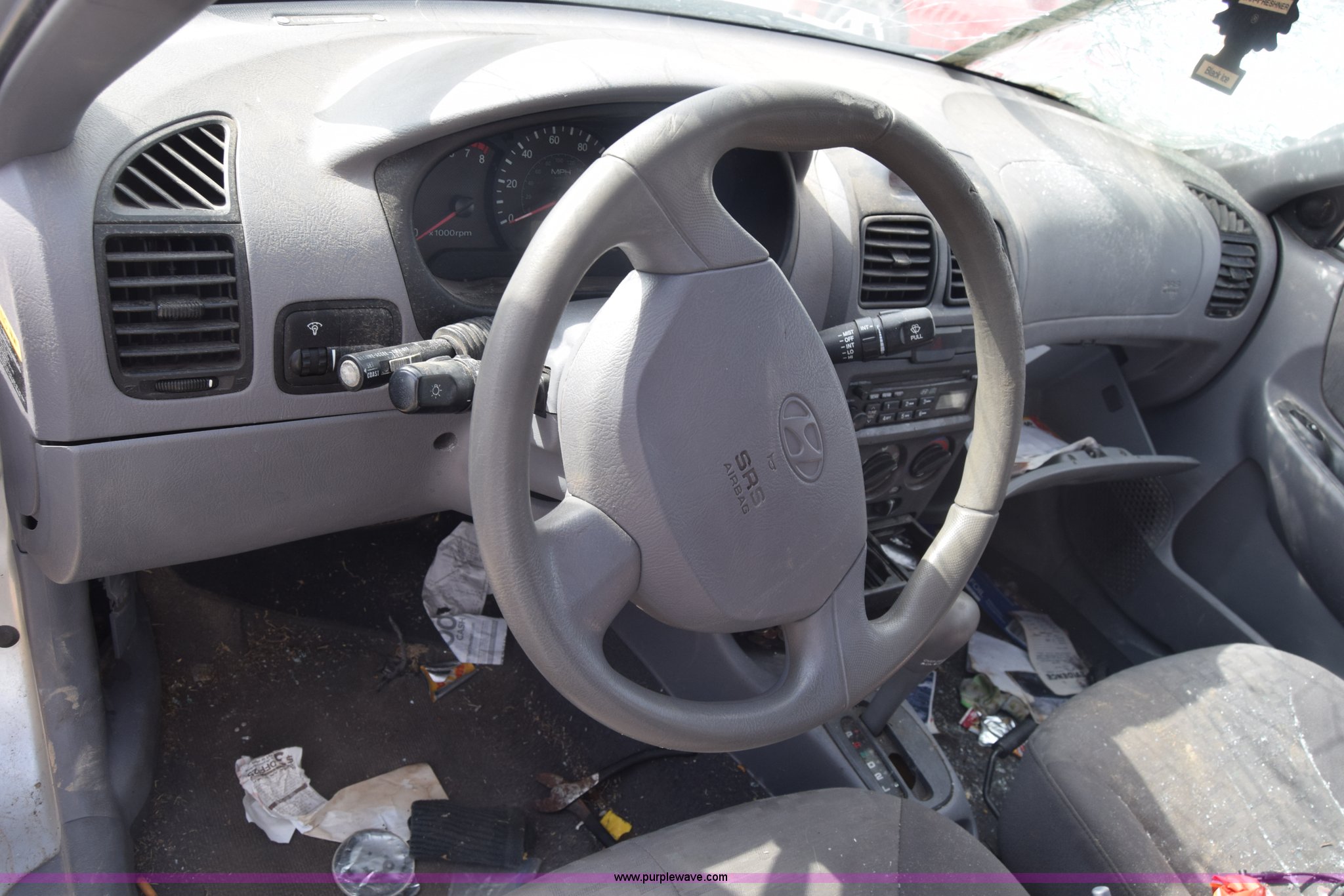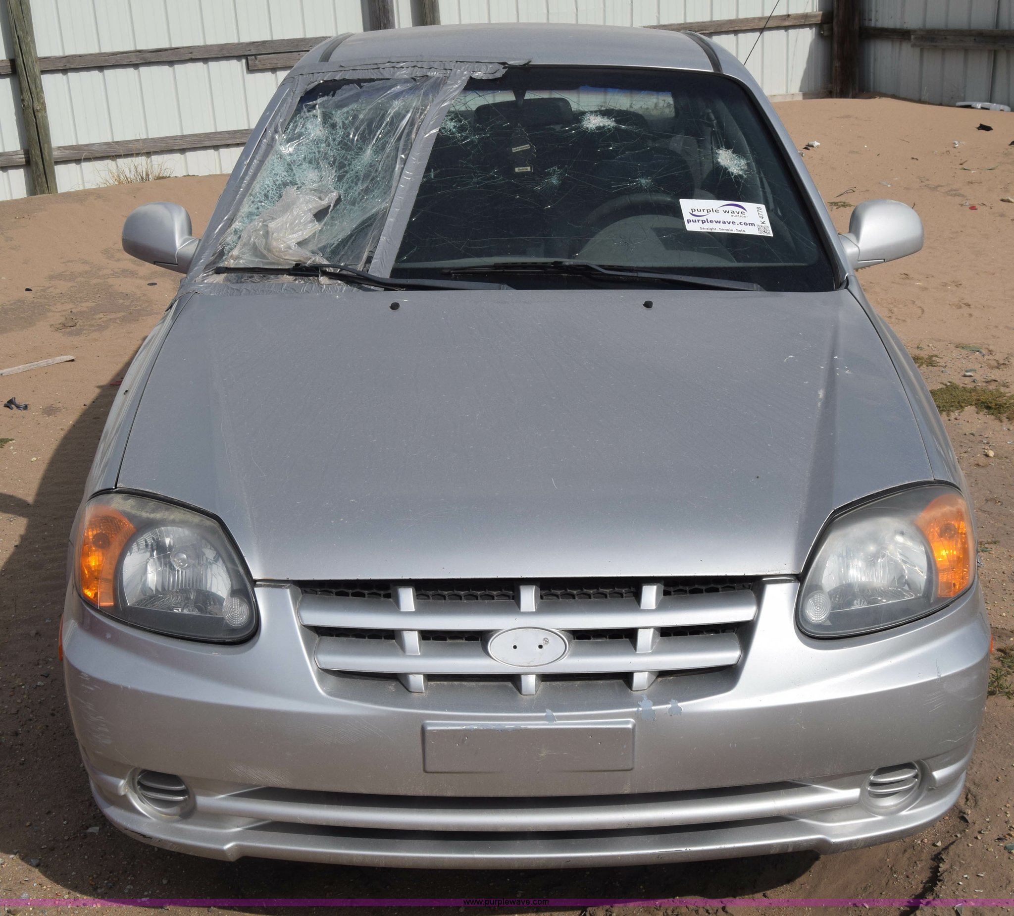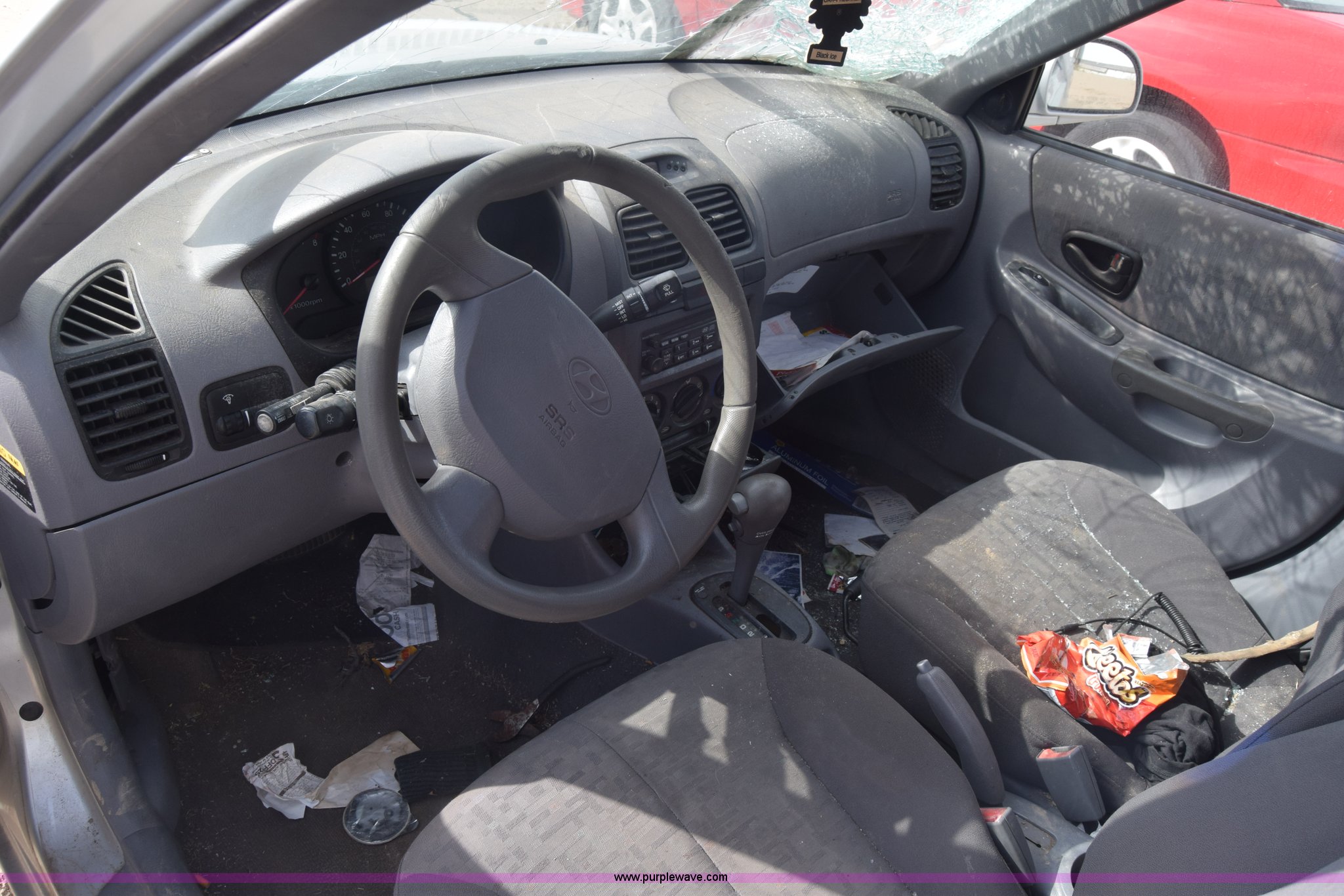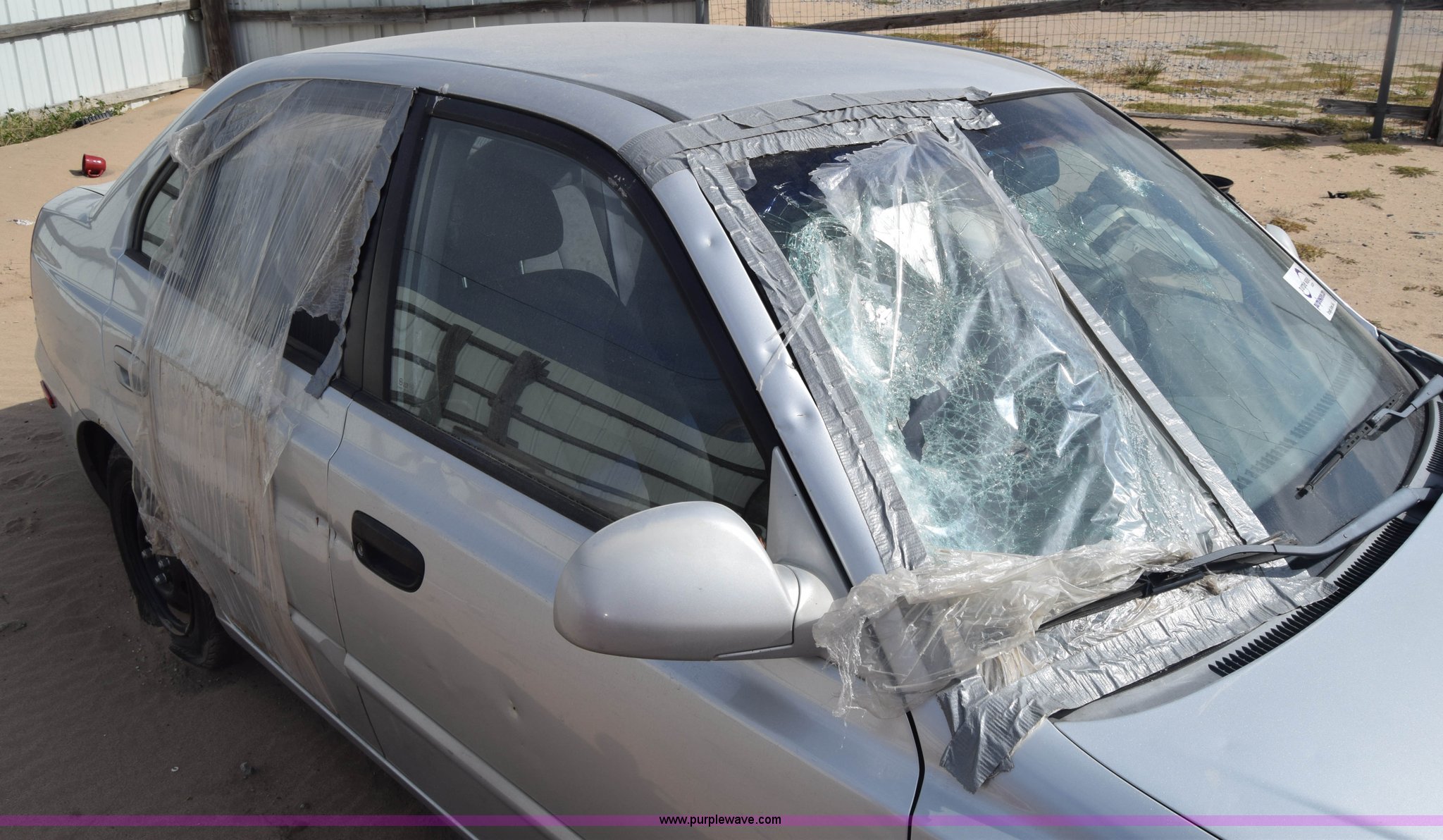 Purple Wave is selling a used Passenger Vehicle in Kansas. This item is a 2003 Hyundai Accent GL with the following: Unknown miles on odometer, 1.6L L4 DOHC 16V gas engine, Automatic transmission, AC and heat, Tilt, Cruise, AM/FM/CD, Power windows, locks, and mirrors, Cloth interior, 175/70R15 tires, Interior/exterior cosmetic damage, Windshield broken, Dents, Scratches, Rust, Tires flat, Case# 15C052465