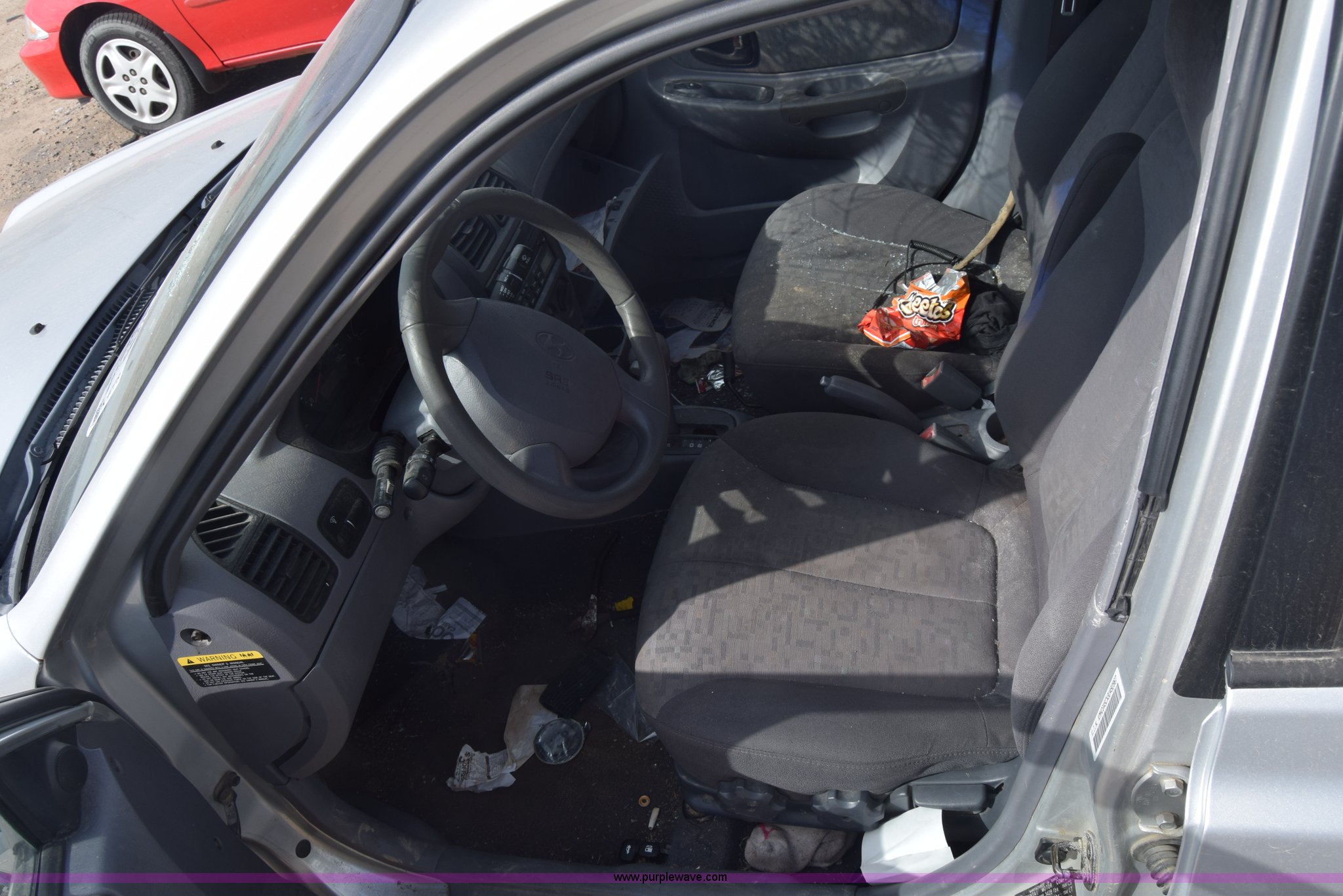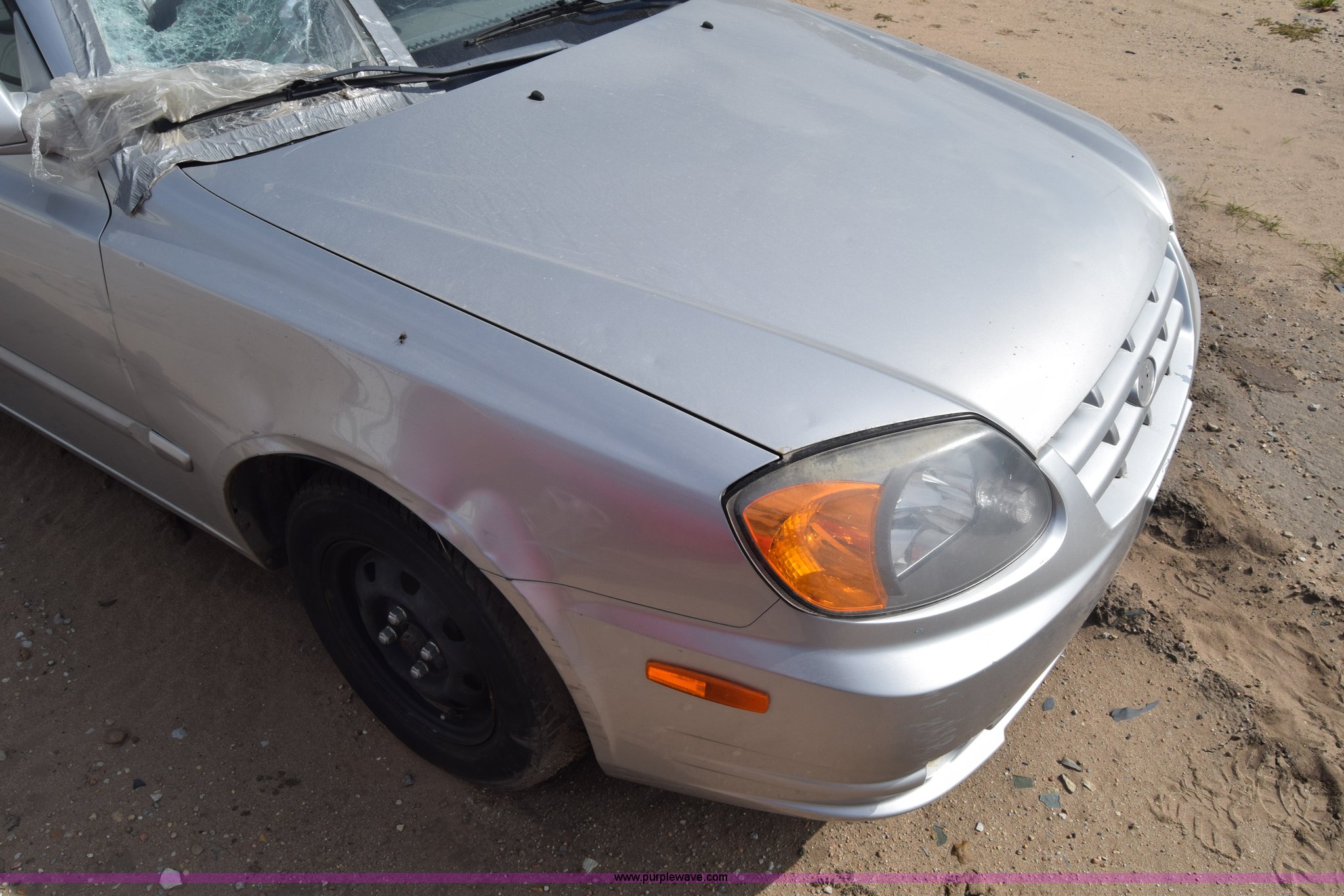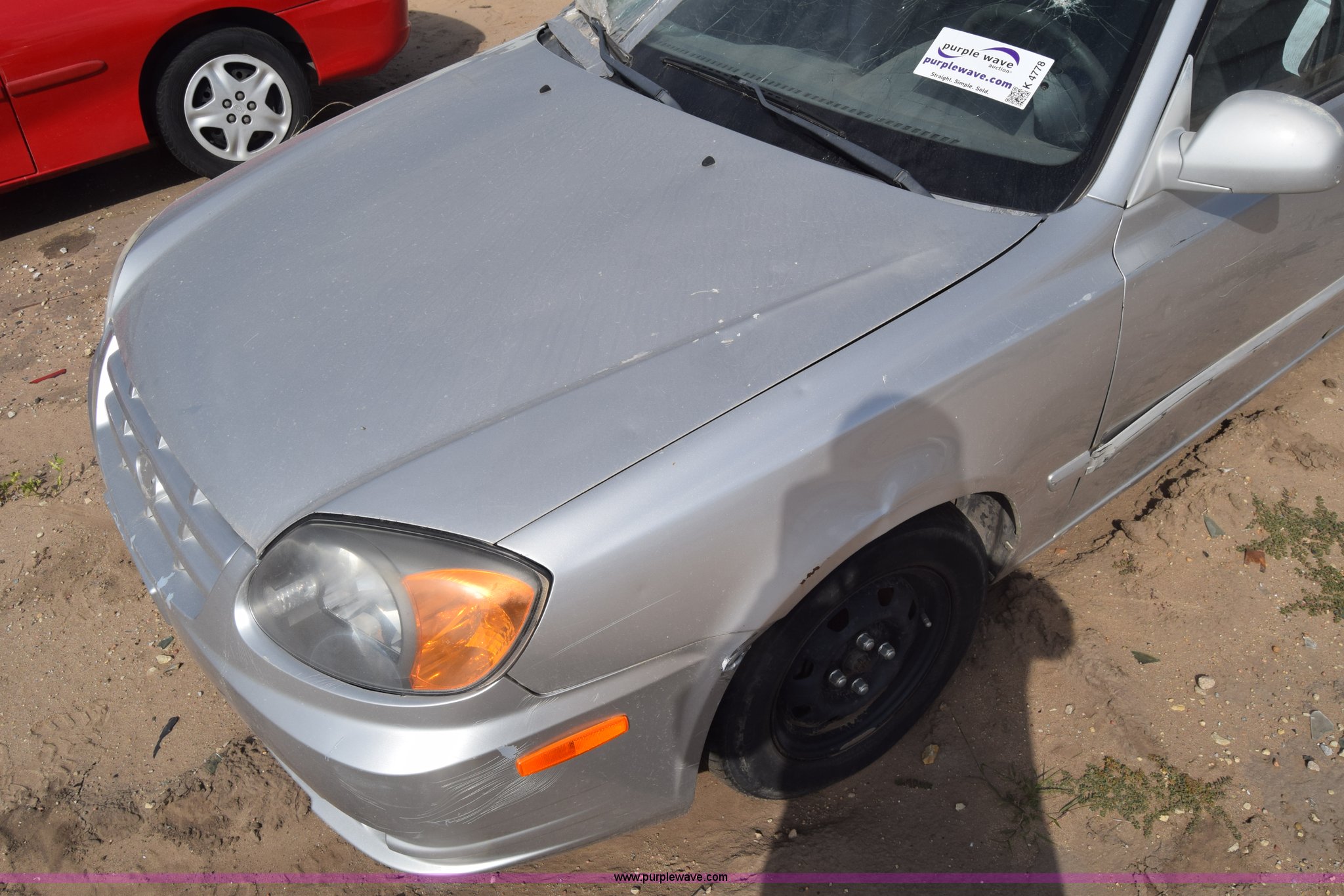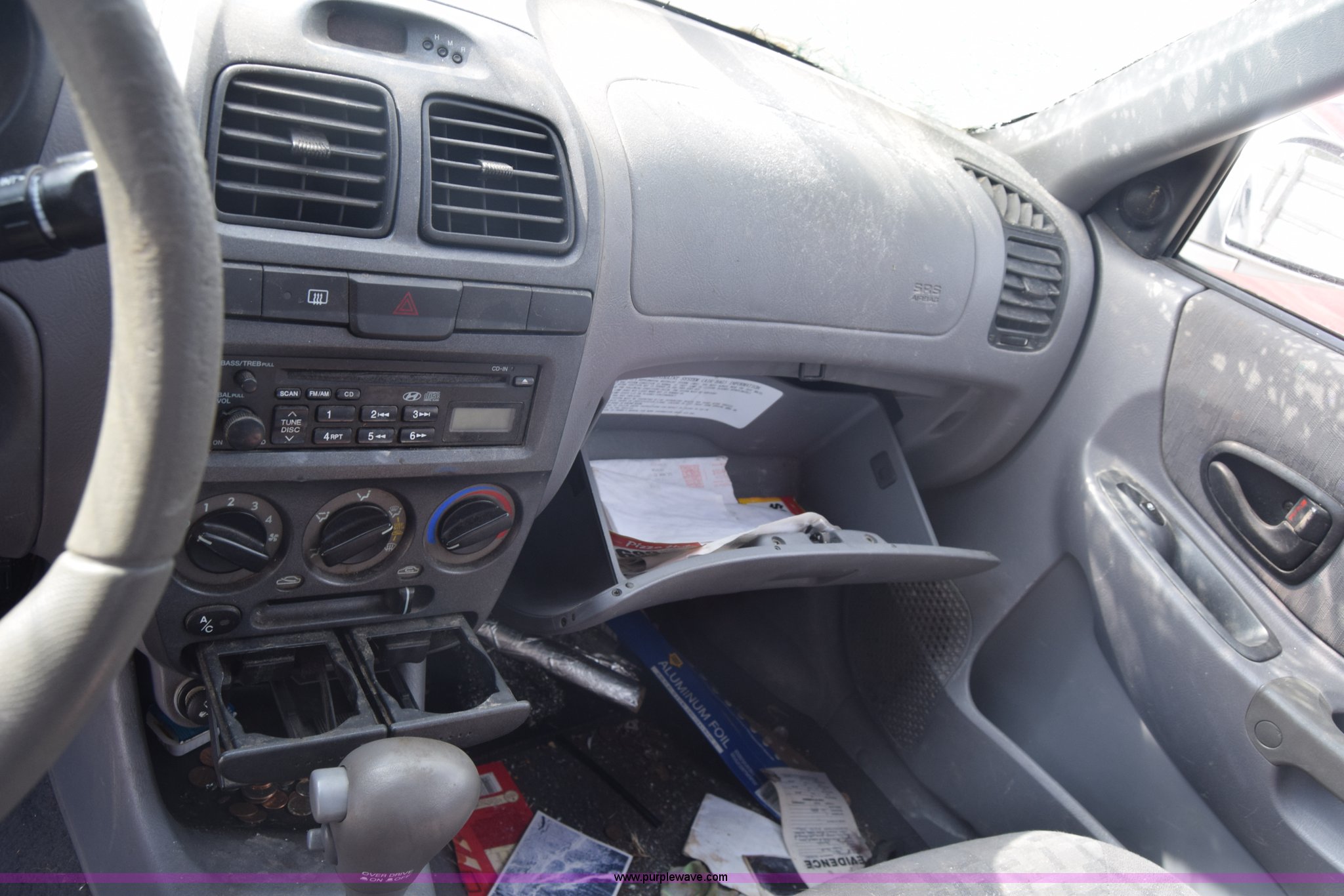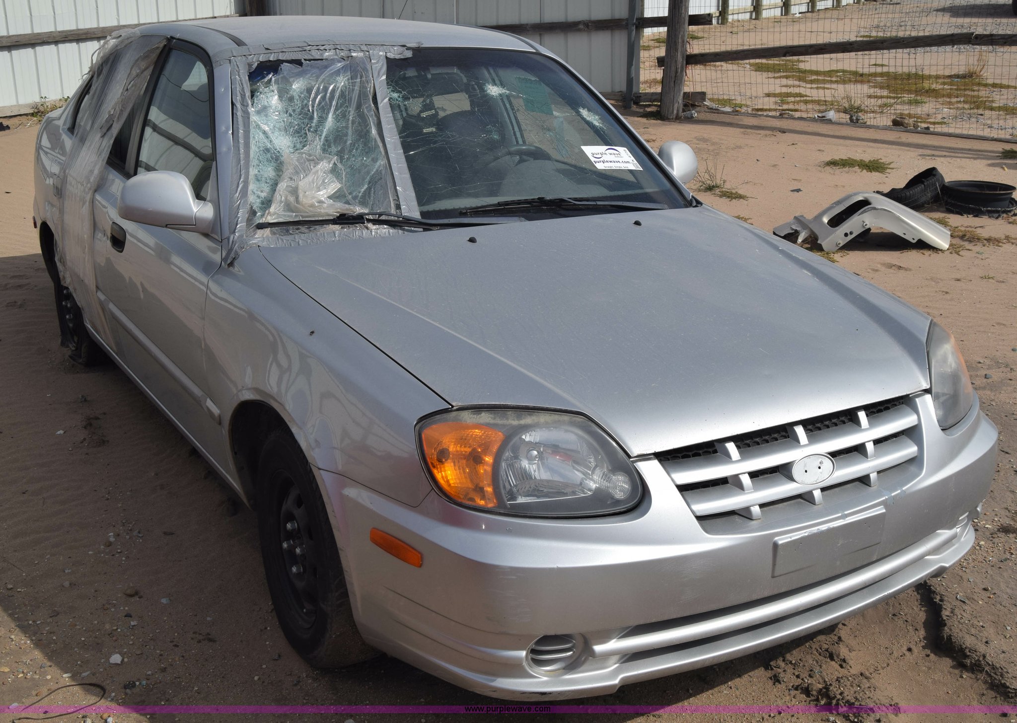 Purple Wave is selling a used Passenger Vehicle in Kansas. This item is a 2003 Hyundai Accent GL with the following: Unknown miles on odometer, 1.6L L4 DOHC 16V gas engine, Automatic transmission, AC and heat, Tilt, Cruise, AM/FM/CD, Power windows, locks, and mirrors, Cloth interior, 175/70R15 tires, Interior/exterior cosmetic damage, Windshield broken, Dents, Scratches, Rust, Tires flat, Case# 15C052465