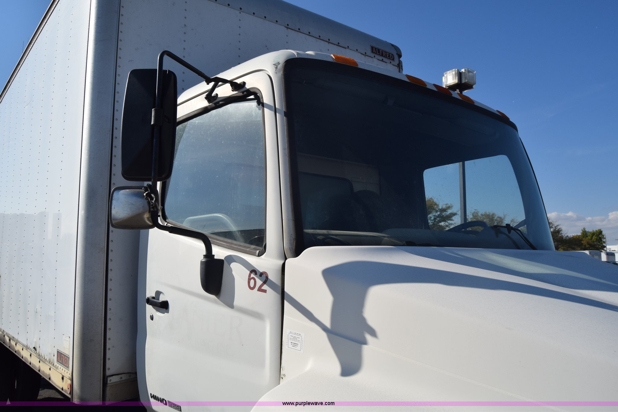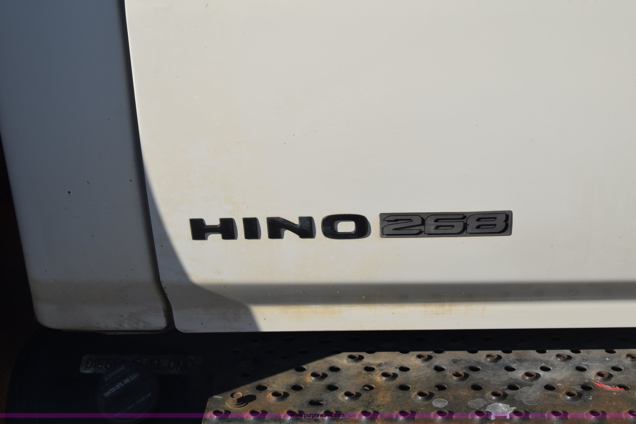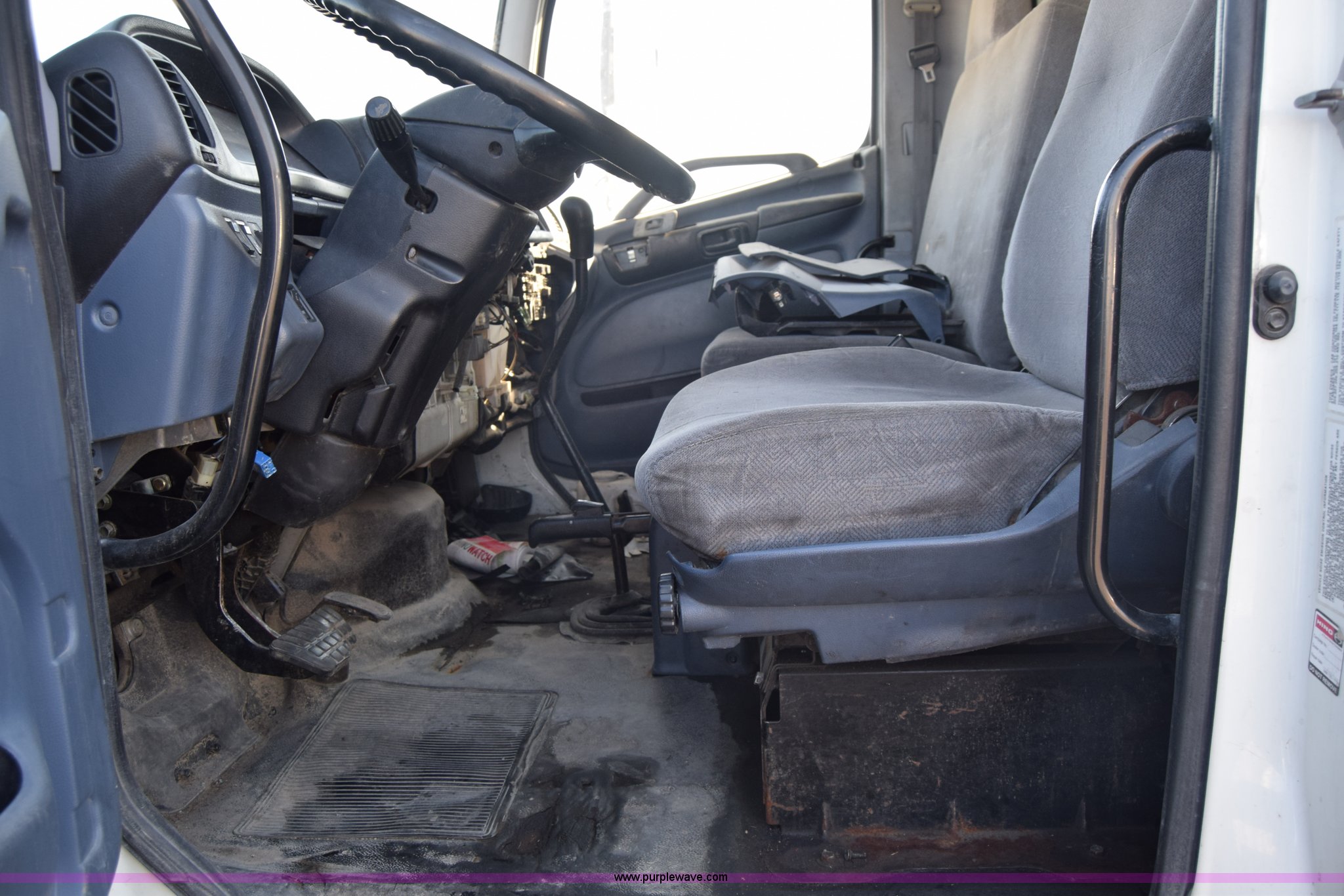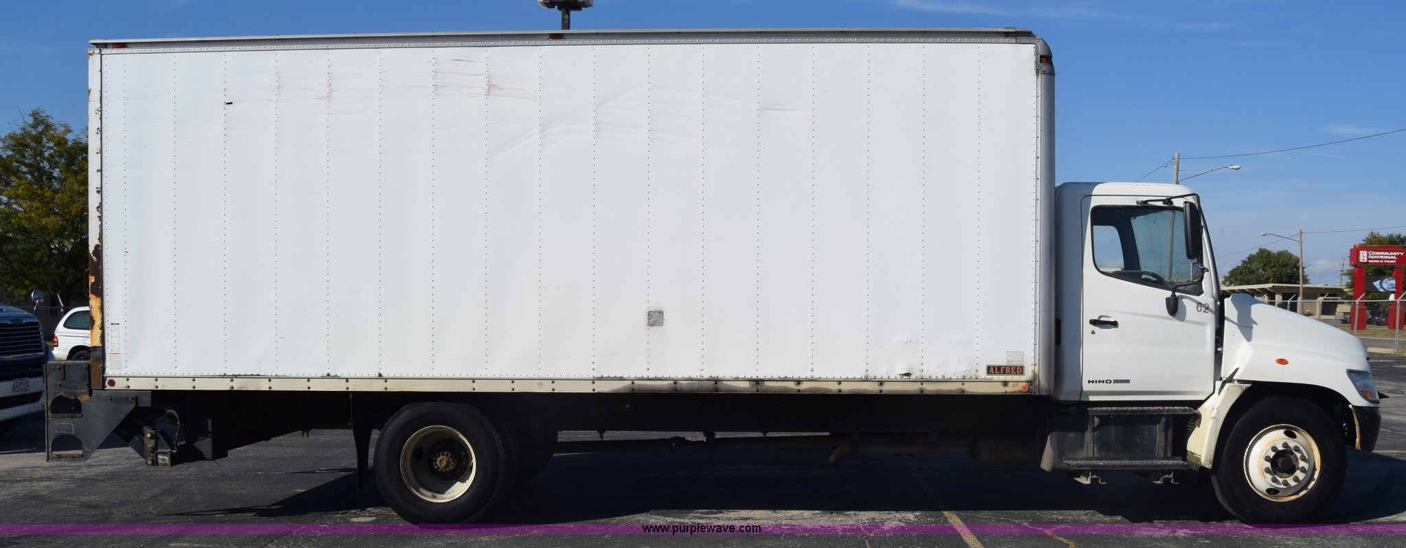 Purple Wave is selling a used Box Truck in Kansas. This item is a 2006 Hino 268 box truck with the following: 517,277 miles on odometer, Hino J08E 7.6L L6 diesel engine, Six speed manual transmission, Single axle, AC and heat, Cruise, AM/FM, Power windows, Suspension seat, Alfred box, 24'L x 102"W, Wood floor, Roll up rear door, Will not roll down all the way, Dock bumper, Sliding ramp, Dual fuel tanks, Spring suspension, Hydraulic brakes, 11R22.5 tires, GVWR 25,950 lbs, Interior/exterior cosmetic damage, Hood damage, Brakes are weak, Driver's side window will not roll up