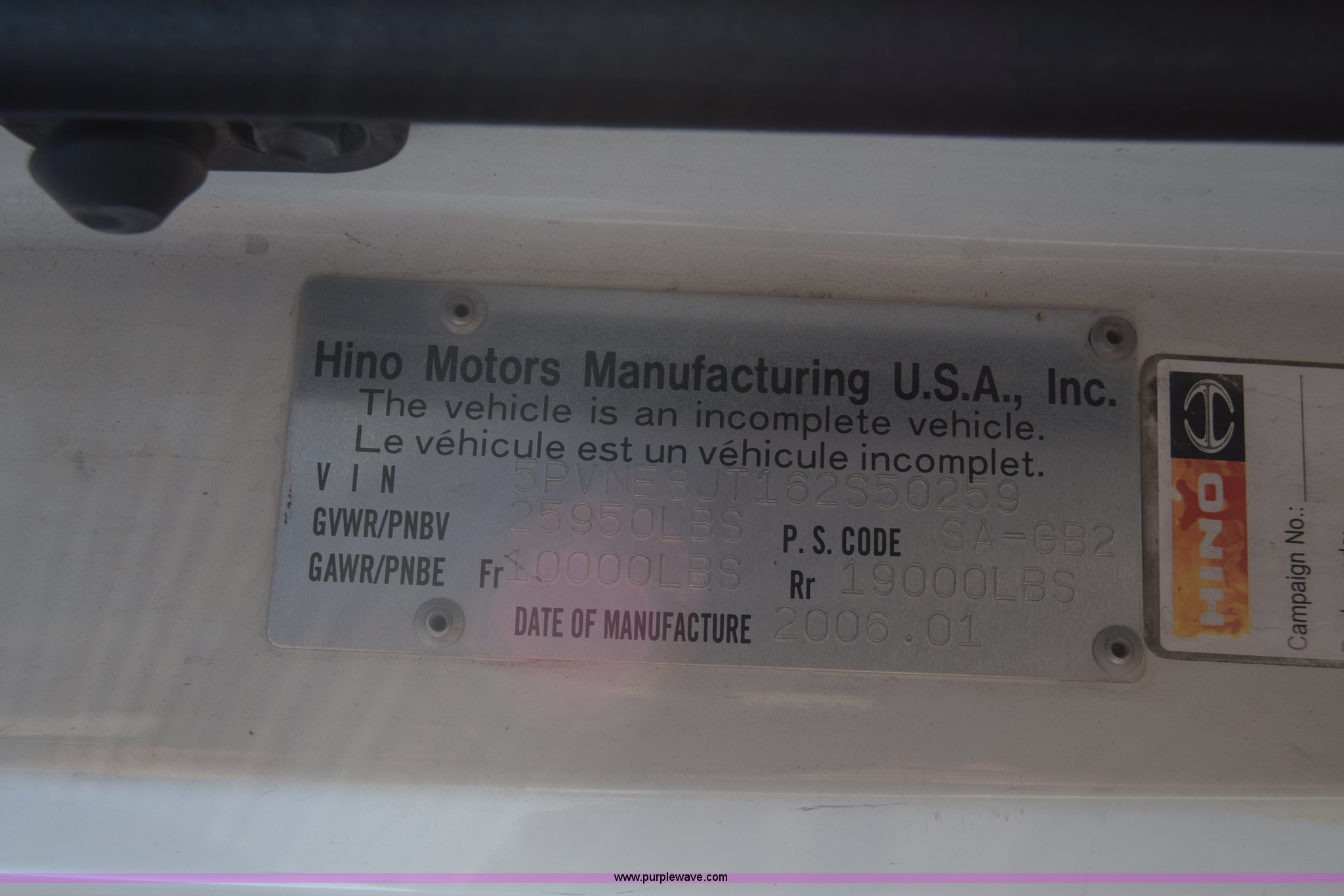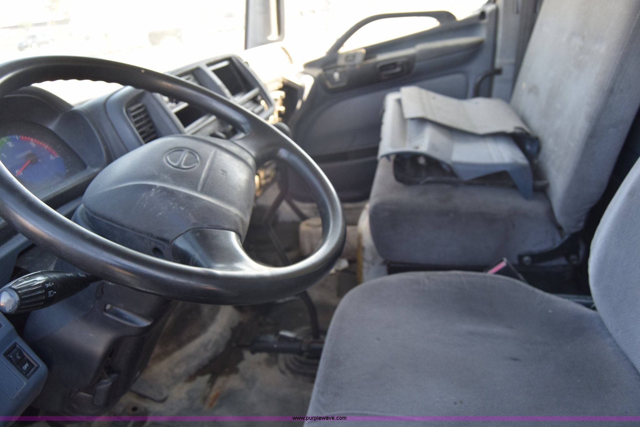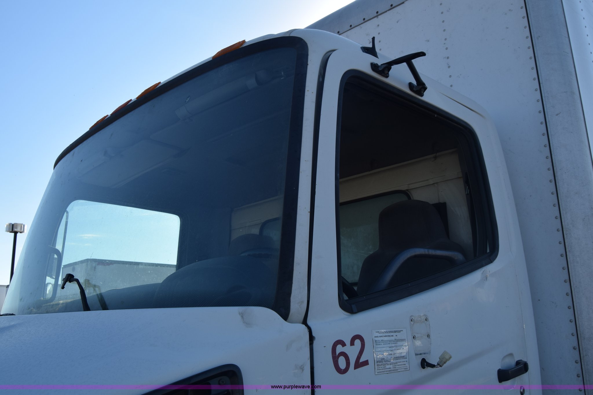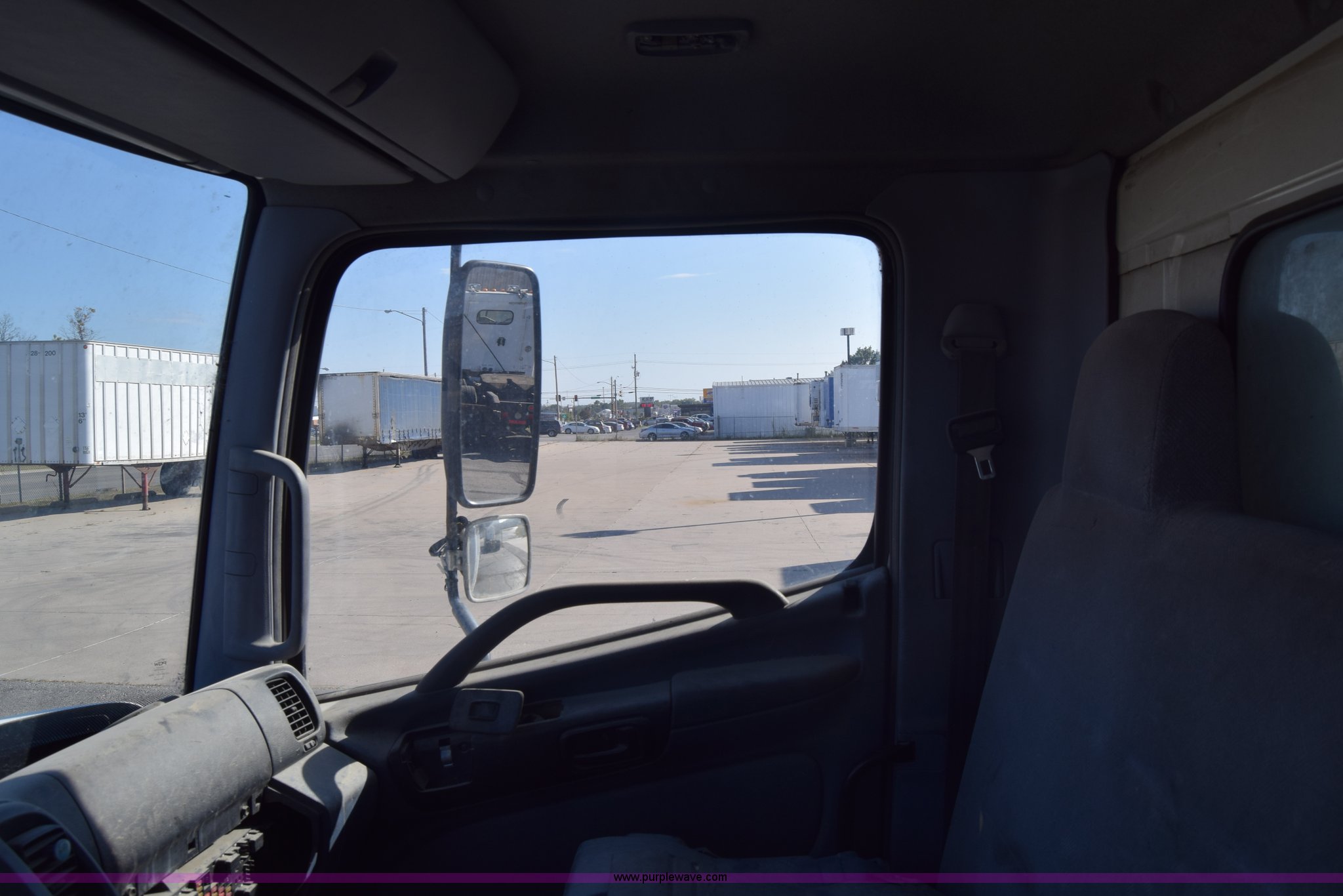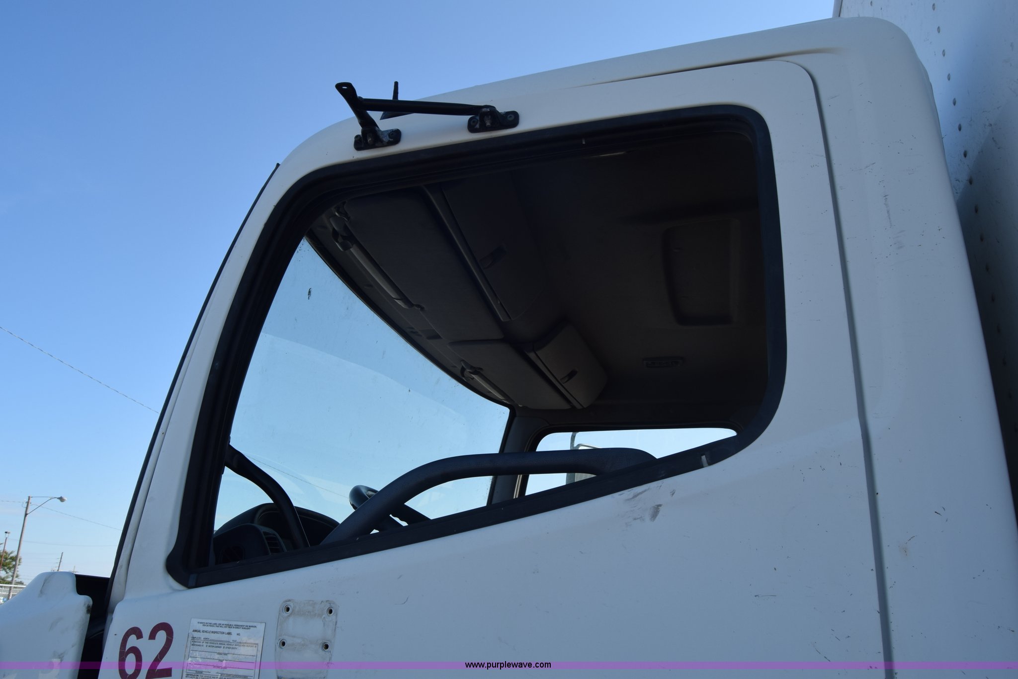 Purple Wave is selling a used Box Truck in Kansas. This item is a 2006 Hino 268 box truck with the following: 517,277 miles on odometer, Hino J08E 7.6L L6 diesel engine, Six speed manual transmission, Single axle, AC and heat, Cruise, AM/FM, Power windows, Suspension seat, Alfred box, 24'L x 102"W, Wood floor, Roll up rear door, Will not roll down all the way, Dock bumper, Sliding ramp, Dual fuel tanks, Spring suspension, Hydraulic brakes, 11R22.5 tires, GVWR 25,950 lbs, Interior/exterior cosmetic damage, Hood damage, Brakes are weak, Driver's side window will not roll up