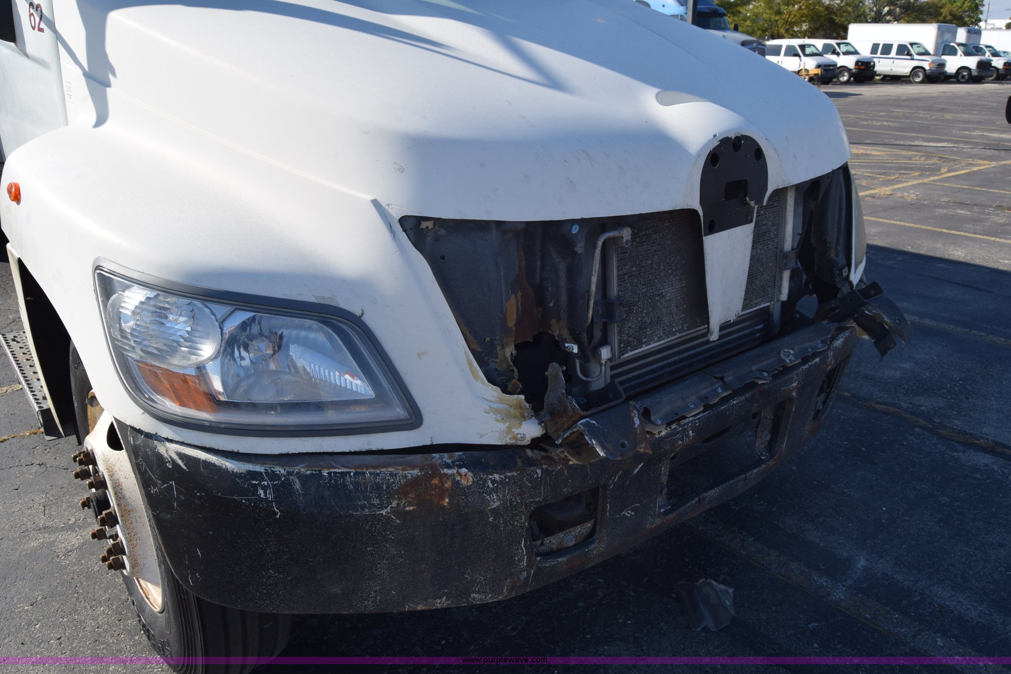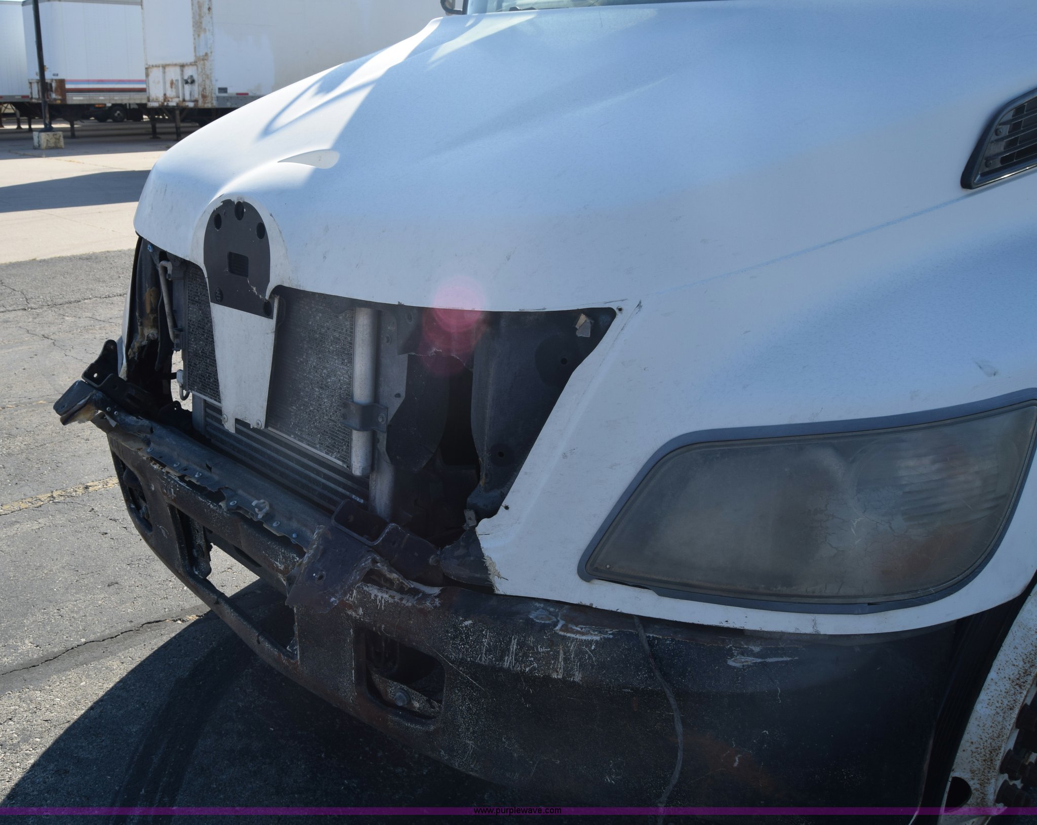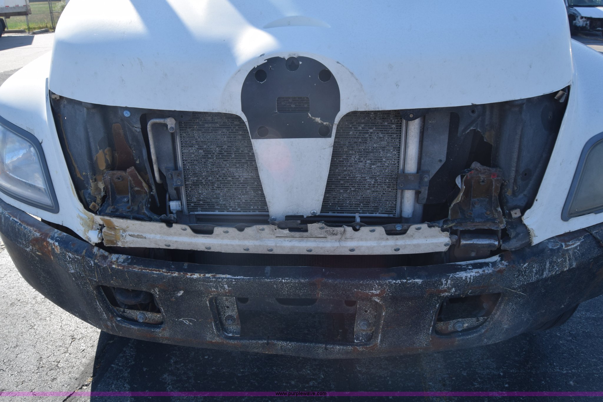 2006 Hino 268 box truck. 517,277 miles on odometer, Hino J08E 7.6L L6 diesel engine, Six speed manual transmission, Single axle, AC and heat, Cruise, AM/FM, Power windows, Suspension seat, Alfred box 24'L x 102"W, Wood floor, Roll up rear door Will not roll down all the way, Dock bumper, Sliding ramp, Dual fuel tanks, Spring suspension, Hydraulic brakes, 11R22.5 tires, GVWR 25,950 lbs, Interior/exterior cosmetic damage, Hood damage, Brakes are weak, Driver's side window will not roll up. 5PVNE8JT162S50259. Elite Transportation. 1401 Industrial. Emporia, KS 66801