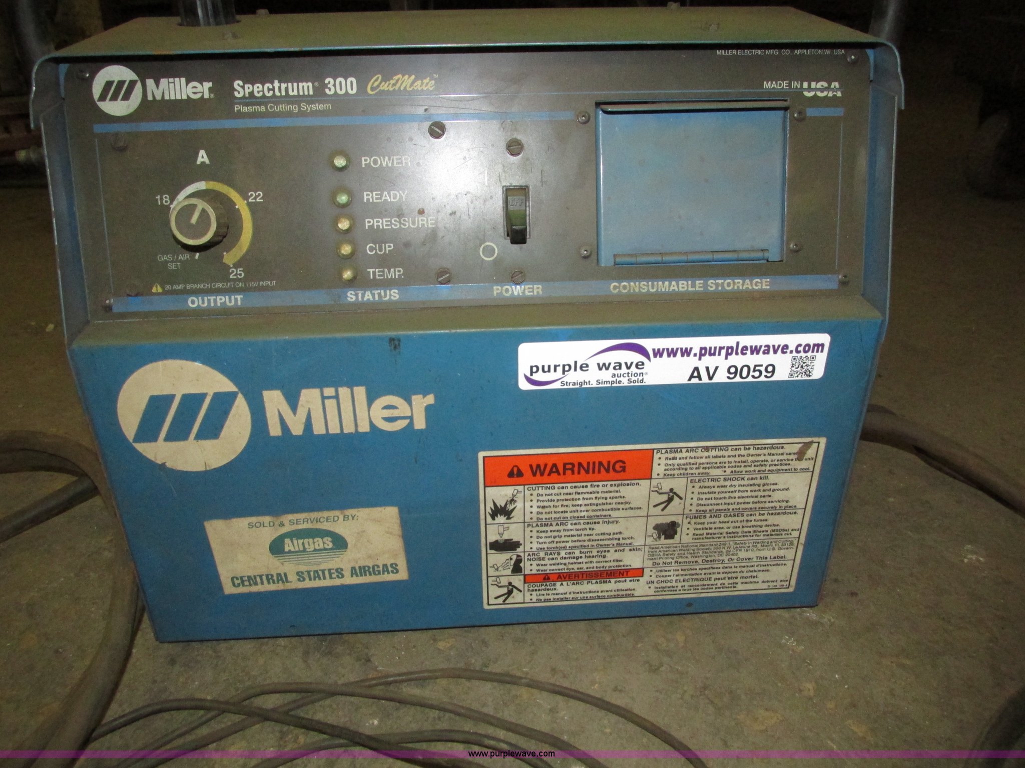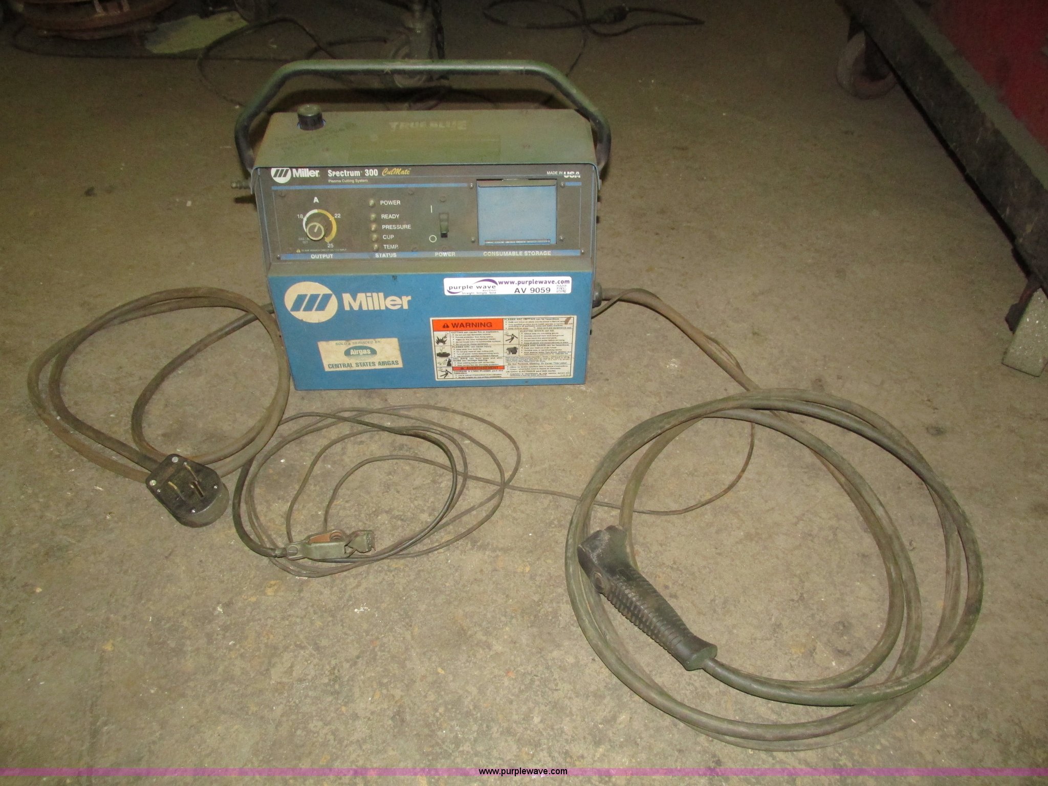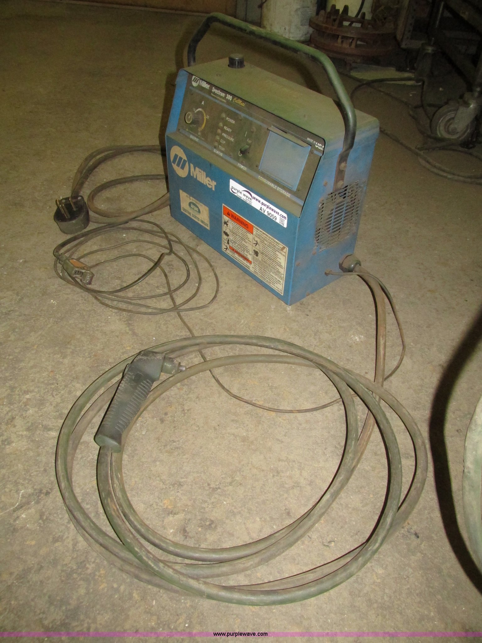 Purple Wave is selling a used Hand Held Plasma Cutter in Iowa. This item is a Miller Spectrum 300 plasma cutter with the following: Approx. 15' electrical cord, Negative cable with clamp, 8' electrical cord with three prong dryer plug, Serial KG066307