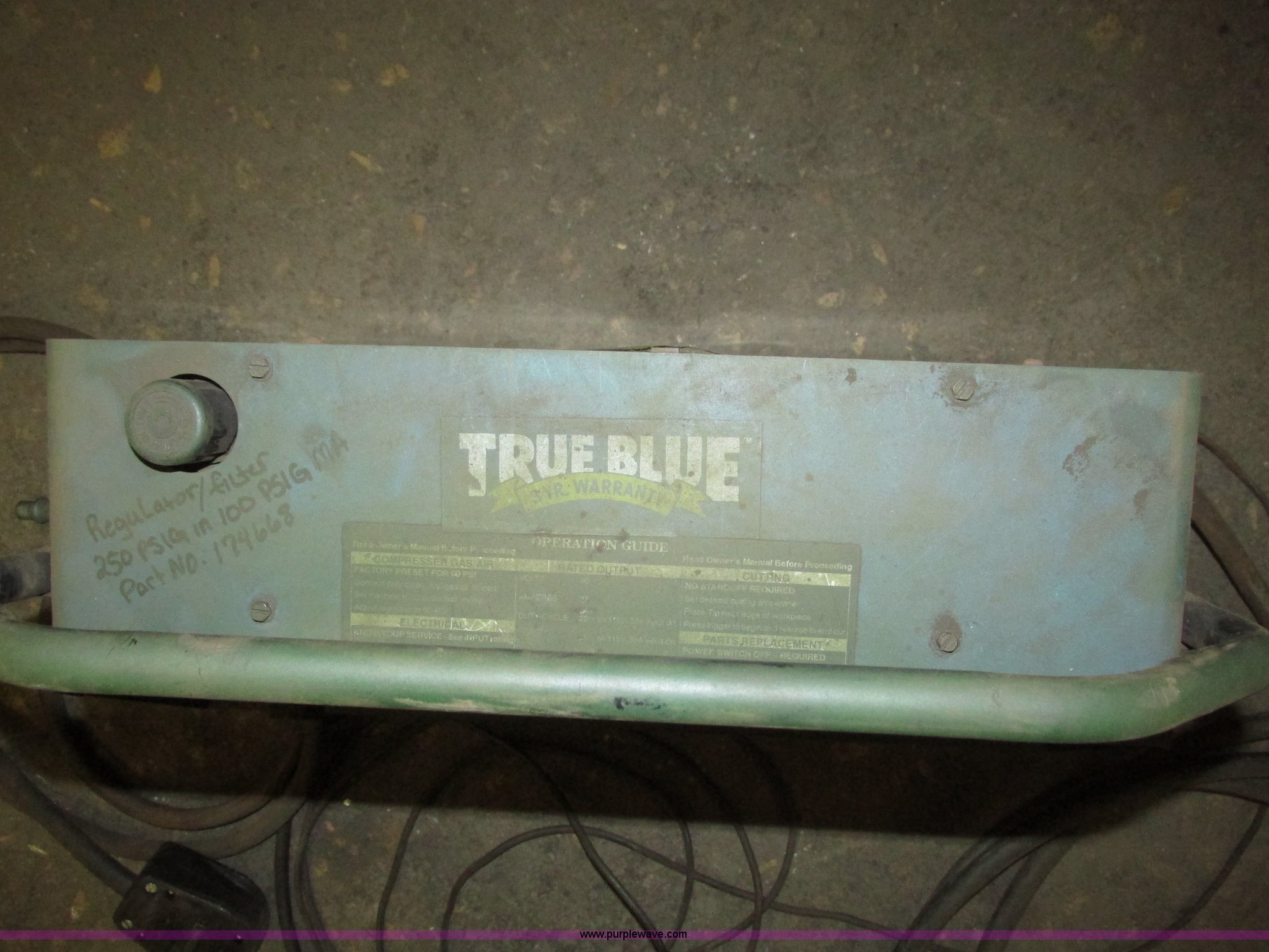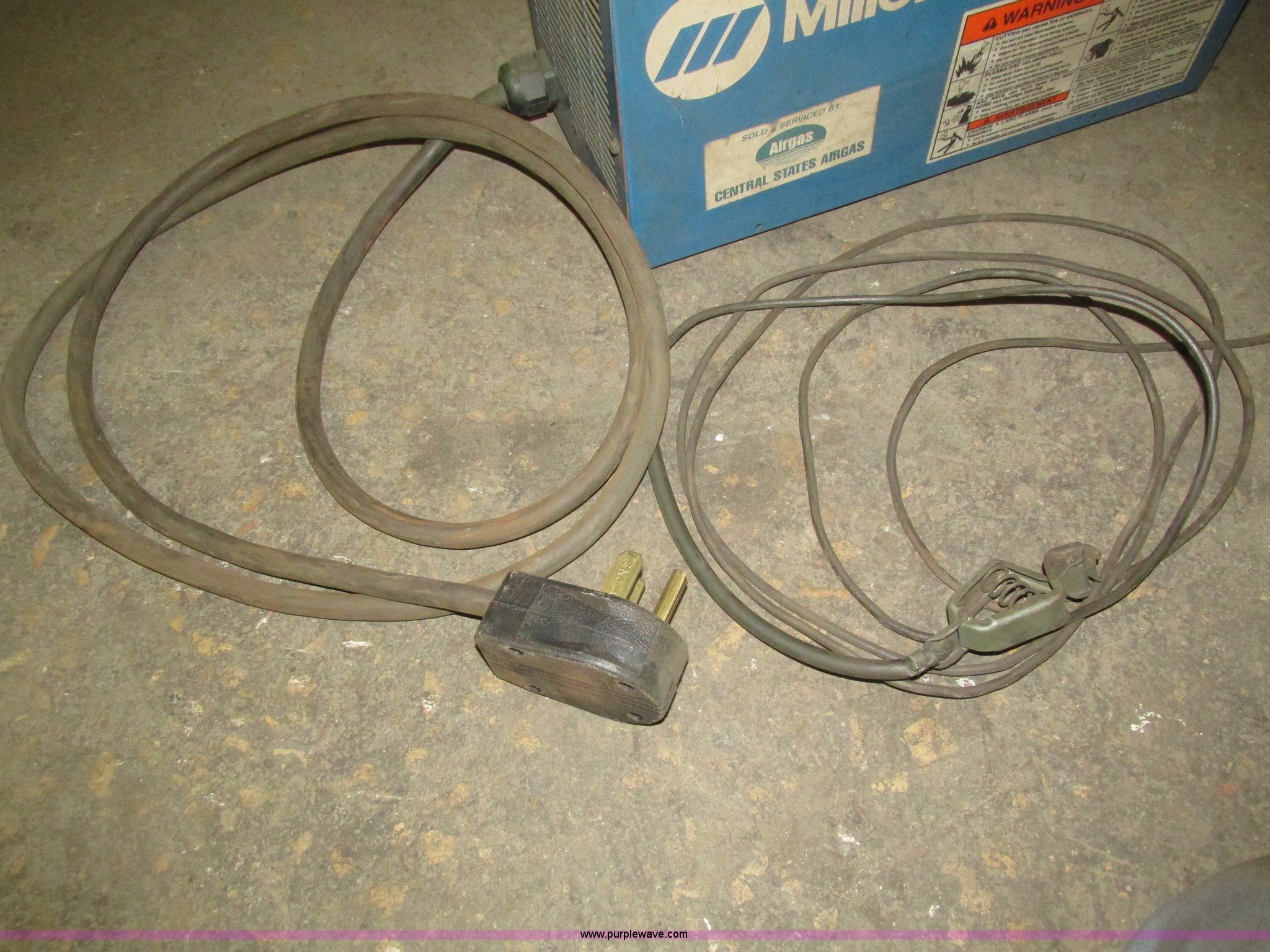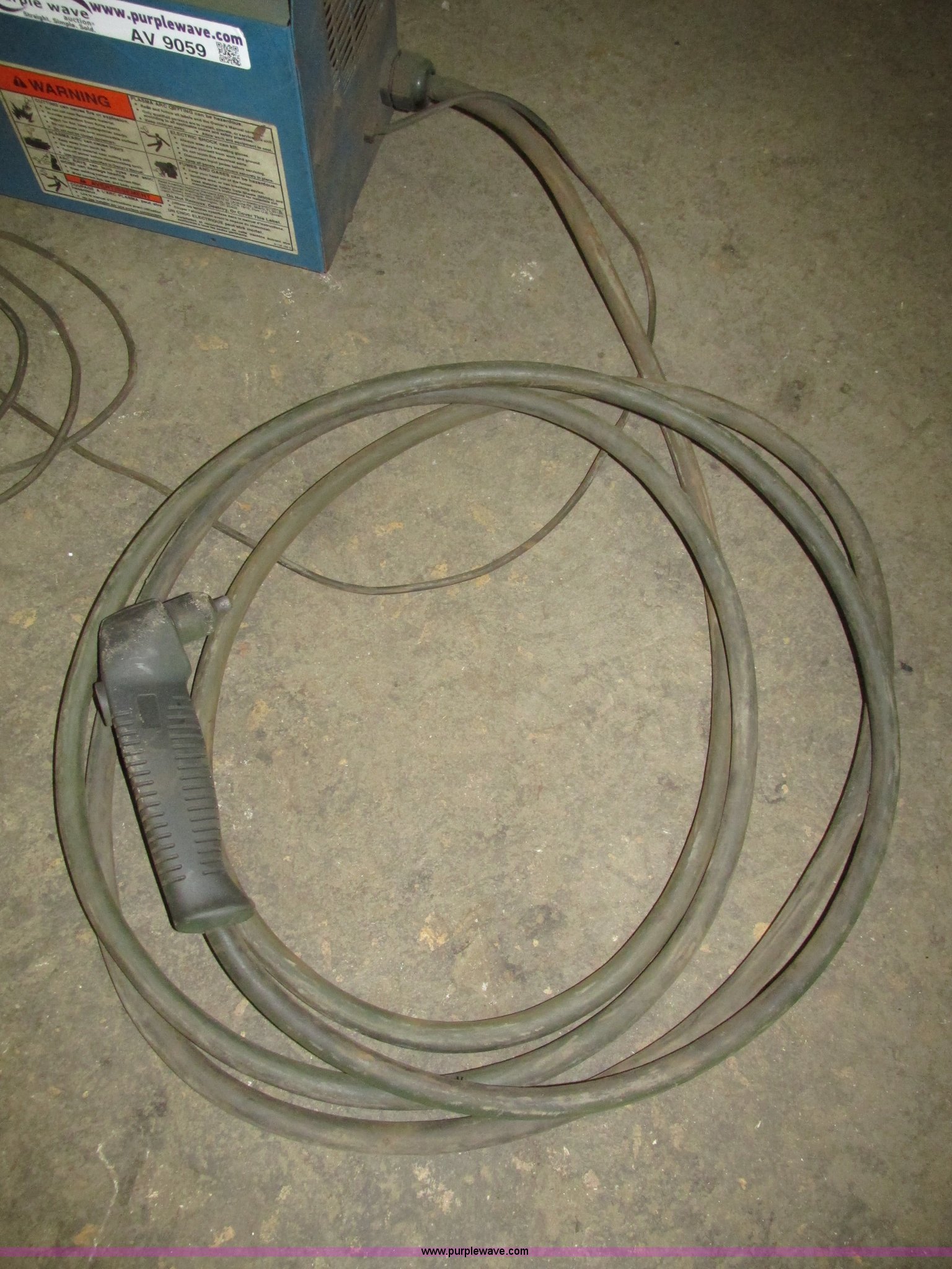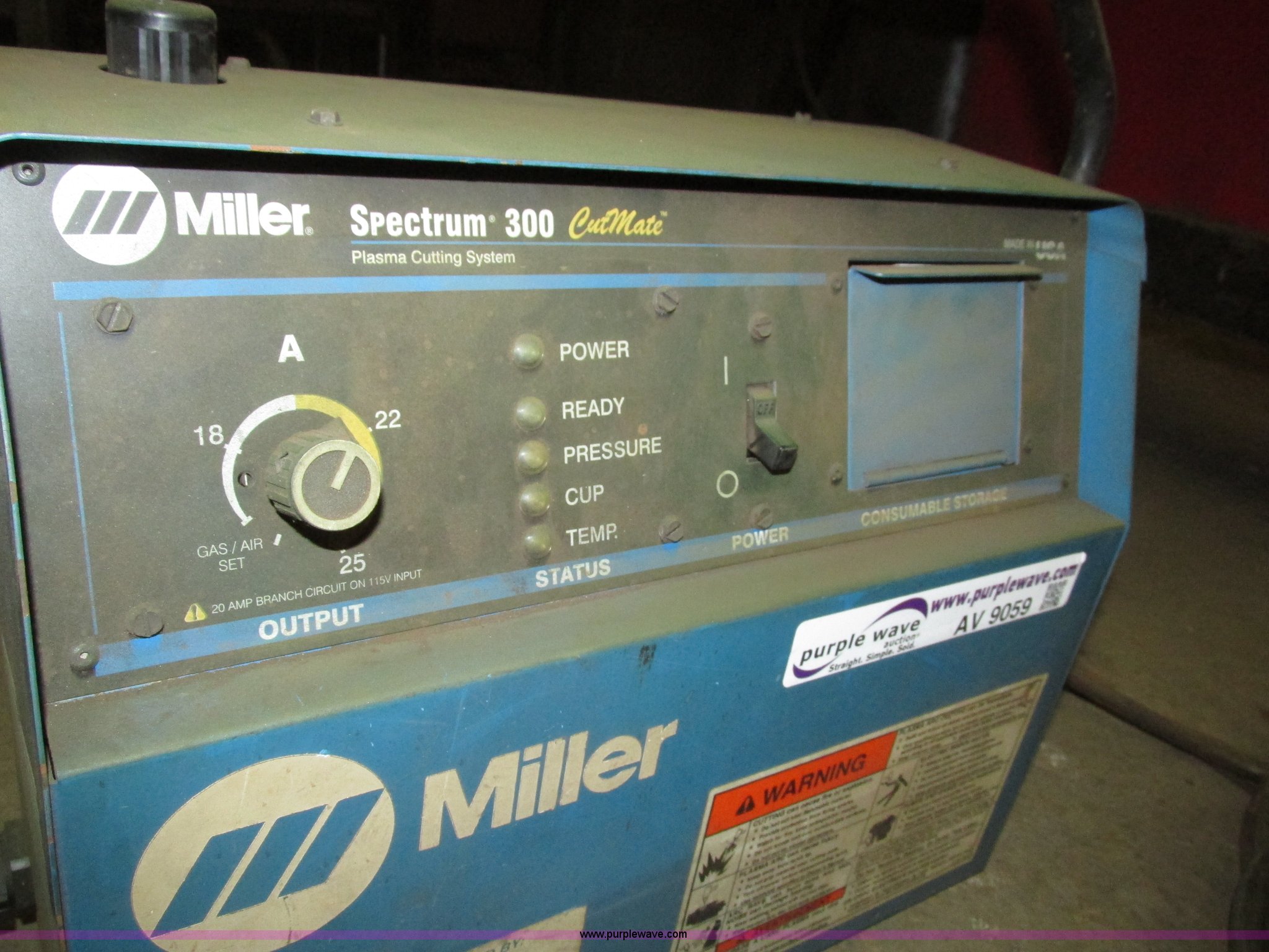 Purple Wave is selling a used Hand Held Plasma Cutter in Iowa. This item is a Miller Spectrum 300 plasma cutter with the following: Approx. 15' electrical cord, Negative cable with clamp, 8' electrical cord with three prong dryer plug, Serial KG066307