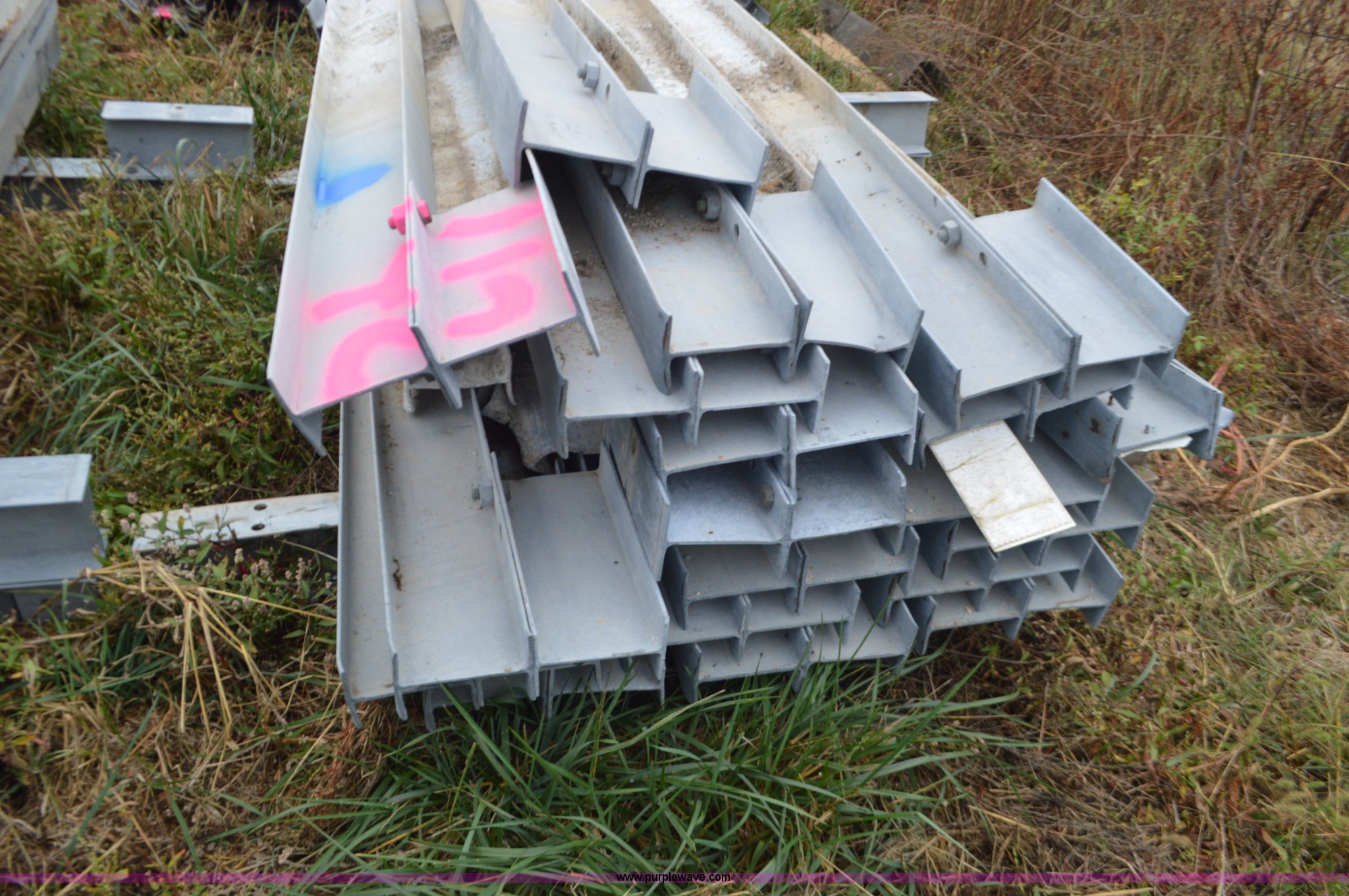 Approximately 42 galvanized guard rail posts. 72" x 6" x 4", 13" x 4" x 6" bolt-on side piece. McQuitty Trucking. 96 NW 1400 Road. Chilhowee, MO 64733