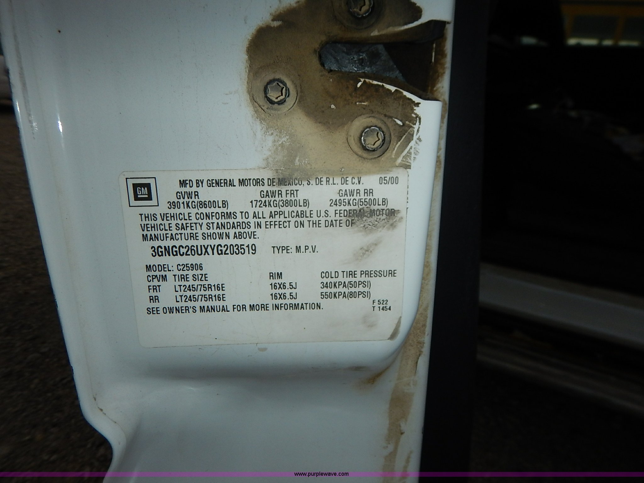 Purple Wave is selling a used Passenger Vehicle in Kansas. This item is a 2000 Chevrolet Suburban C2500 SUV with the following: 245,684 miles on odometer, 6.0L V8 OHV 16V gas engine, Automatic transmission, AC and heat, Tilt, AM/FM, Manual windows and locks, Vinyl interior, Running boards, Receiver hitch, Trailer wiring, 245/75R16 tires, Interior/exterior cosmetic damage, Paint peeling/chipping, Rust