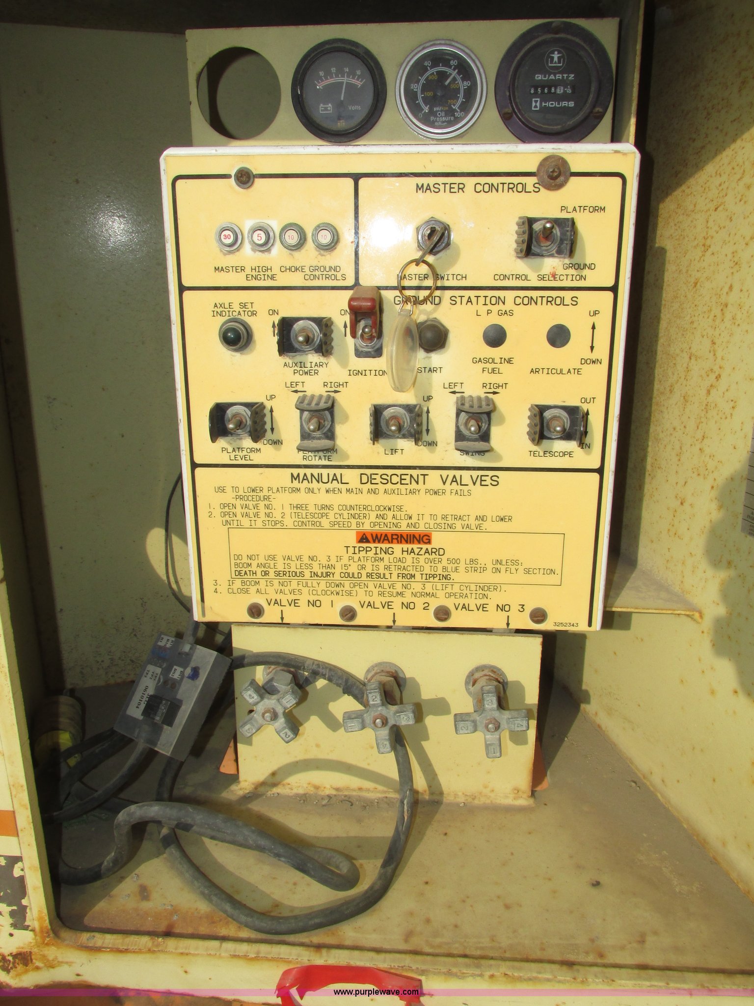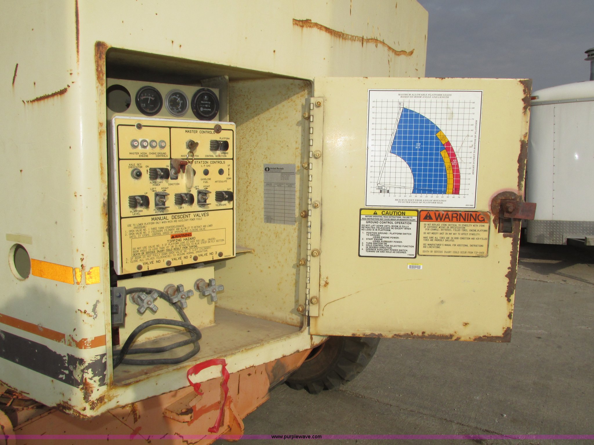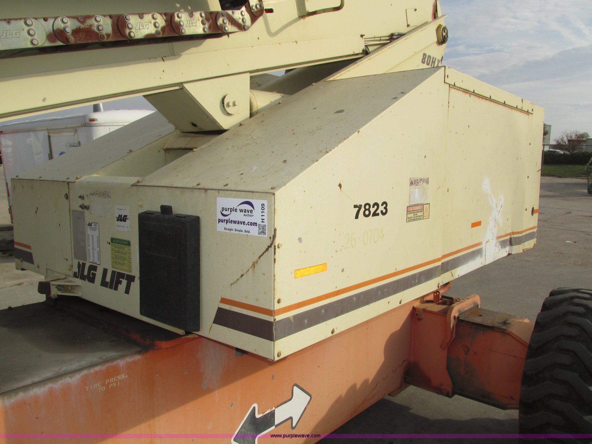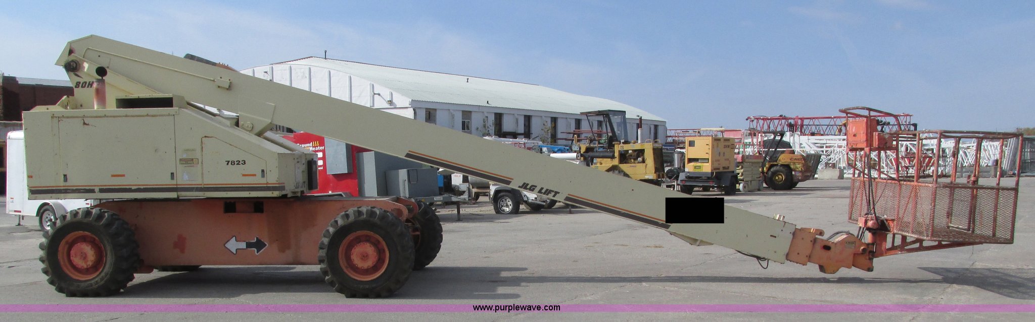 Purple Wave is selling a used Boom Lift in Nebraska. This item is a JLG 80HX boom lift with the following: 8,570 hours on meter, Deutz four cylinder diesel engine, Four wheel drive, 500 lbs maximum lift capacity, 1,000 lbs restricted capacity, 70'7" maximum reach length, 80' maximum lift height, 96" x 36" x 43.5"H platform, Platform and ground controls, AC power outlet, Platform rotation, Rear emergency valves, Load/reach chart, Extendable axles, 15 x 19.5 tires, Axles have difficulty extending and retracting under their own power, Serial 0149410300020486, Unit# 7823