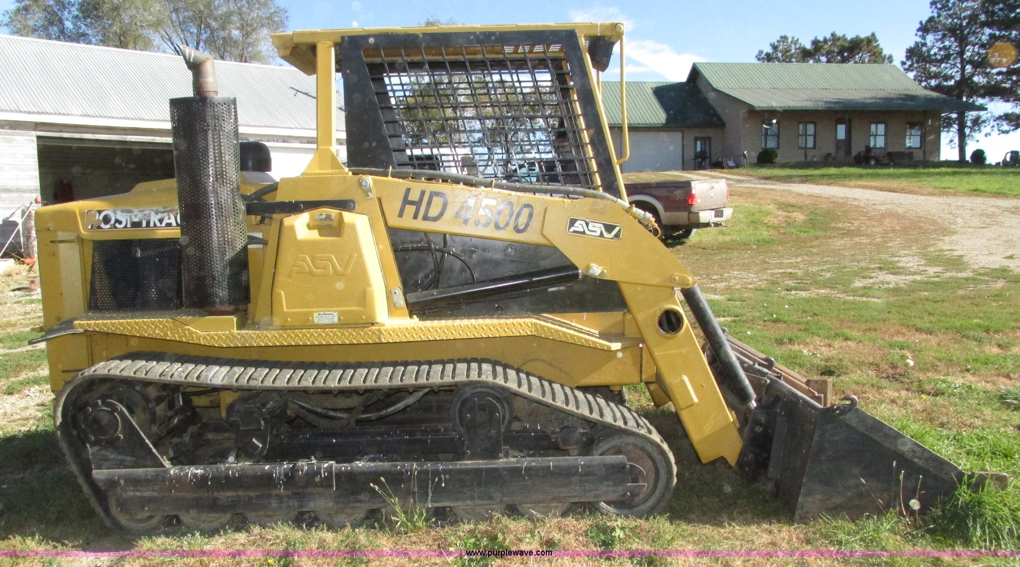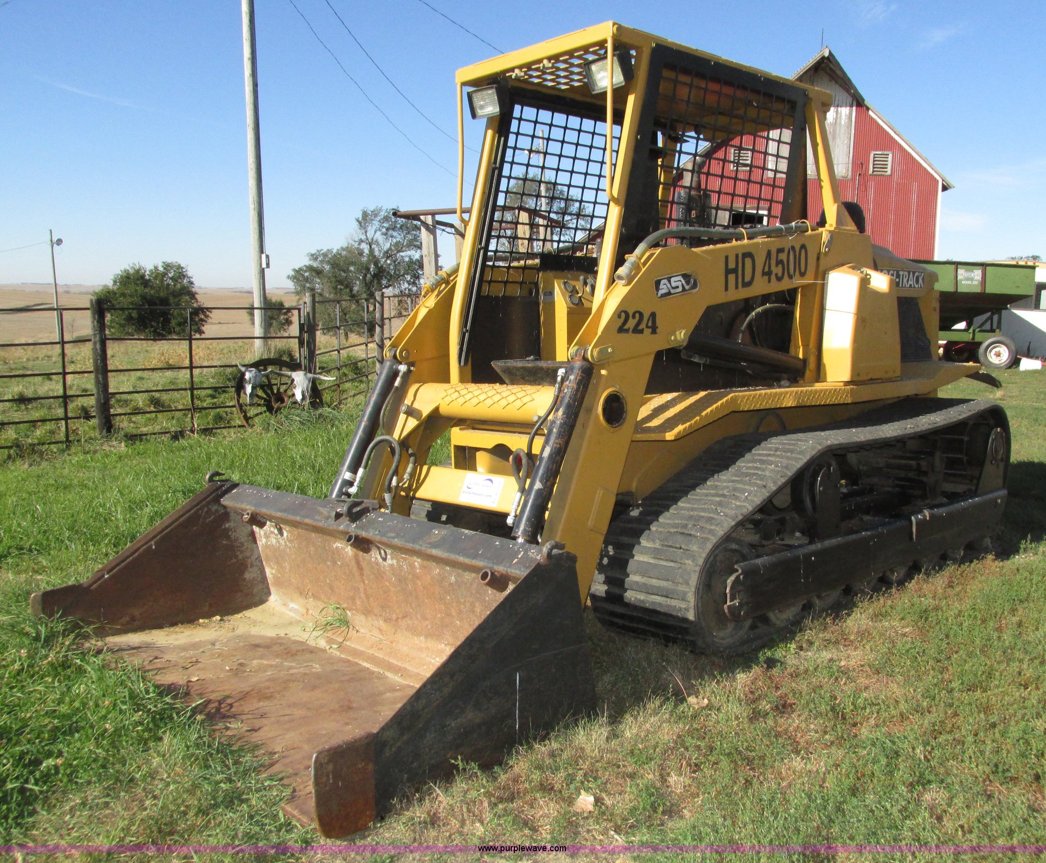Purple Wave is selling a used Tracked Skid Steer Loader in Nebraska. This item is a 1999 ASV HD4500 Posi-Track skid steer with the following: 1,700 hours on meter, John Deere 4045D778884 4.5L four cylinder diesel engine, Hydrostatic transmission, Open station/canopy, Joystick controls, Front work lights, 72"W low profile bucket, Weld-on smooth cutting edge, Front mounted PTO, (2) front hydraulic remotes, Seven bottom rollers, 18"W tracks, 2,000 lbs capacity, 8,500 lbs. base operating weight, Crack in bottom of bucket, Unit runs, but will not move, One side locked up, Drive shaft disconnected, Serial HD07670AWWD
