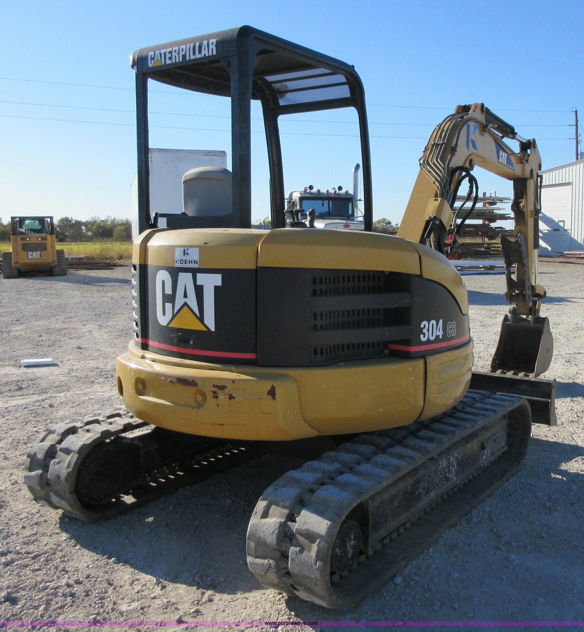 2005 Caterpillar 304CR mini excavator. 1,837 hours on meter, Mitsubishi four cylinder diesel engine, Hydrostatic transmission, OROPS, Suspension seat, Front work lights, Standard boom, 54" stick length, Two-way auxiliary hydraulics, Manual thumb, Caterpillar 20"W bucket (5) bolt-on teeth, 0.13 cu. yd. capacity, Caterpillar 12"W bucket (3) bolt-on teeth, 0.07 cu. yd. capacity, 78" backfill blade, 16"W rubber tracks, 9,896 lbs. base operating weight, Serial NAD03772. View equipment video. Koehn Building Systems, LLC. 1111 N 2nd. Fredonia, KS 66736