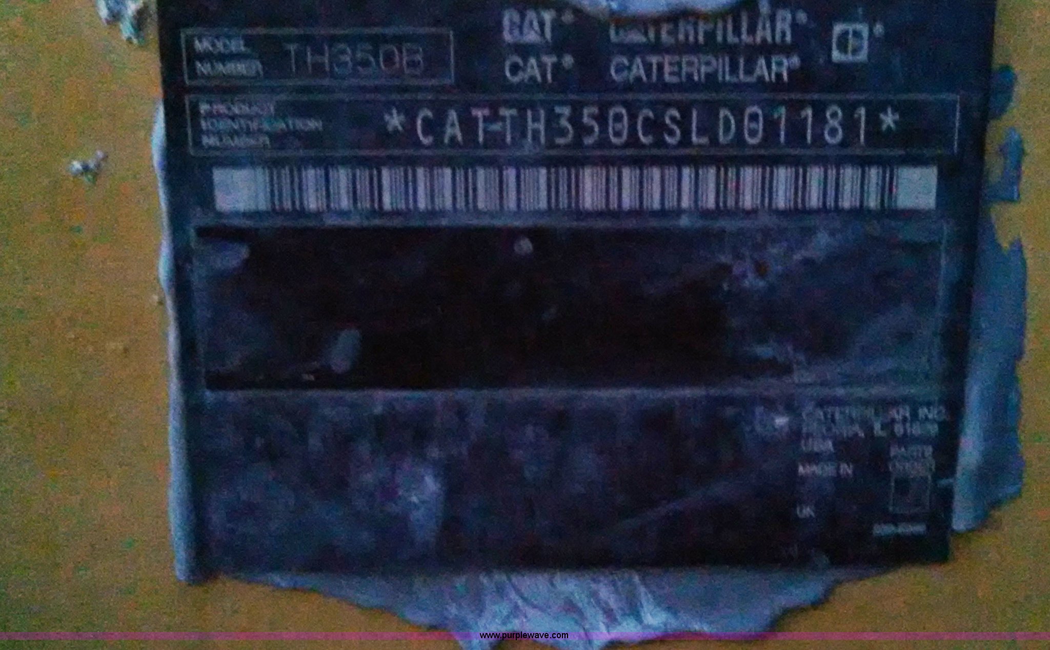 Purple Wave is selling a used Telehandler in Missouri. This item is a 2005 Caterpillar TH350B telehandler with the following: 4,414 hours on meter, Caterpillar four cylinder diesel engine, 4F-4R gears, Four wheel drive, Crab steer, Circle steer, 6,600 maximum lift capacity, 4'L x 4"W x 2" thick forks, Adjustable width forks, 4' maximum width, Quick attach, Tilt carriage, Hydraulic leveling, Auxiliary hydraulics, Hydraulic outriggers, 13-24 tires, 18,700 lbs. base operating weight, Serial CAT-TH350CSLD01181