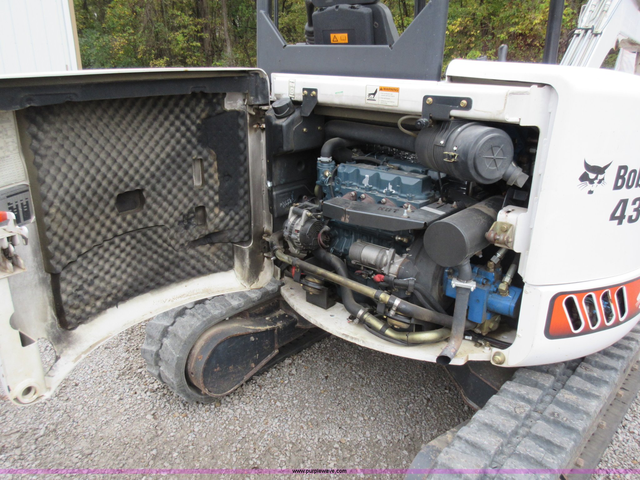 Purple Wave is selling a used Mini Excavator in Missouri. This item is a 2008 Bobcat 430G ZHS compact excavator with the following: 1,140 hours on meter, Kubota V2403-M-D1-ET03 2.4L four cylinder diesel engine, Hydrostatic transmission, Joystick controls, Foot control, 47" stick length, 12"W bucket, One way auxiliary hydraulics, 70"W backfill blade, 11.5"W rubber tracks, Serial AACF11046