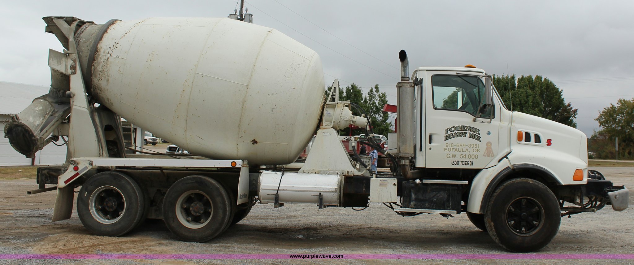 Purple Wave is selling a used Ready Mix or Pump Truck in Oklahoma. This item is a 2000 Sterling A9500 mixer truck with the following: 576,438 miles on odometer, Cummins M11 diesel engine, Eaton Fuller 10 speed manual transmission, Tandem axle, AC and heat, Heated mirrors, Air suspension seat, Backup alarm, 10.5 cubic yard mixer, Steel chutes, 150 gallon water tank, Single rear exhaust stack, Single fuel tank, Spring over walking beam suspension, Air brakes, GVWR 66,000 lbs, FAWR 20,000 lbs, IAWR 23,000 lbs, RAWR 23,000 lbs, Unit# 5