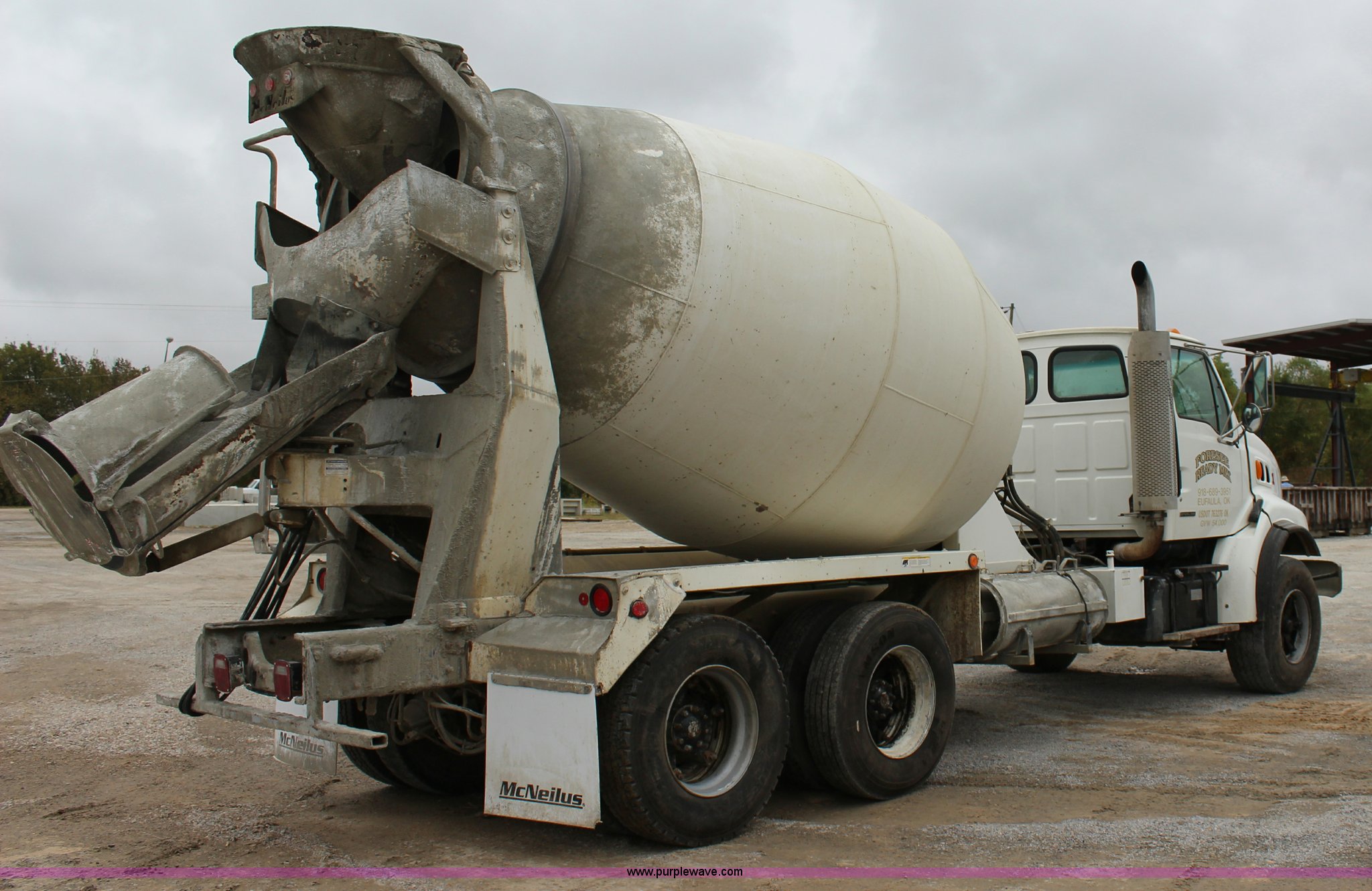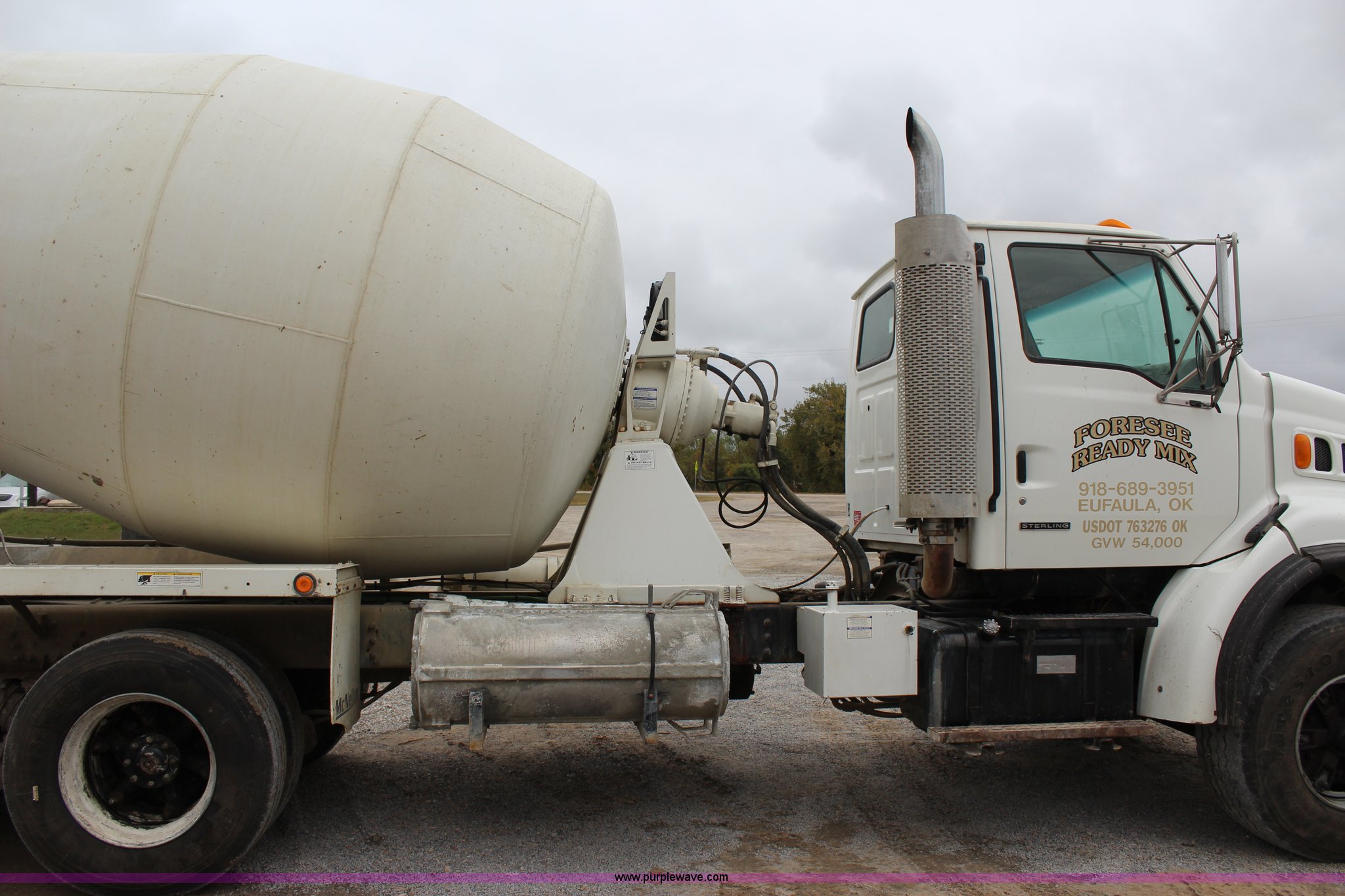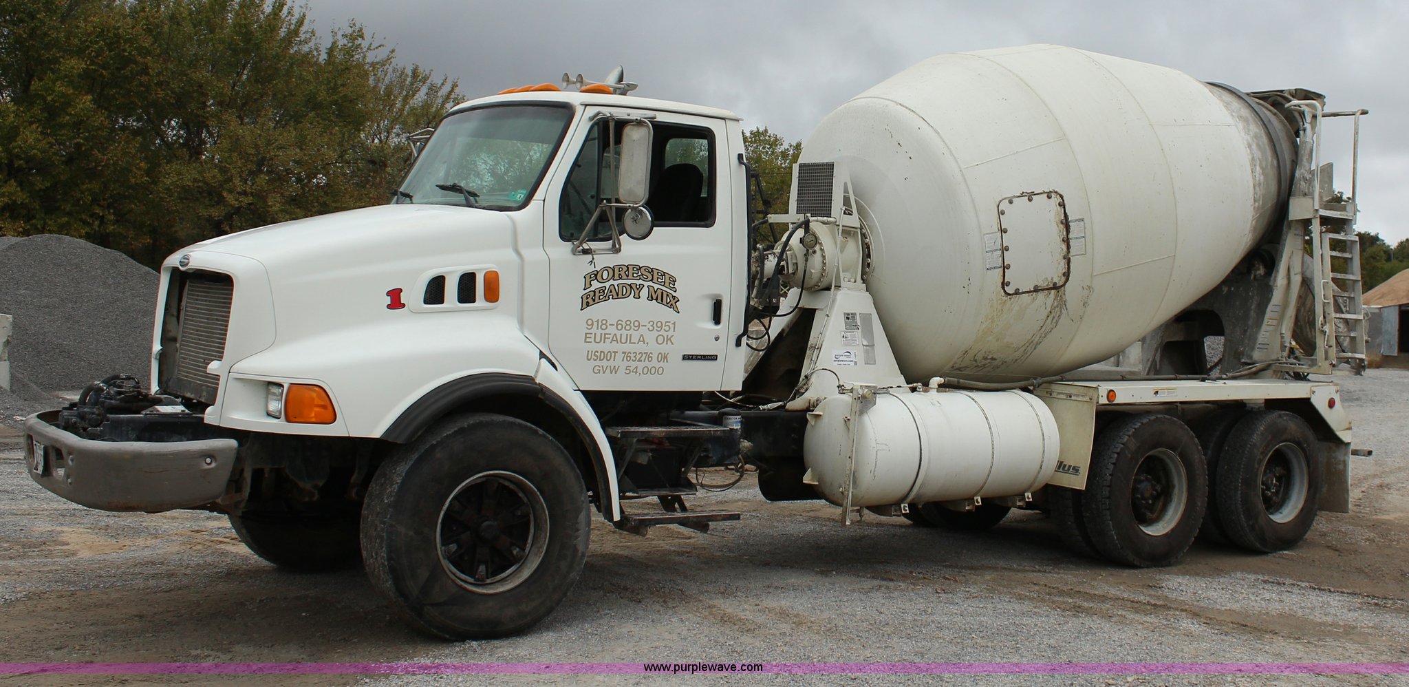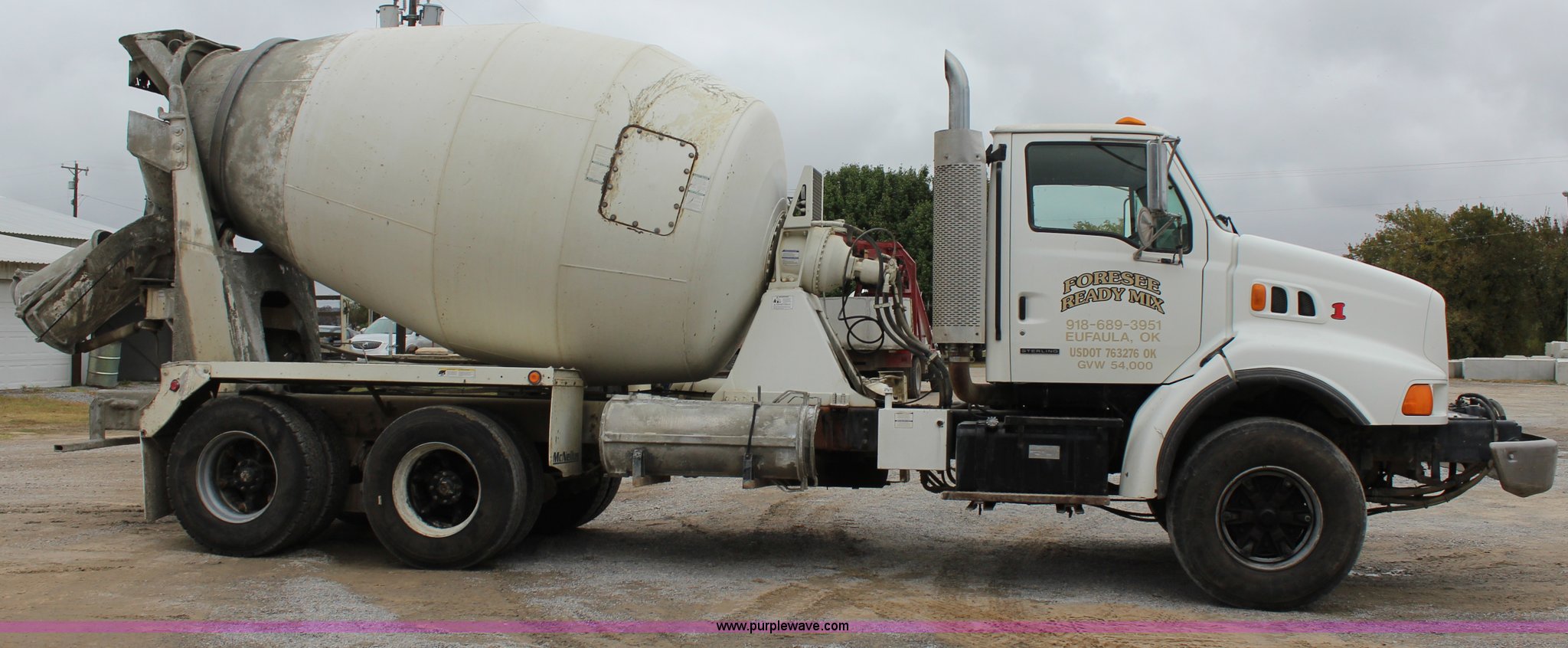 Purple Wave is selling a used Ready Mix or Pump Truck in Oklahoma. This item is a 1999 Sterling A9500 mixer truck with the following: 156,868 miles on odometer, 13,537 hours on meter, Cummins M11 10.8L L6 diesel engine, Eaton Fuller eight speed manual transmission, Tandem axle, AC and heat, Tilt, Heated mirrors, Air suspension seat, Backup alarm, 10.5 cubic yard mixer, Steel chute, Single rear exhaust stack, Single fuel tank, Spring over walking beam suspension, Air brakes, 425/65R22.5 front tires, 11R22.5 rear tires, GVWR 66,000 lbs, FAWR 20,000 lbs, IAWR 23,000 lbs, RAWR 23,000 lbs, Unit# 1