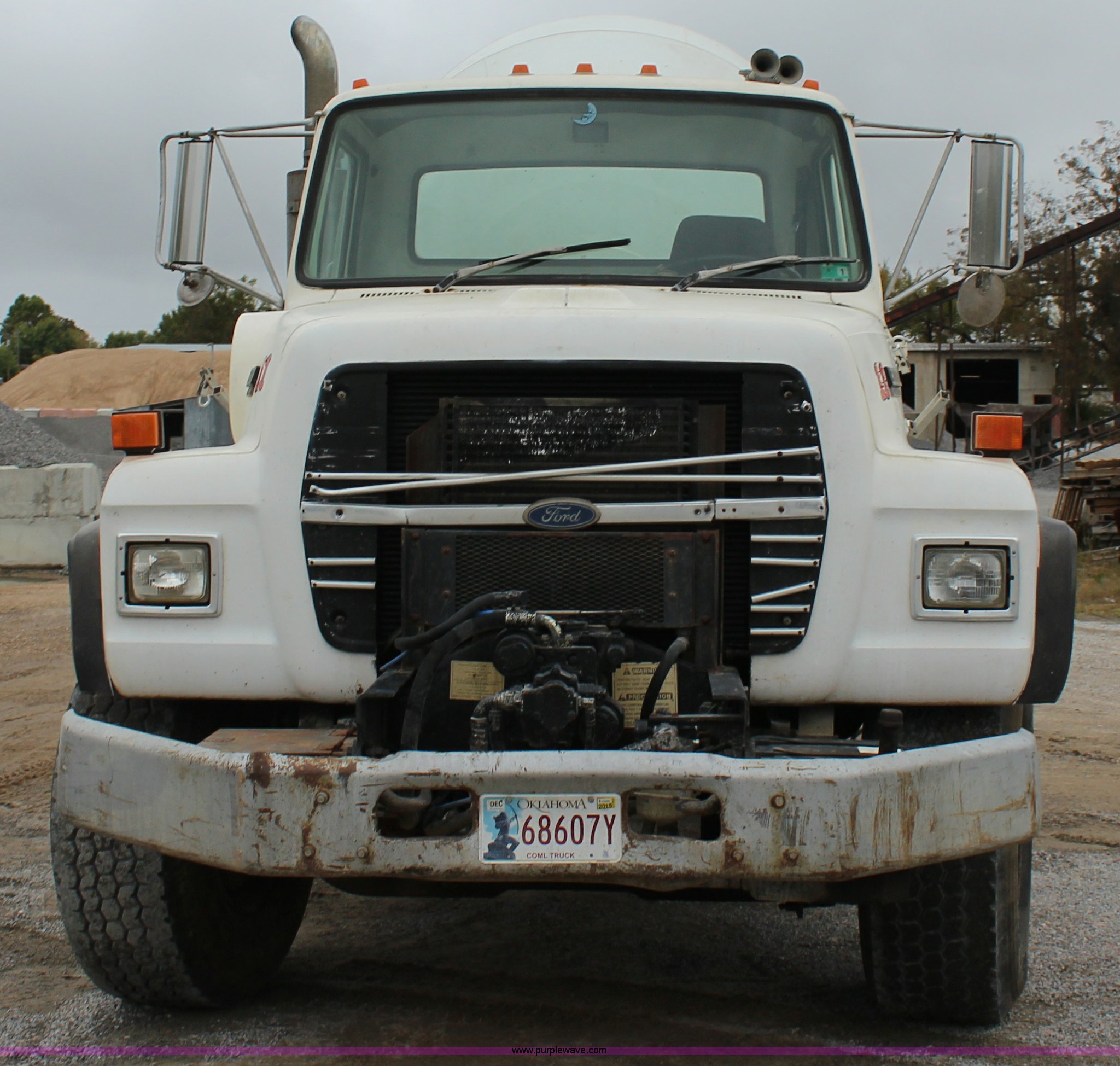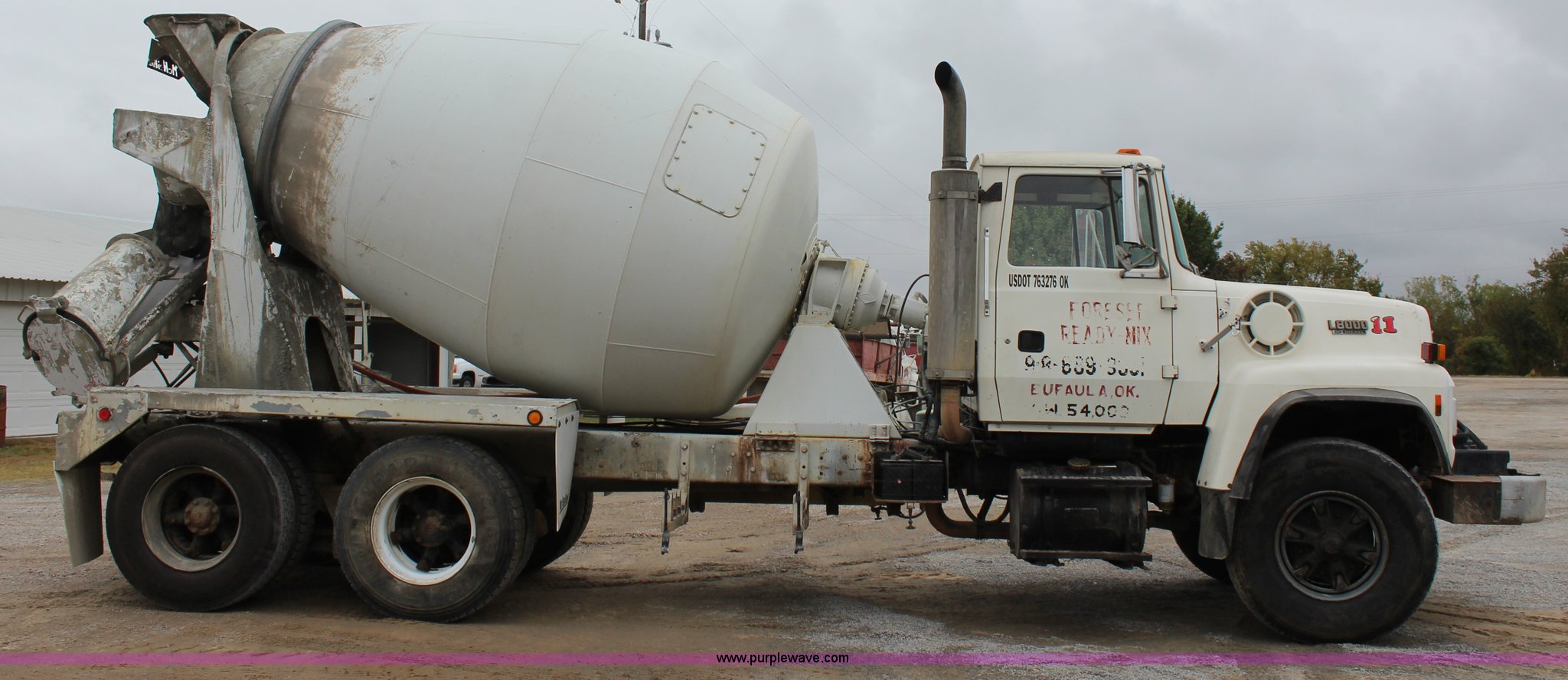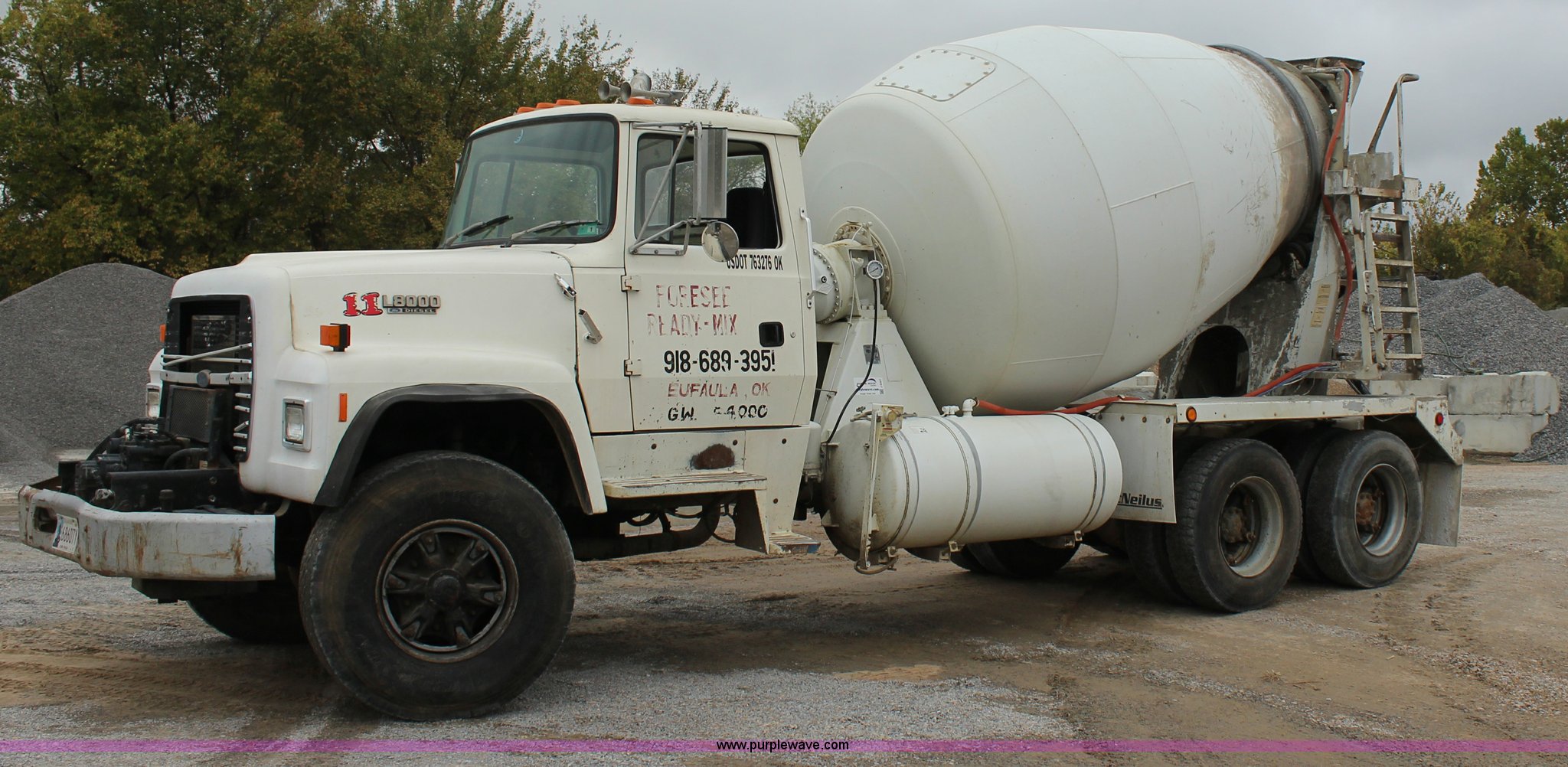 Purple Wave is selling a used Ready Mix or Pump Truck in Oklahoma. This item is a 1991 Ford LT8000 mixer truck with the following: 244,606 miles on odometer, Ford 7.8L six cylinder diesel engine, Eaton Fuller RT7608L eight speed manual transmission, AC and heat, Air suspension seat, Backup alarm, 8.5 cubic yard mixer, Steel chutes, Single rear exhaust stack, Single fuel tank, Air brakes, 425/65R22.5 front tires, 11R22.5 rear tires, GVWR 58,000 lbs, FAWR 18,000 lbs, IAWR 20,000 lbs, RAWR 20,000 lbs, Unit# 11