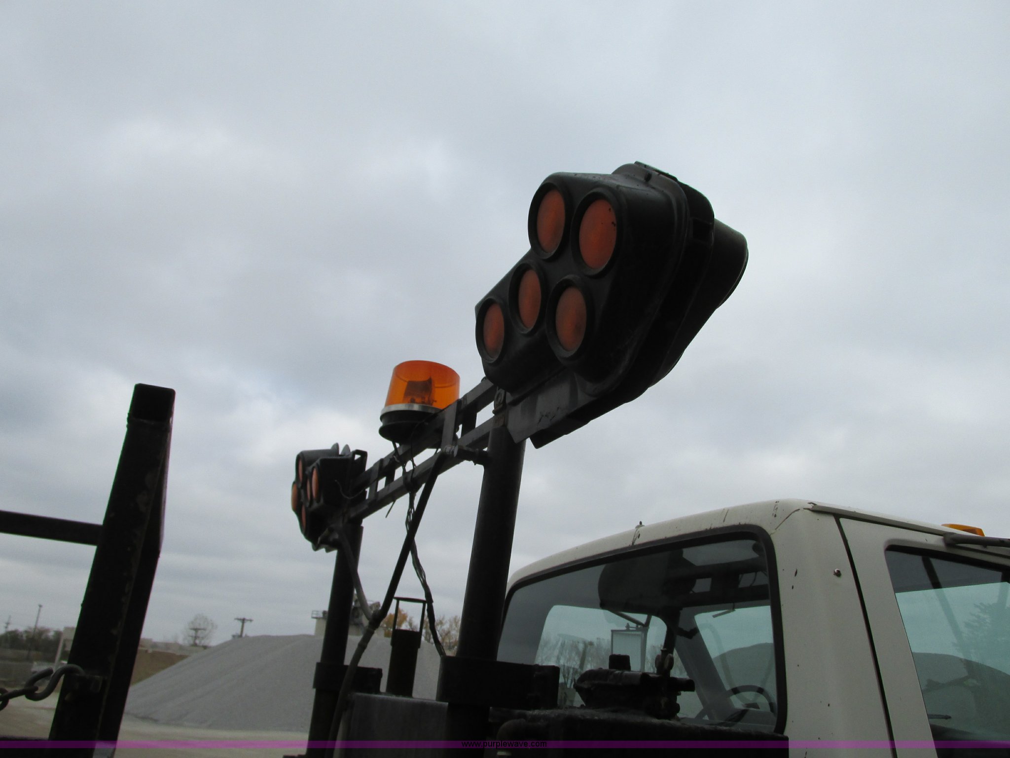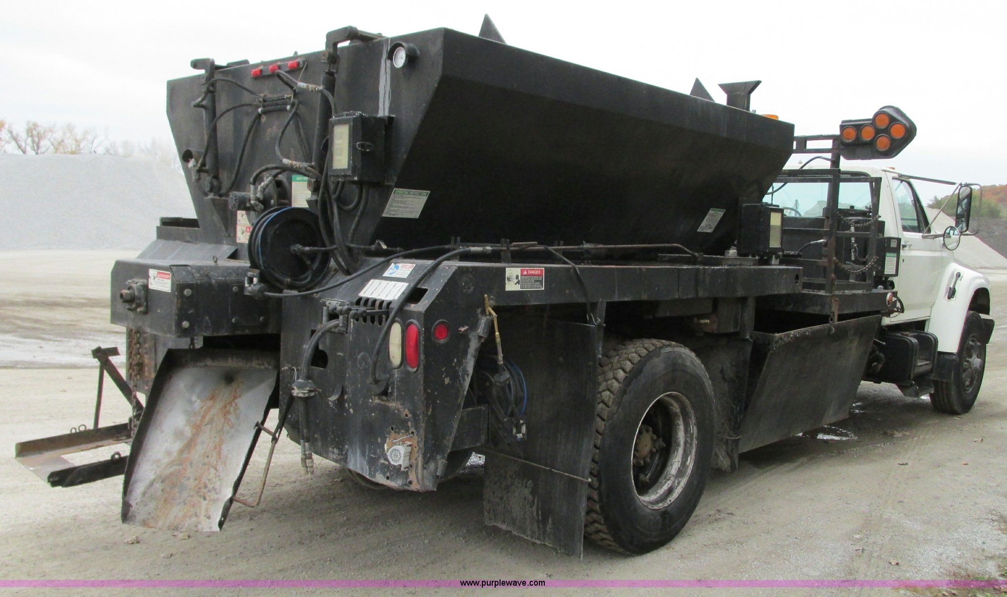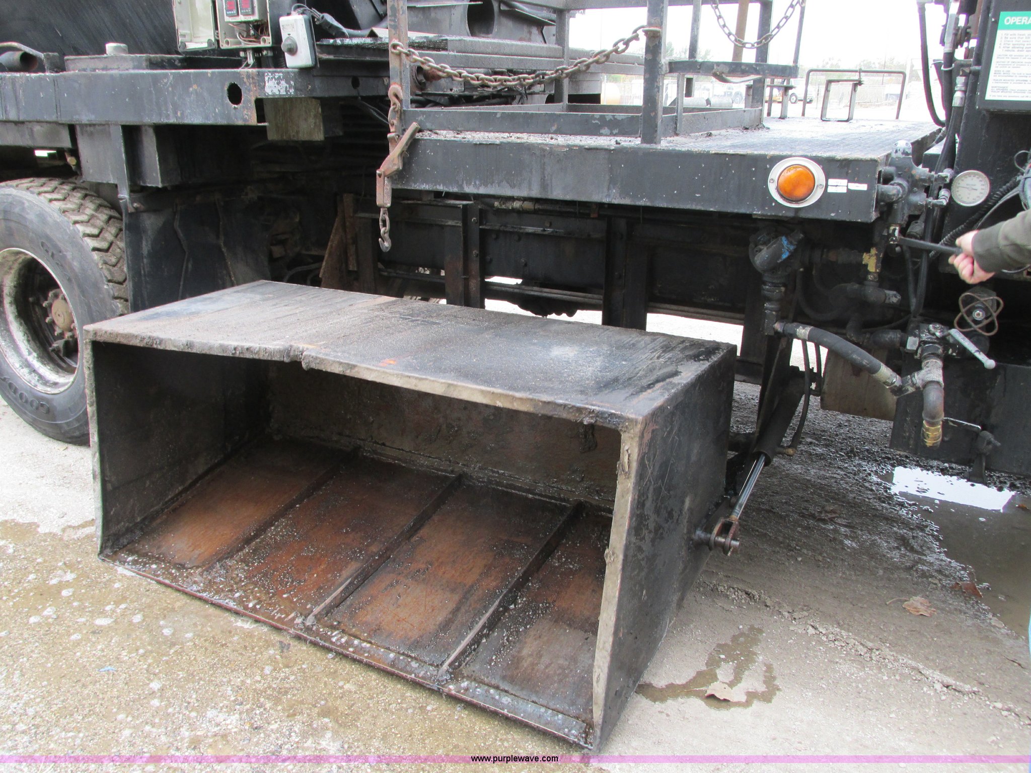 1995 Ford F800 asphalt patch truck. 123,385 miles on odometer, Cummins ISB 5.9L L6 turbo diesel engine, Five speed manual transmission, AC and heat, PTO, Diesel burner with gun, Diesel wash down, P.B. loader, Five ton capacity hopper, Auger feed rear heated dispenser, Plate compactor storage with auto loading, Rear auxiliary hydraulics Approximately 25'L line on spool, 68" x 29" x 32"d trash bin Hydraulic passenger side dump, Arrow board In-cab controls, 100 gallon heated tack tank Tack wand, Retractable hose, 60 gallon propane tank, 48" storage box, Dual fuel tanks 35 and 50 gallon capacities, Spring suspension, Air brakes, 214" wheelbase, 12R22.5 tires, GVWR 35,000 lbs, FAWR 12,000 lbs, RAWR 23,000 lbs, Manuals and service records available. 1FDYF80C3SVA16365. J.M. Fahey Construction. 7014 Holliday Drive. Kansas City, KS 66106-6610