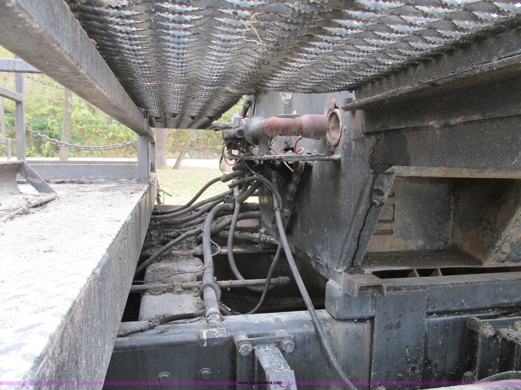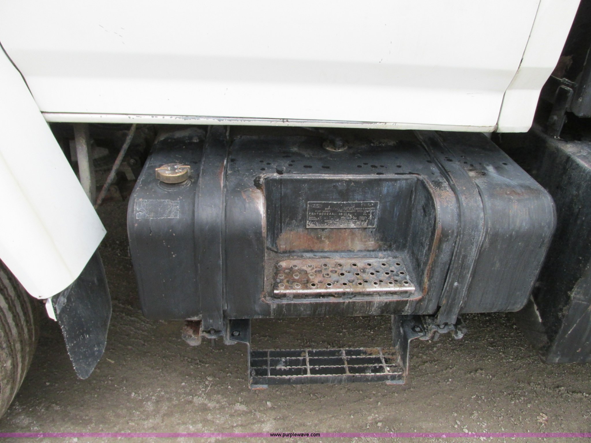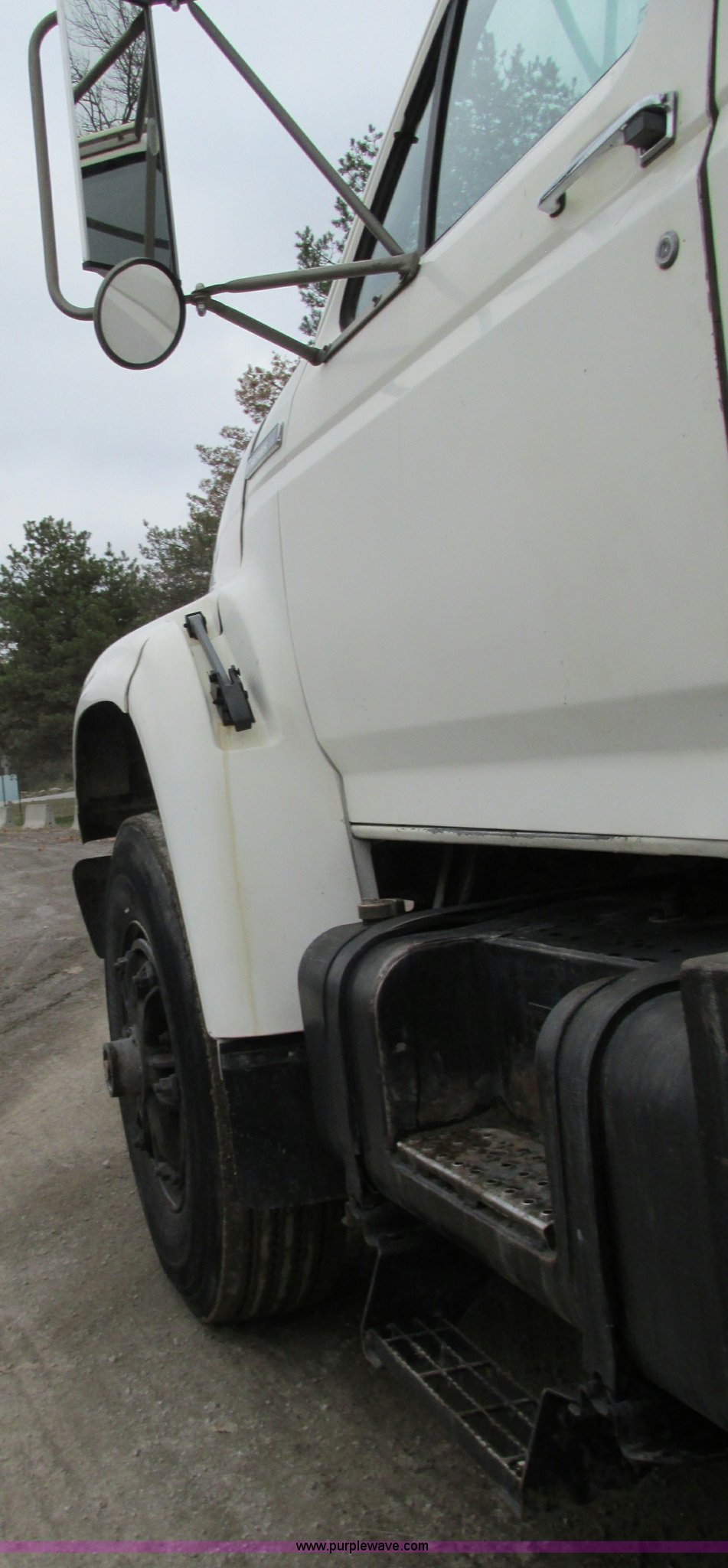 1995 Ford F800 asphalt patch truck. 123,385 miles on odometer, Cummins ISB 5.9L L6 turbo diesel engine, Five speed manual transmission, AC and heat, PTO, Diesel burner with gun, Diesel wash down, P.B. loader, Five ton capacity hopper, Auger feed rear heated dispenser, Plate compactor storage with auto loading, Rear auxiliary hydraulics Approximately 25'L line on spool, 68" x 29" x 32"d trash bin Hydraulic passenger side dump, Arrow board In-cab controls, 100 gallon heated tack tank Tack wand, Retractable hose, 60 gallon propane tank, 48" storage box, Dual fuel tanks 35 and 50 gallon capacities, Spring suspension, Air brakes, 214" wheelbase, 12R22.5 tires, GVWR 35,000 lbs, FAWR 12,000 lbs, RAWR 23,000 lbs, Manuals and service records available. 1FDYF80C3SVA16365. J.M. Fahey Construction. 7014 Holliday Drive. Kansas City, KS 66106-6610