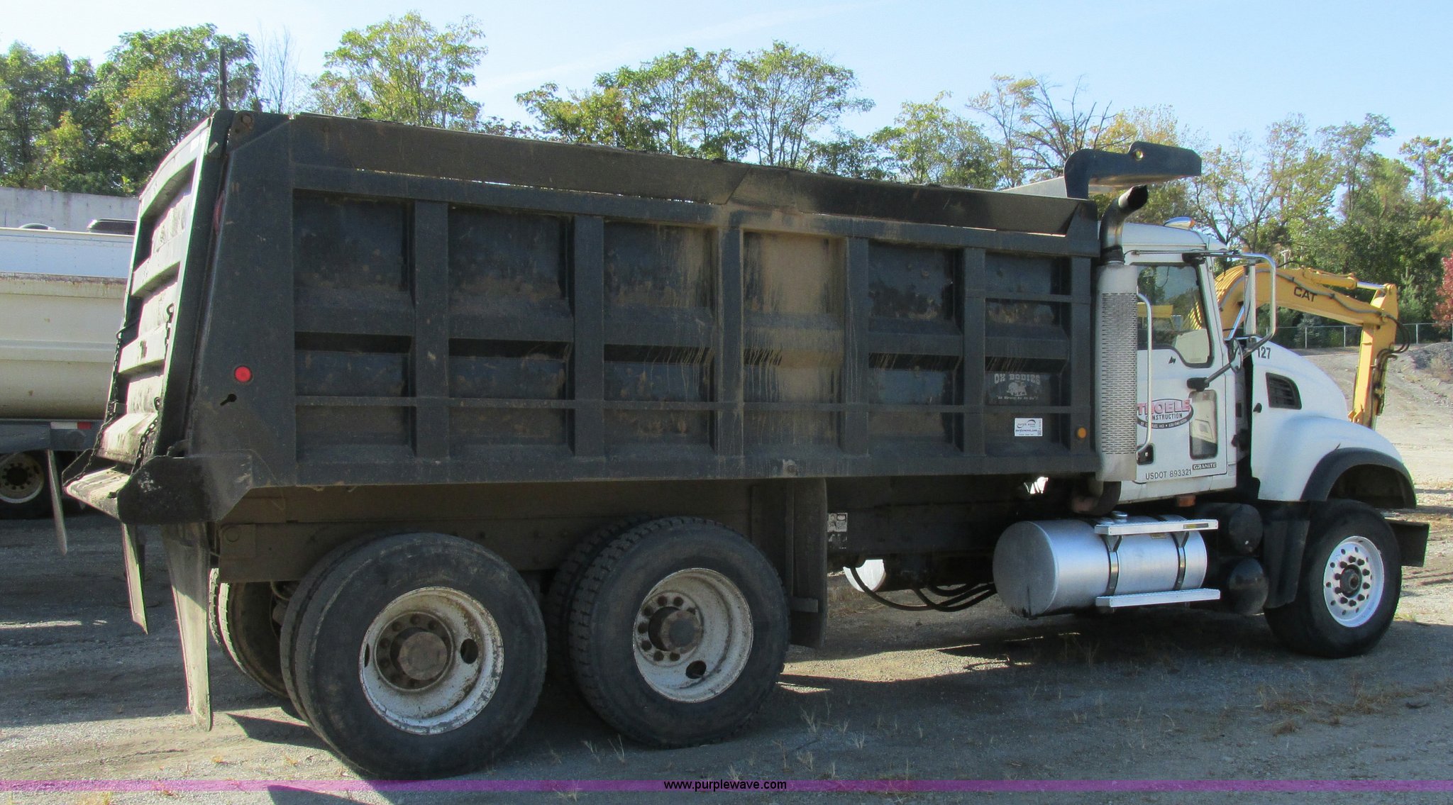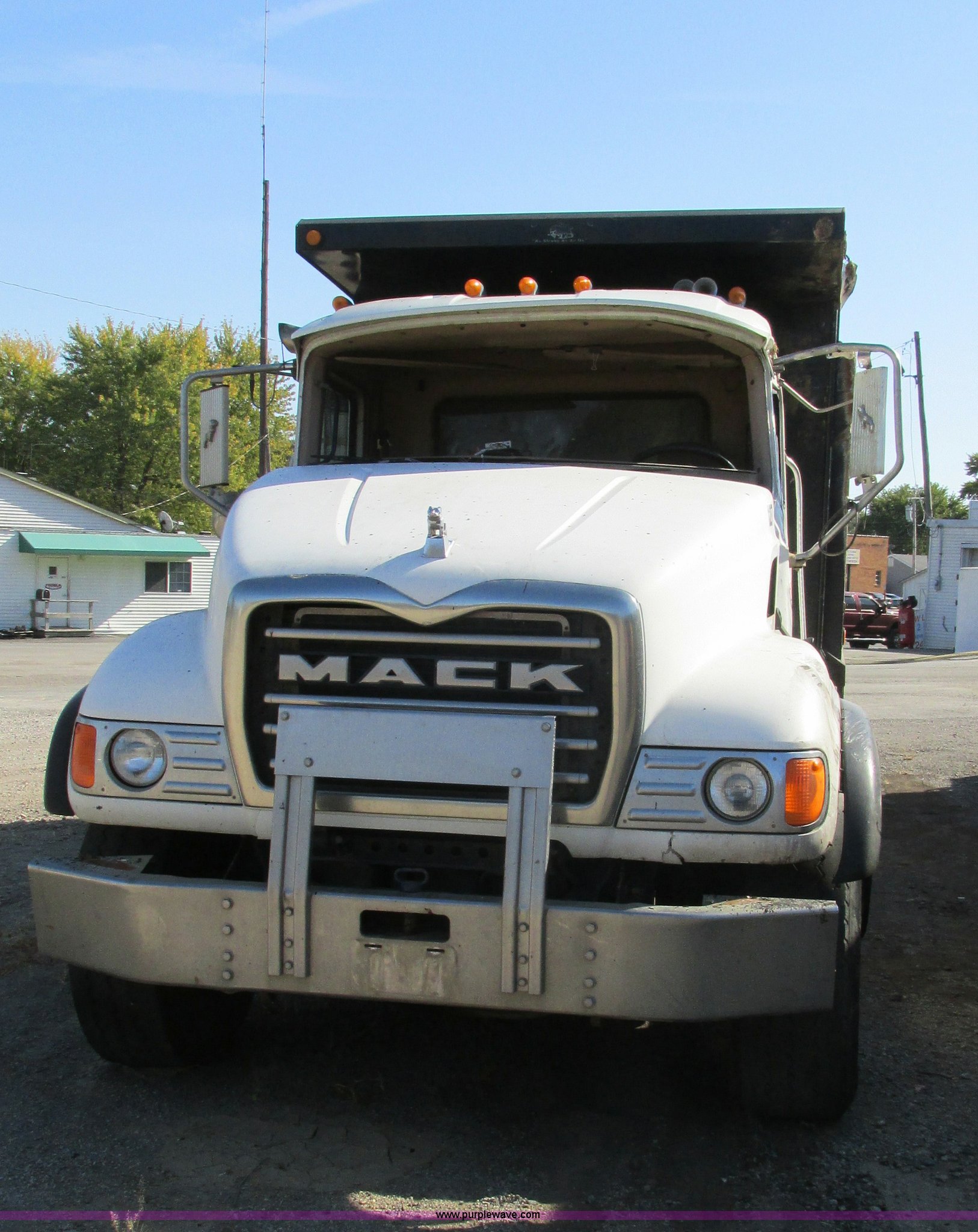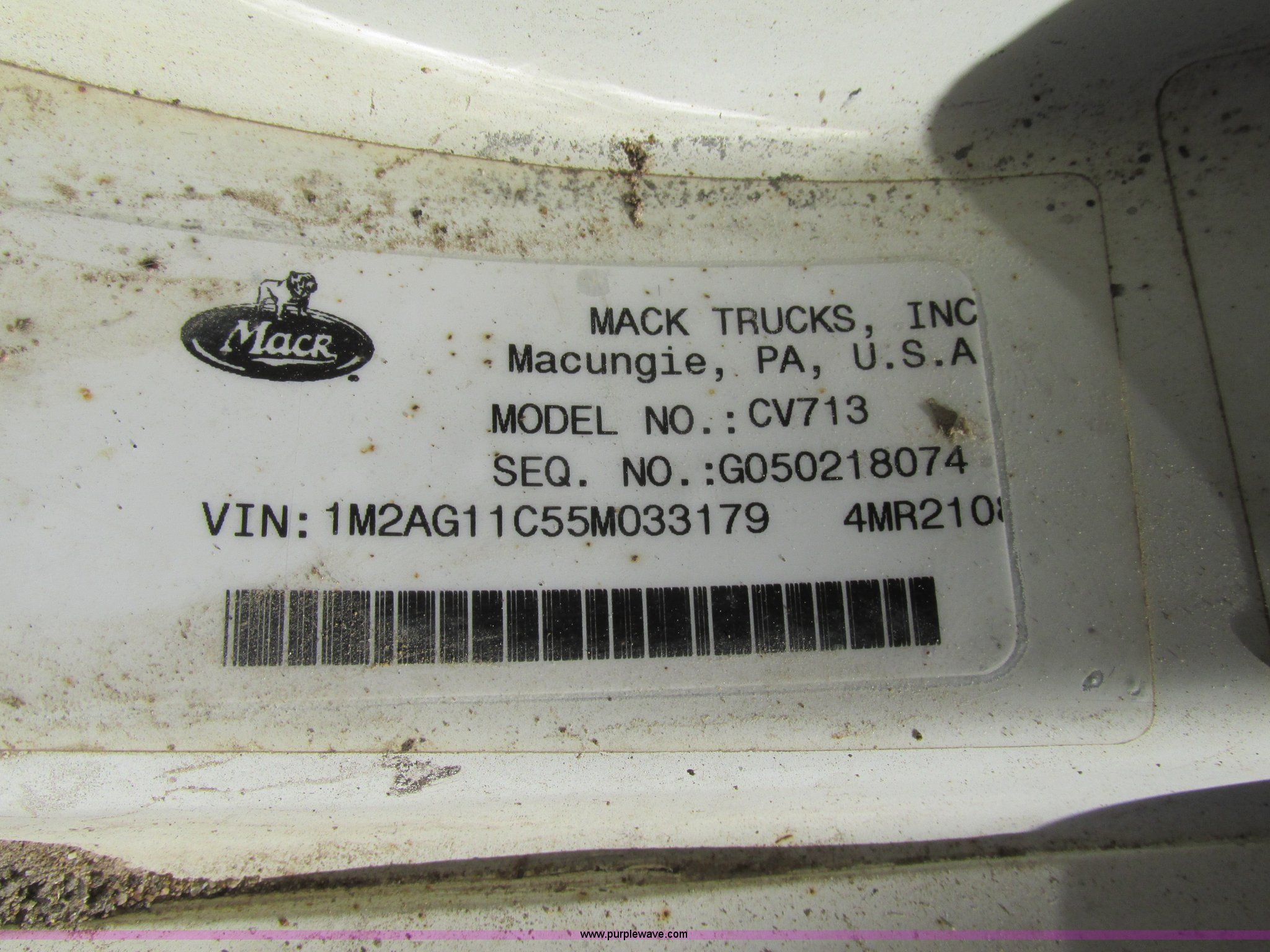 Purple Wave is selling a used Construction Dump Truck in Missouri. This item is a 2005 Mack CV713 dump truck with the following: 317,493 miles on odometer, Mack AMI 12.0L L6 diesel engine, Mack Maxitorque eight speed manual transmission, AC and heat, Cruise, AM/FM/CD, Air suspension seat, Air ride cab, Exterior visor, PTO, Ox Body 16'L dump bed, 17 to 19 cubic yard capacity, Single ram hoist, Bed vibrator, Air operated end gate, Dual fuel tanks, Grill guard, Double frame, Spring suspension, Air brakes, Aluminum front wheels, 385/65R22.5 front tires, 11R24.5 rear tires, Interior/exterior cosmetic damage, Truck has been laid on it's side, Windshield missing, Drive shaft removed but included, Dash cracked, Tarp assembly removed