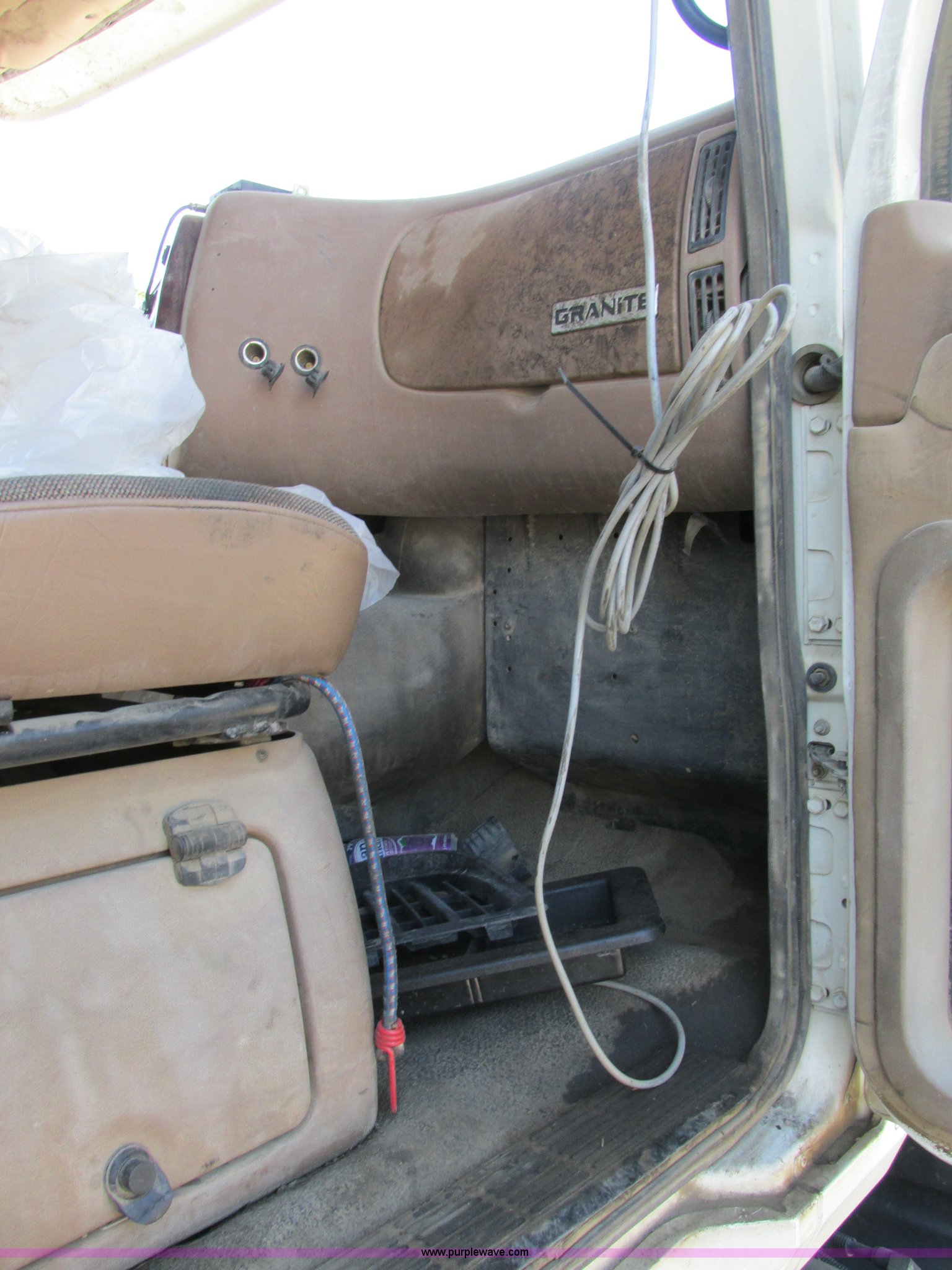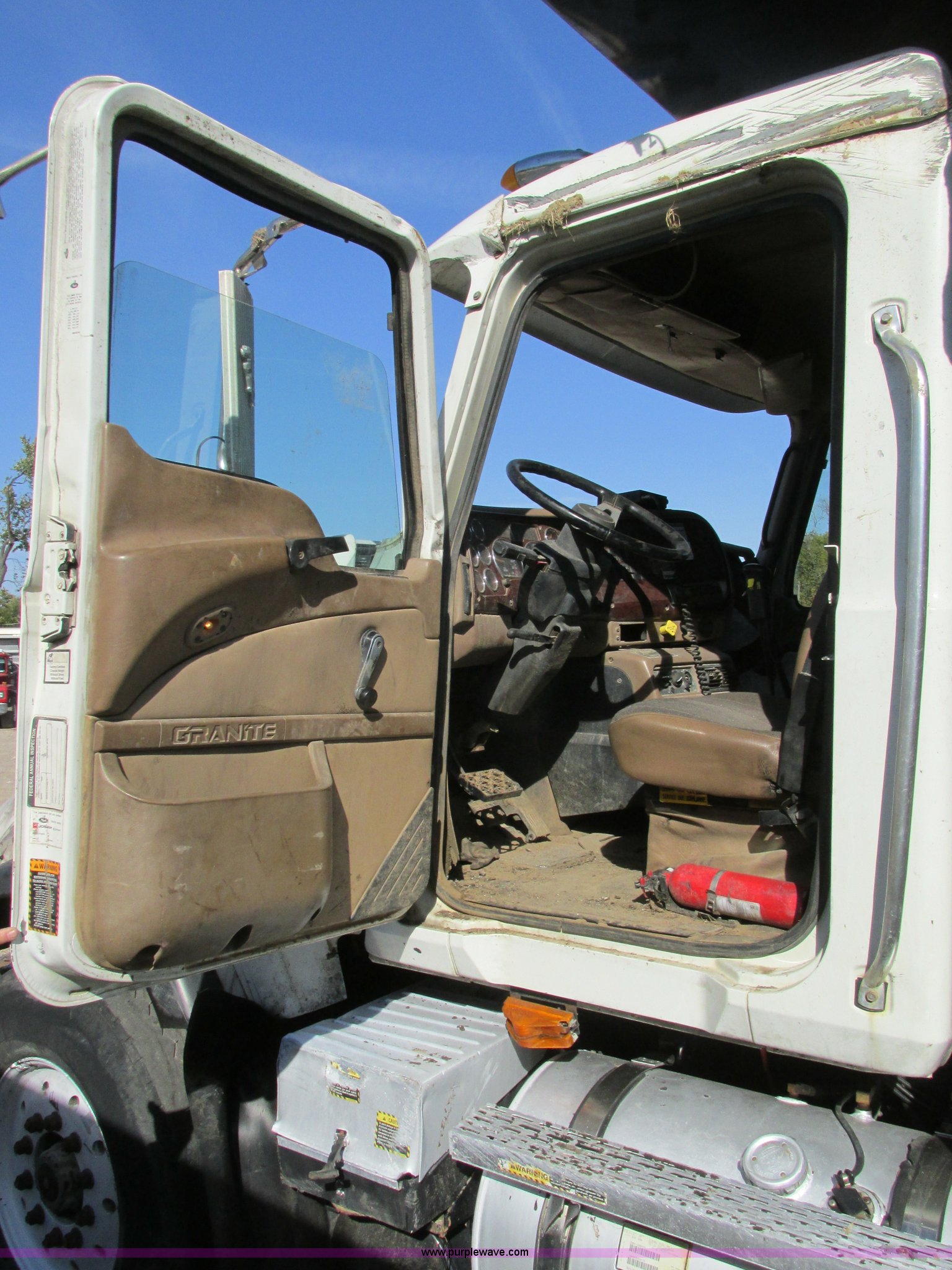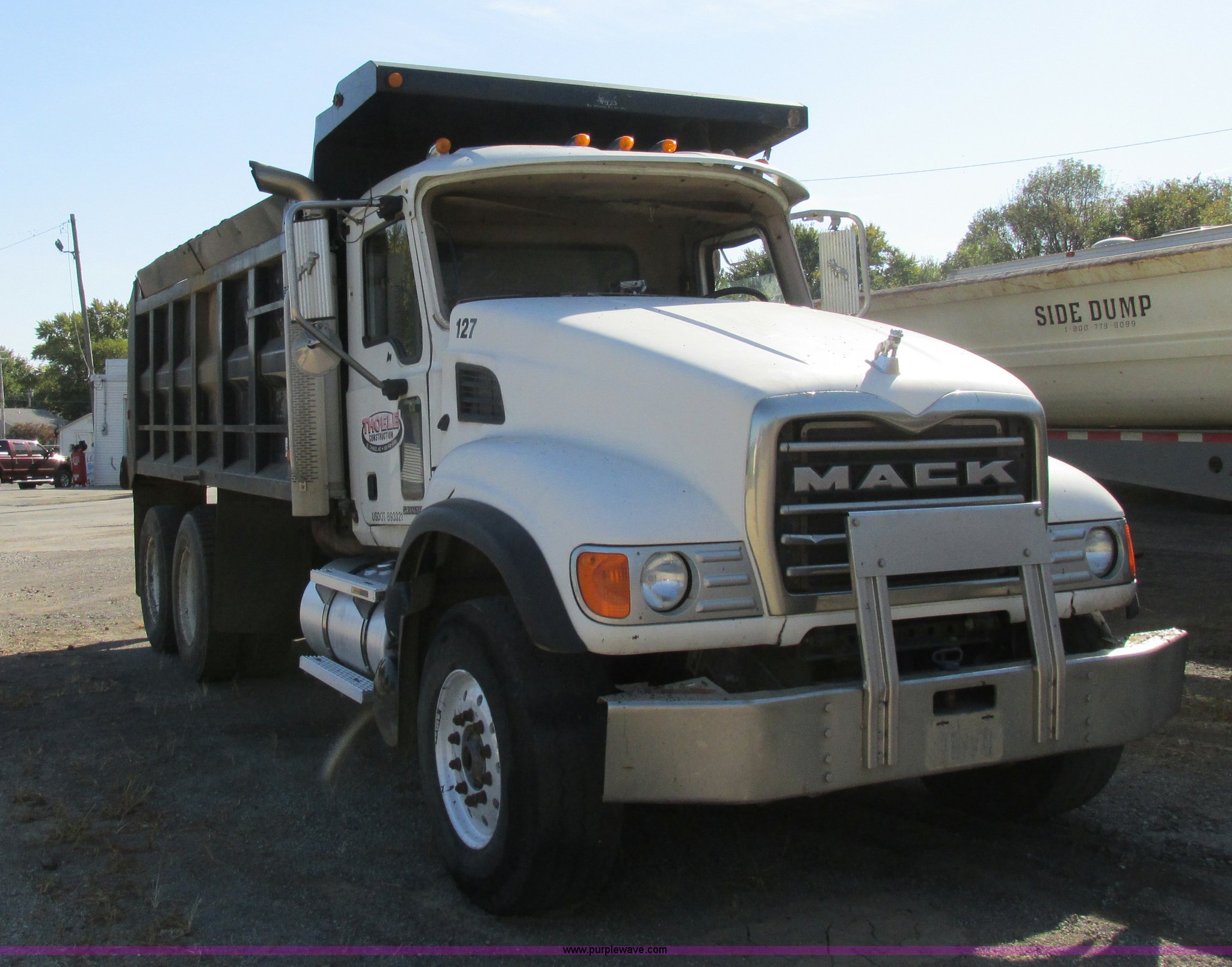 Purple Wave is selling a used Construction Dump Truck in Missouri. This item is a 2005 Mack CV713 dump truck with the following: 317,493 miles on odometer, Mack AMI 12.0L L6 diesel engine, Mack Maxitorque eight speed manual transmission, AC and heat, Cruise, AM/FM/CD, Air suspension seat, Air ride cab, Exterior visor, PTO, Ox Body 16'L dump bed, 17 to 19 cubic yard capacity, Single ram hoist, Bed vibrator, Air operated end gate, Dual fuel tanks, Grill guard, Double frame, Spring suspension, Air brakes, Aluminum front wheels, 385/65R22.5 front tires, 11R24.5 rear tires, Interior/exterior cosmetic damage, Truck has been laid on it's side, Windshield missing, Drive shaft removed but included, Dash cracked, Tarp assembly removed