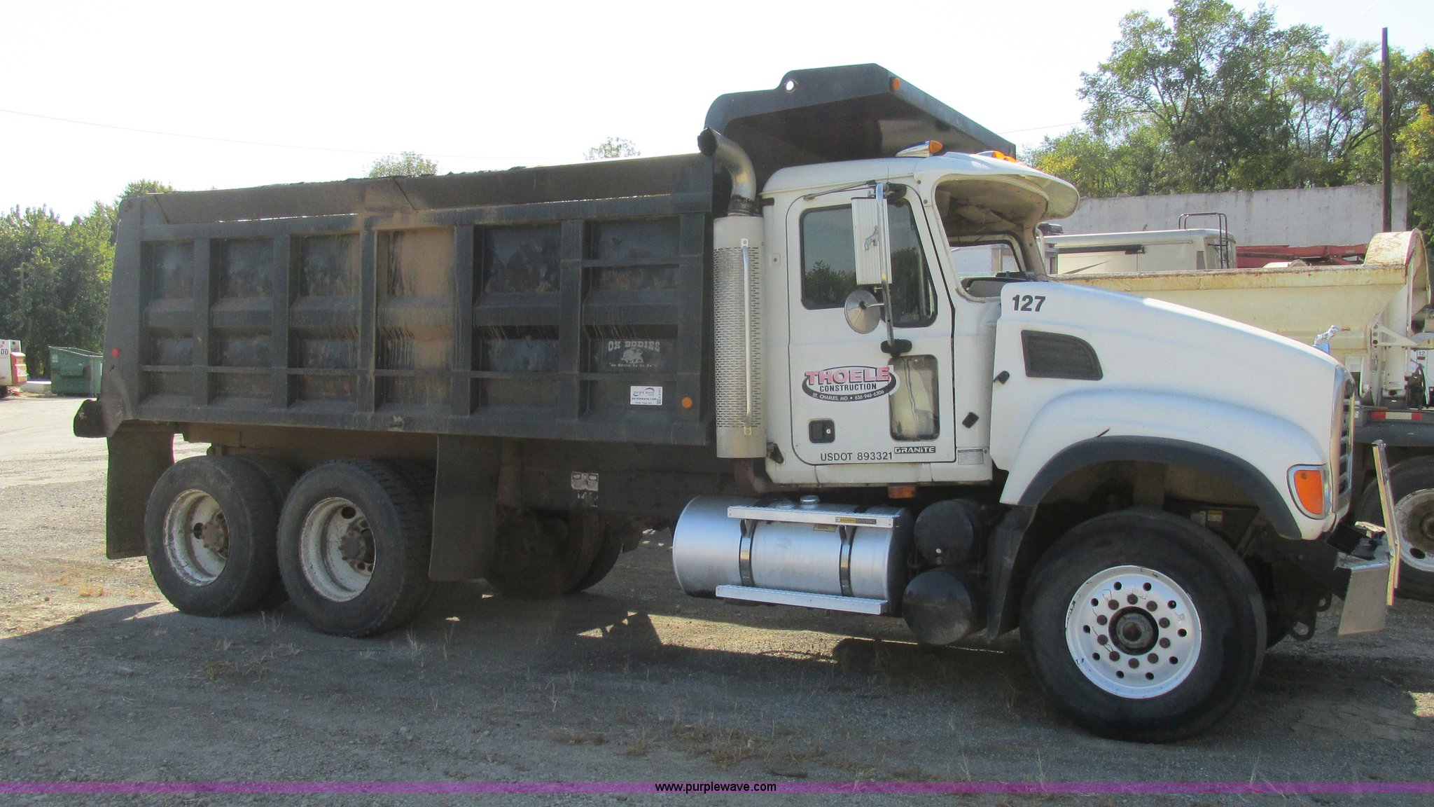 2005 Mack CV713 dump truck. 317,493 miles on odometer, Mack AMI 12.0L L6 diesel engine, Mack Maxitorque eight speed manual transmission, AC and heat, Cruise, AM/FM/CD, Air suspension seat, Air ride cab, Exterior visor, PTO, Ox Body 16'L dump bed 17 to 19 cubic yard capacity, Single ram hoist, Bed vibrator, Air operated end gate, Dual fuel tanks, Grill guard, Double frame, Spring suspension, Air brakes, Aluminum front wheels, 385/65R22.5 front tires, 11R24.5 rear tires, Interior/exterior cosmetic damage, Truck has been laid on it's side, Windshield missing, Drive shaft removed but included, Dash cracked, Tarp assembly removed. Title has a lien that will be released following the close of the auction. Title distribution may be delayed up to 30 days from verification of funds. 1M2AG11C55M033179. View equipment video. Thoele Construction Inc.. 1703 N 4th Street. St. Charles, MO 63301