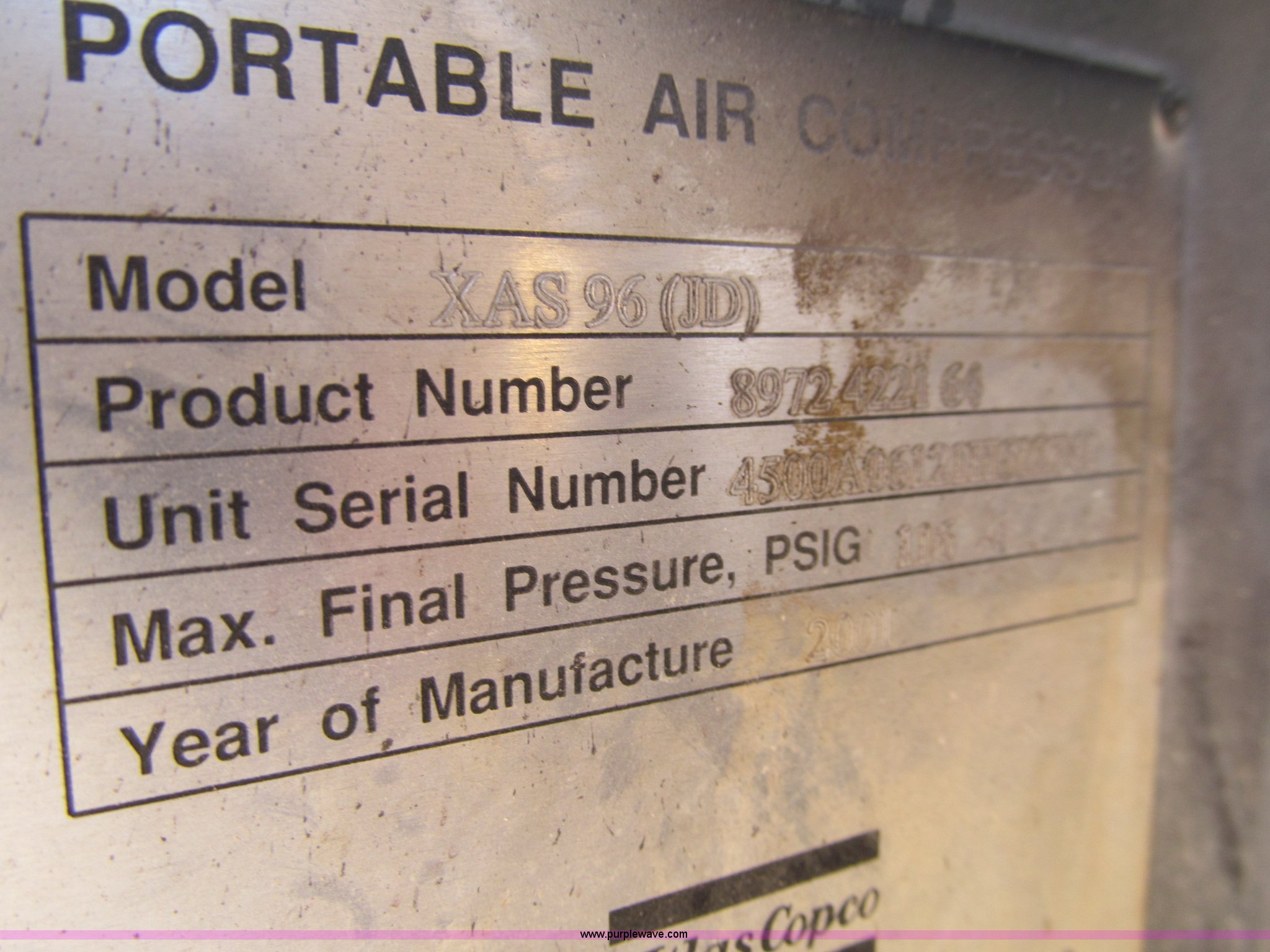 Purple Wave is selling a used Air Compressor in Iowa. This item is a 2001 Atlas Copco XAS 96 air compressor with the following: 1,411 hours on meter, John Deere 4045 four cylinder diesel engine, 185 CFM, Lifting eye, Tongue jack stand, Safety chains, Engine enclosures, Pintle hitch, Right engine enclosure dented, Serial A4500A06121H612741
