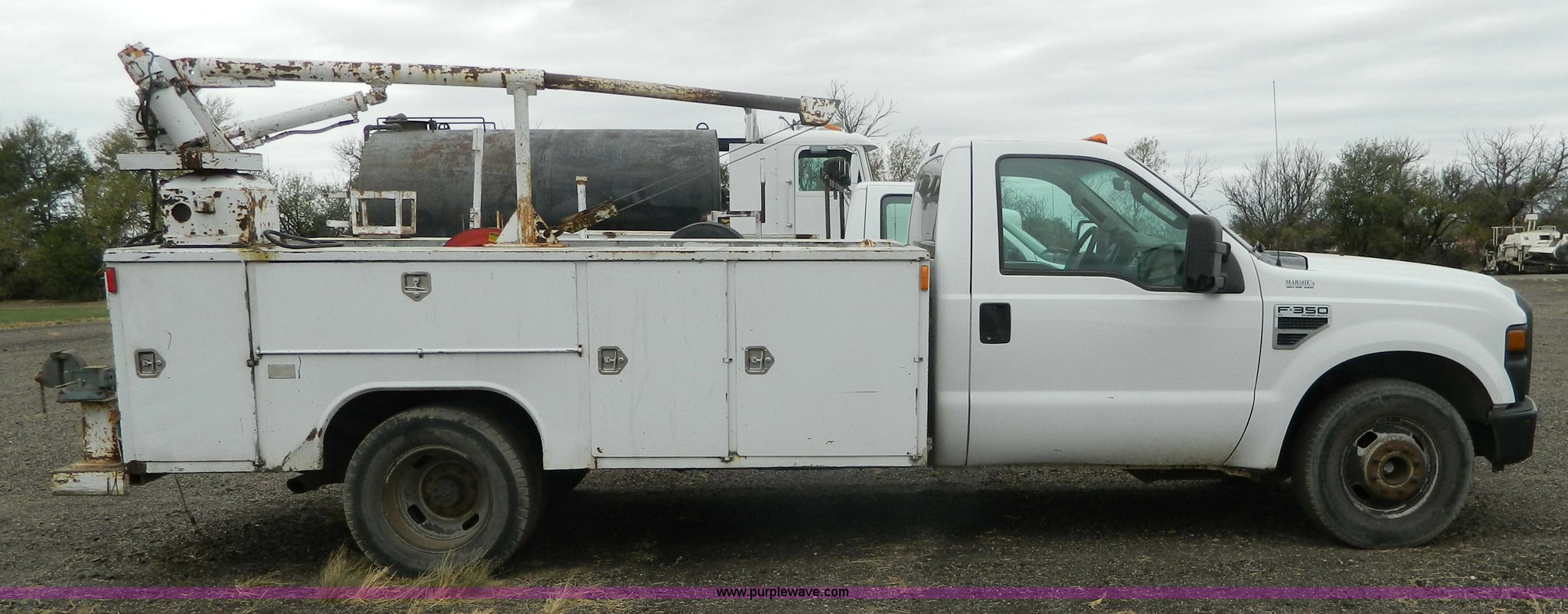 Purple Wave is selling a used Service Truck in Kansas. This item is a 2008 Ford F350 Super Duty service truck with the following: 150,000 miles on odometer, 5.4L V8 SOHC 24V gas engine, Six speed manual transmission, AC and heat, AM/FM, Manual windows and locks, Vinyl interior, 11'L service bed, Vise, Crane, LT245/75R17 tires, Windshield cracked, Clutch issue, Non-operational odometer, Body damage, Interior/exterior cosmetic damage, ABS light is on, Check engine light is on, Vehicle must be towed