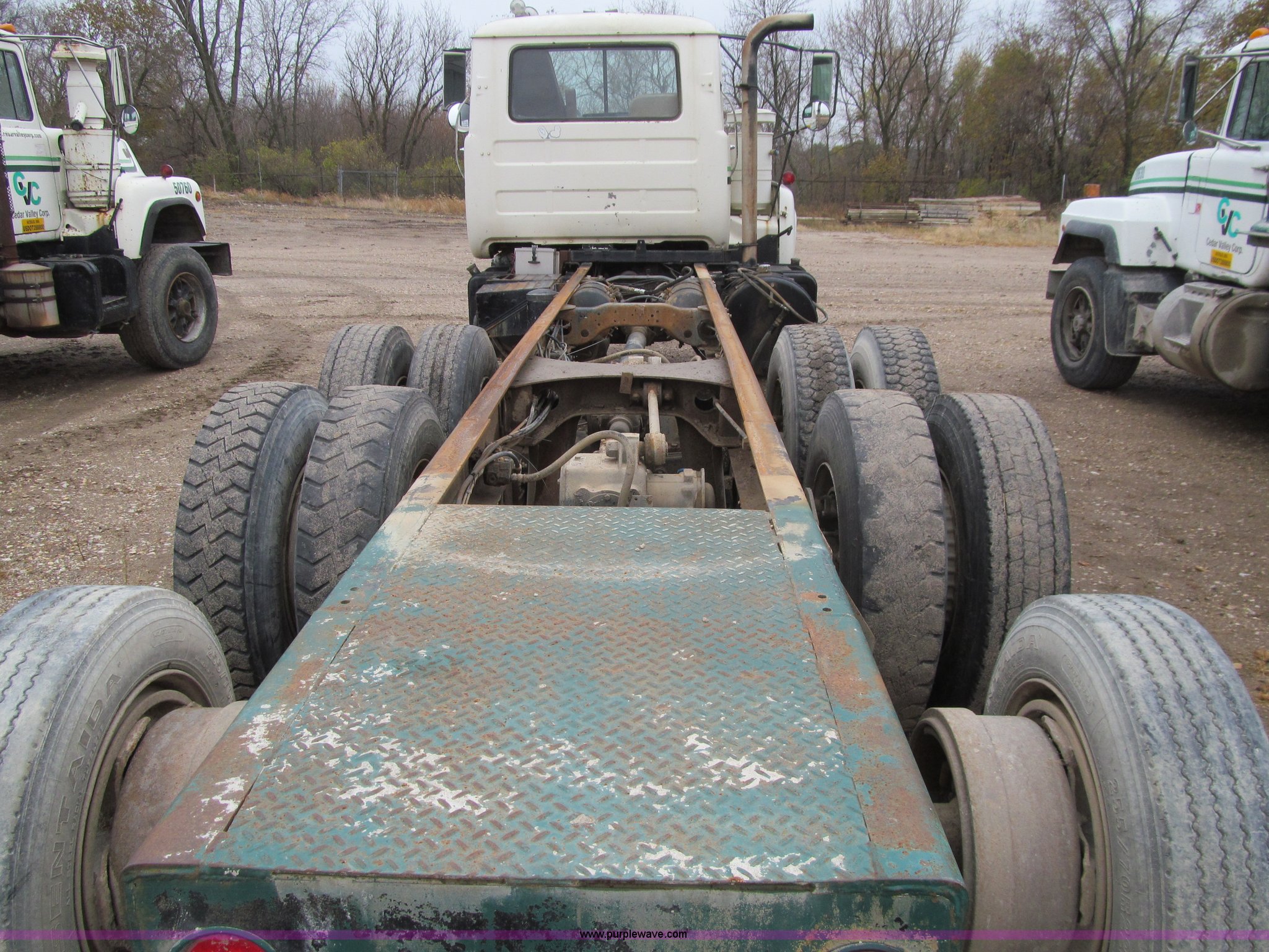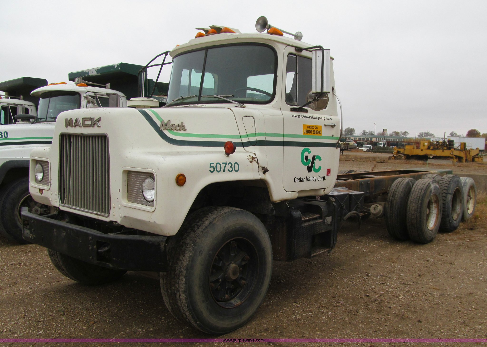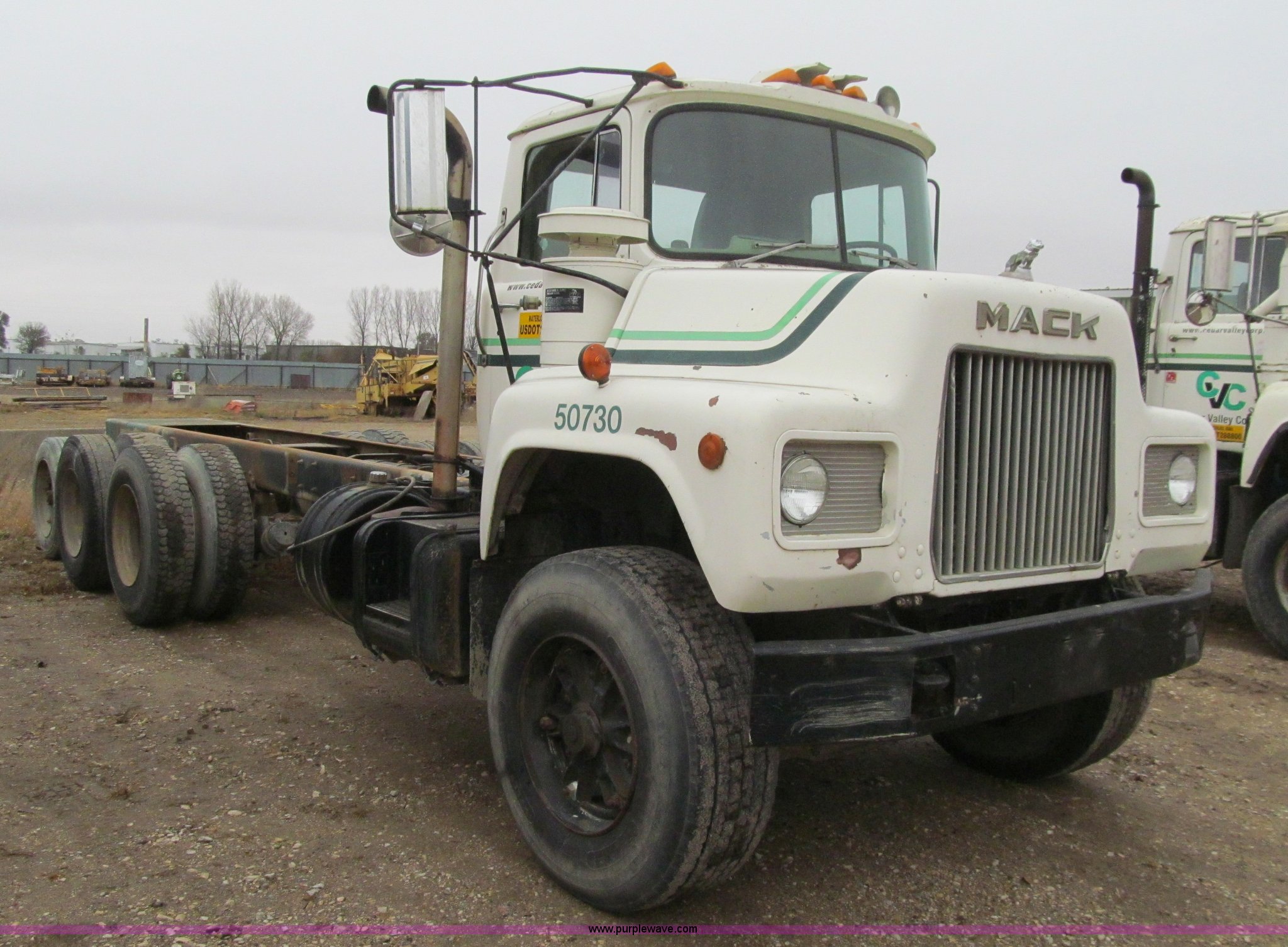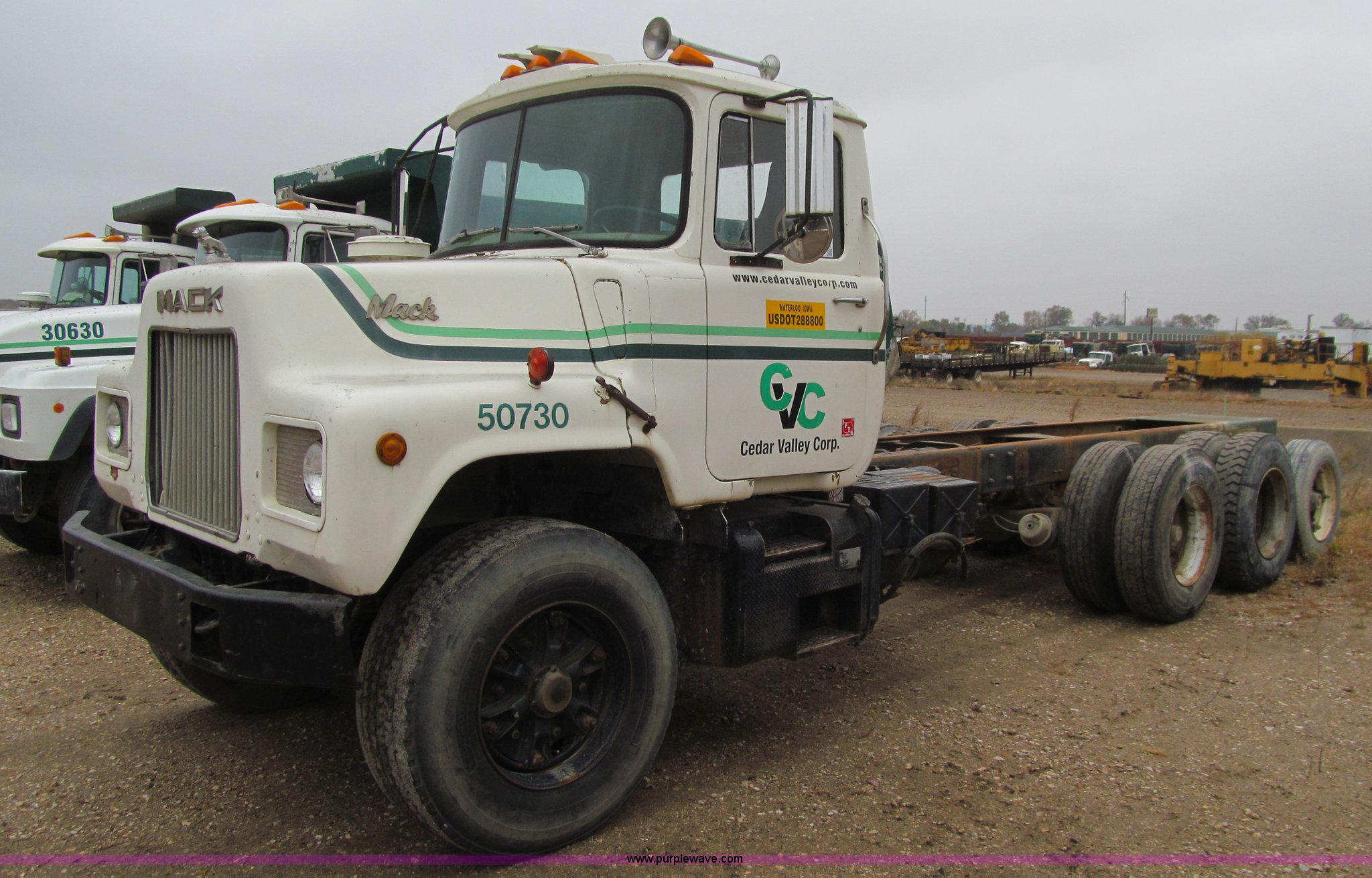 Purple Wave is selling a used Truck Chassis in Iowa. This item is a 1984 Mack DM685S cab and chassis with the following: 432,145 miles on odometer, 6,885 hours on meter, Mack six cylinder diesel engine, 237 HP, Maxitorque five speed extended manual transmission, Triple axle, Heat, Tilt, Air suspension seat, PTO, Single rear exhaust stack, Dual fuel tanks, Front tow hooks, 247" from rear of cab to rear of frame, Spring suspension, Air brakes, 200" wheelbase, 385/65R22.5 front tires, 255/70R22.5 air lift axle tires, 11R22.5 rear tires