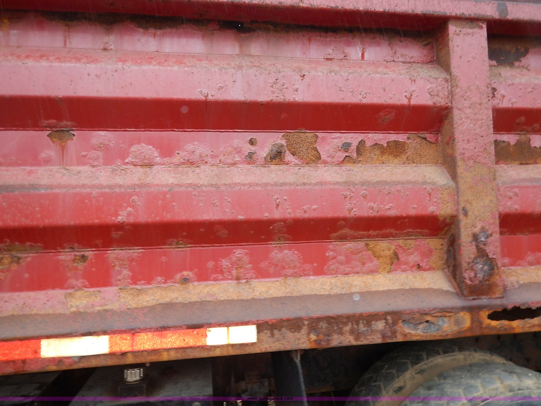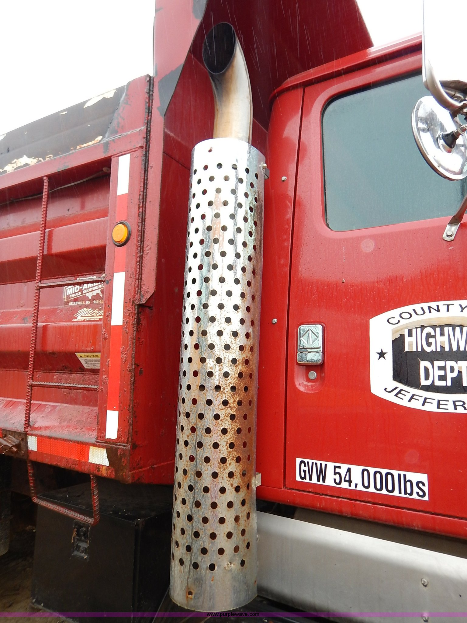 2001 International F2554 dump truck. 317,031 miles on odometer, International DT530 8.7L L6 turbo diesel engine, Eaton Fuller eight speed manual transmission Lo+Lo/Lo, Inter-axle differential lock, Heat, Cruise, AM/FM, Heated mirrors, Air suspension seat, Vinyl interior, Beacon light, Block heater, Chelsea PTO, 15'L x 8'W steel dump bed 54" side height, Toolboxes, Single fuel tank, Spring suspension, Air brakes, 315/80R22.5 front tires, 208" wheelbase, 11R22.5 rear tires, GVWR 56,000 lbs, FAWR 16,000 lbs, RAWR 40,000 lbs, Engine issues Uses antifreeze, Dents and scratches, Rust, Paint peeling and chipped, Battery weak, Maintenance records available, Unit# 04-25. 1HTGCADT11H404804. 15047 94th Street. Oskaloosa, KS 66066