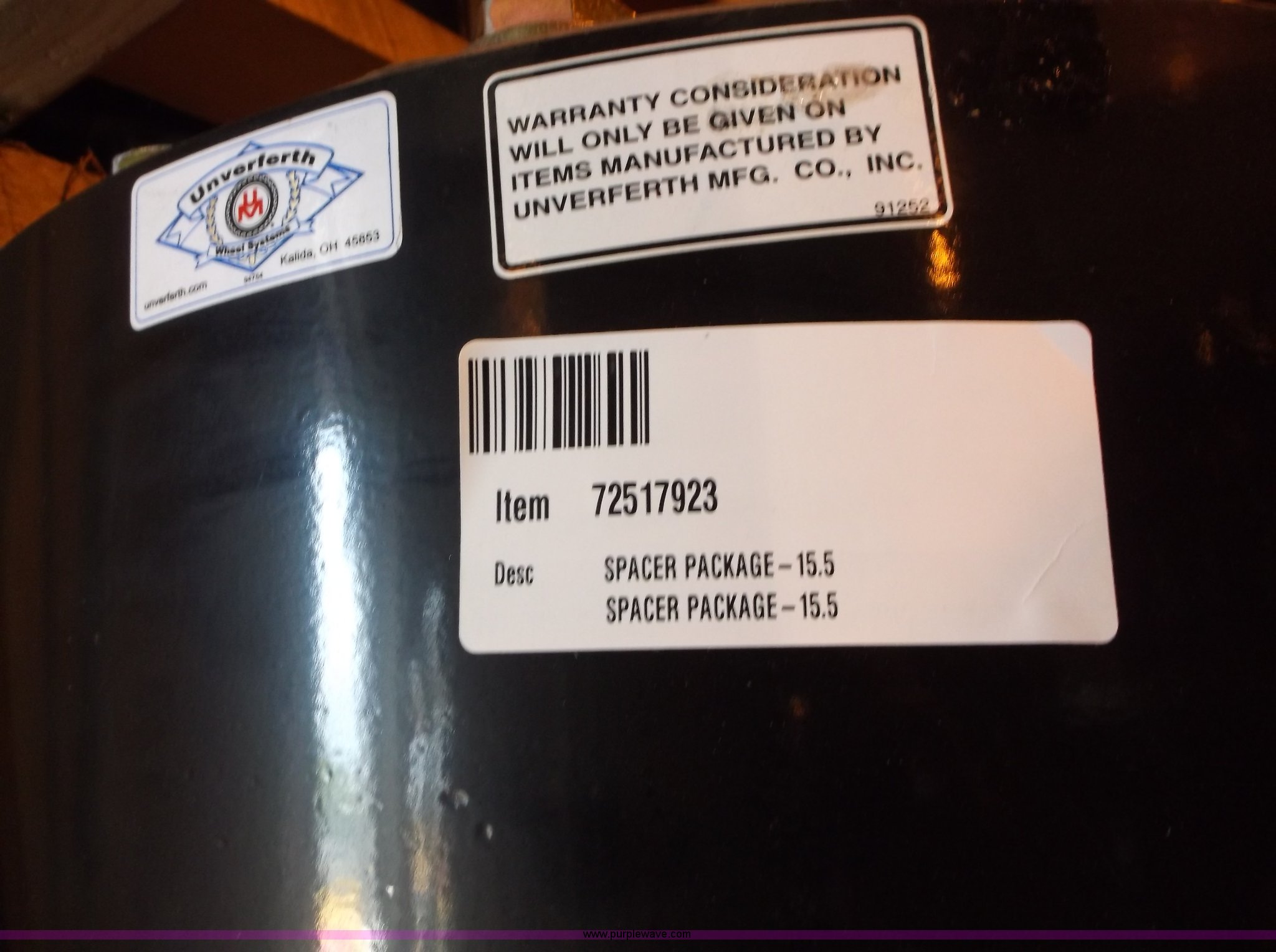 Purple Wave is selling a used Industrial Tires or Tracks in Texas. This item is a (6) Unverferth row crop 15.5" spacer package with the following: (3) left side, (3) right side, 12 bolt front axle, 120" max outer tread setting, Two to three year age range, Model usage MF8600/MT600, Catalog No. 72517923M