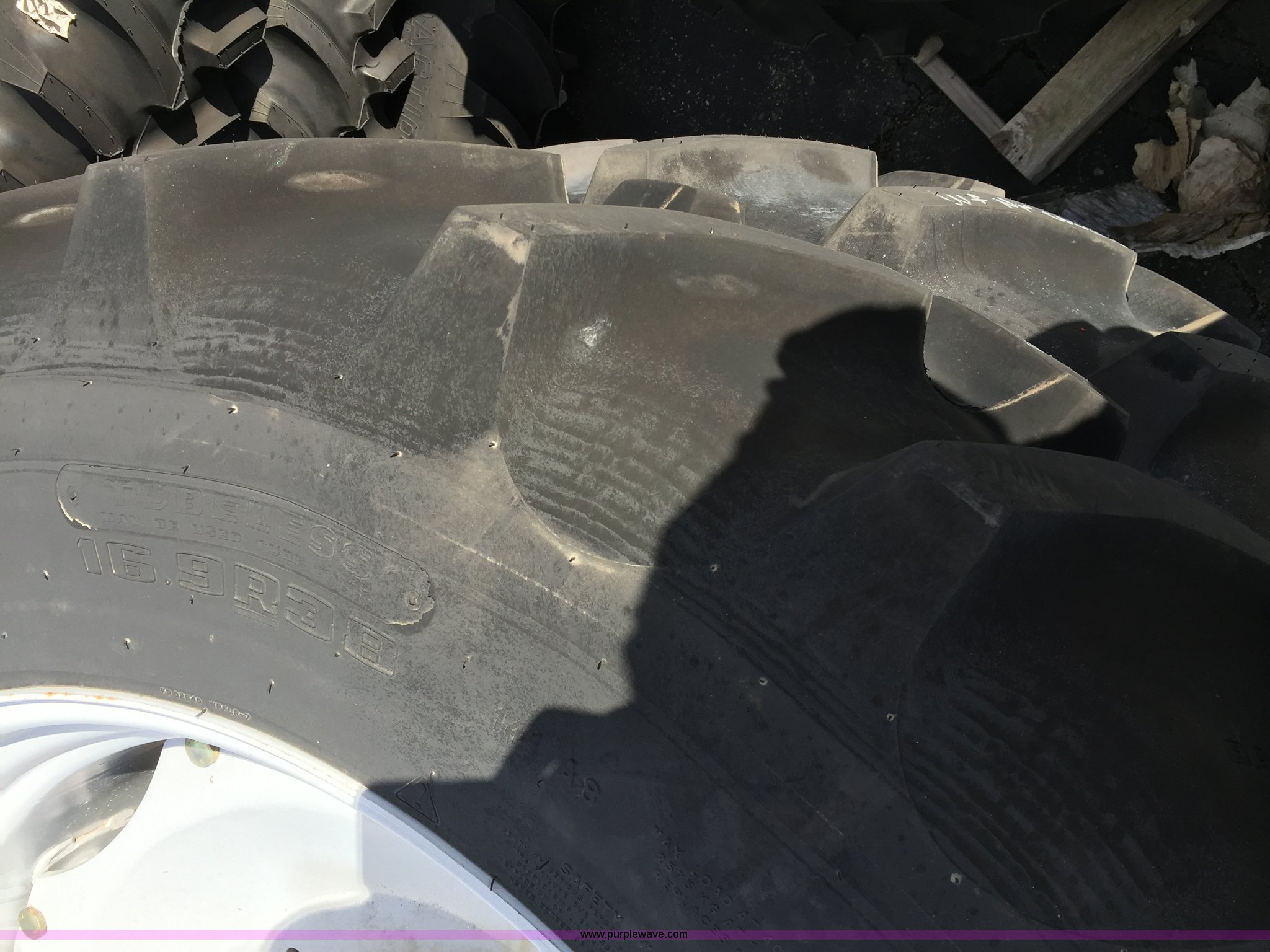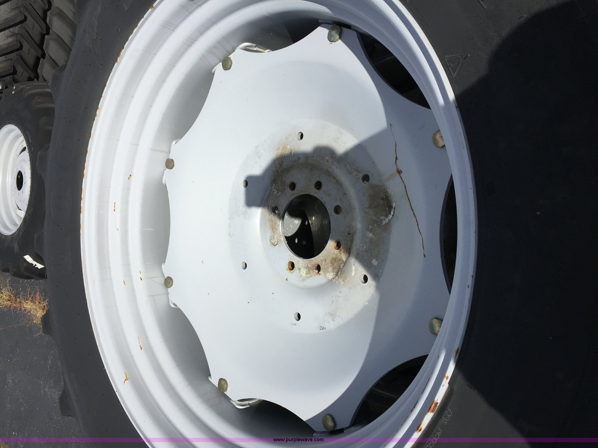 Purple Wave is selling a used Industrial Tires or Tracks in Maryland. This item is a (2) Firestone R420/85R38 R1 PSD GY utility rear wheel assemblies with the following: (1) left side, (1) right side, 9" tread spacing, 5 7/8" pilot hole diameter, Three years age range, Model usage MT400, Catalog No. 72552243