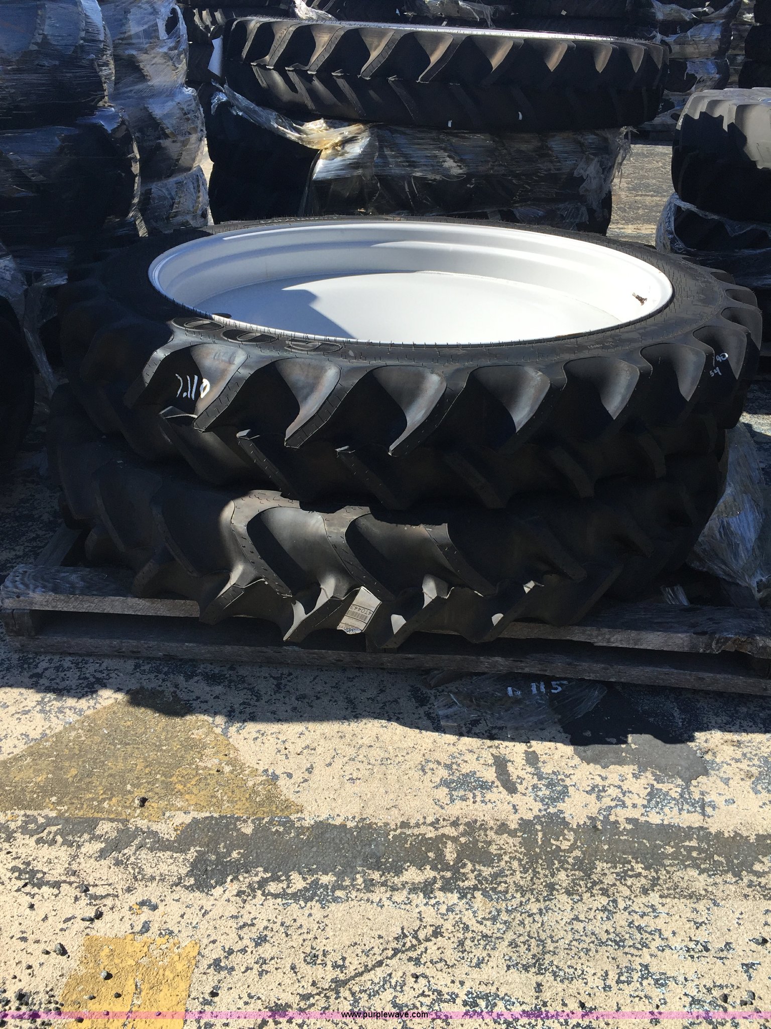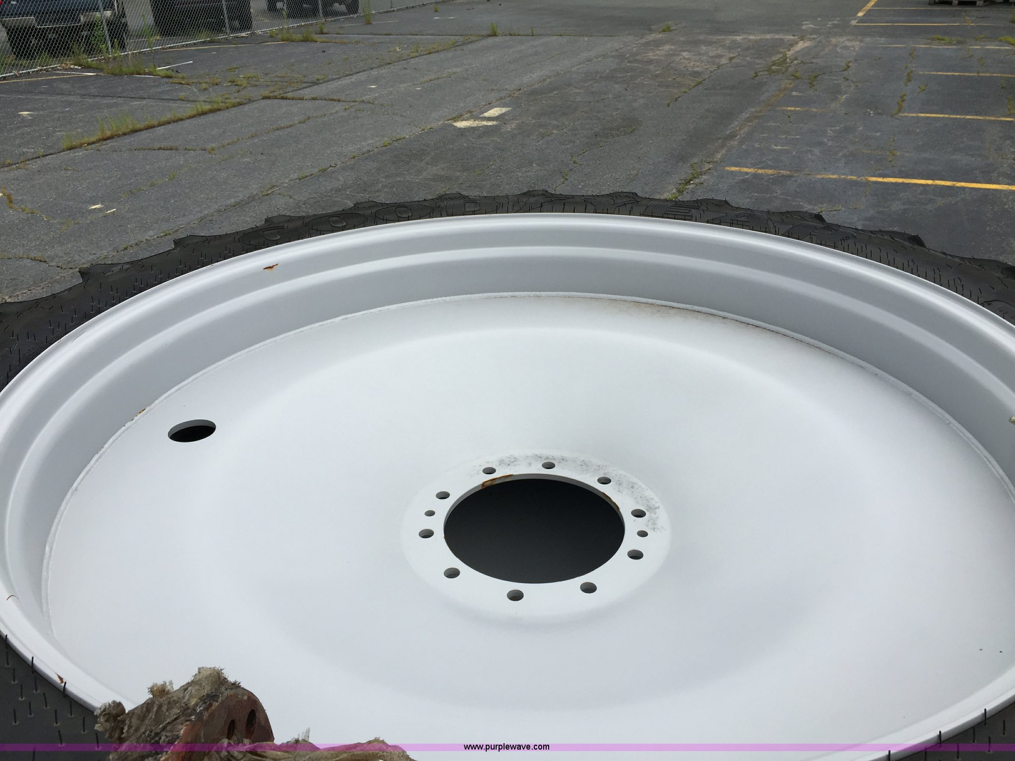 Purple Wave is selling a used Industrial Tires or Tracks in Maryland. This item is a Michelin 12.4R54 R1W row crop tire with the following: 6.5" tread spacing, Semi dished cast inner wheel, Steel outer wheel, Welded 10 bolt wheel, 11" pilot hole diameter, Three year age range, Model usage MF7600/7700, Catalog No. 7294868