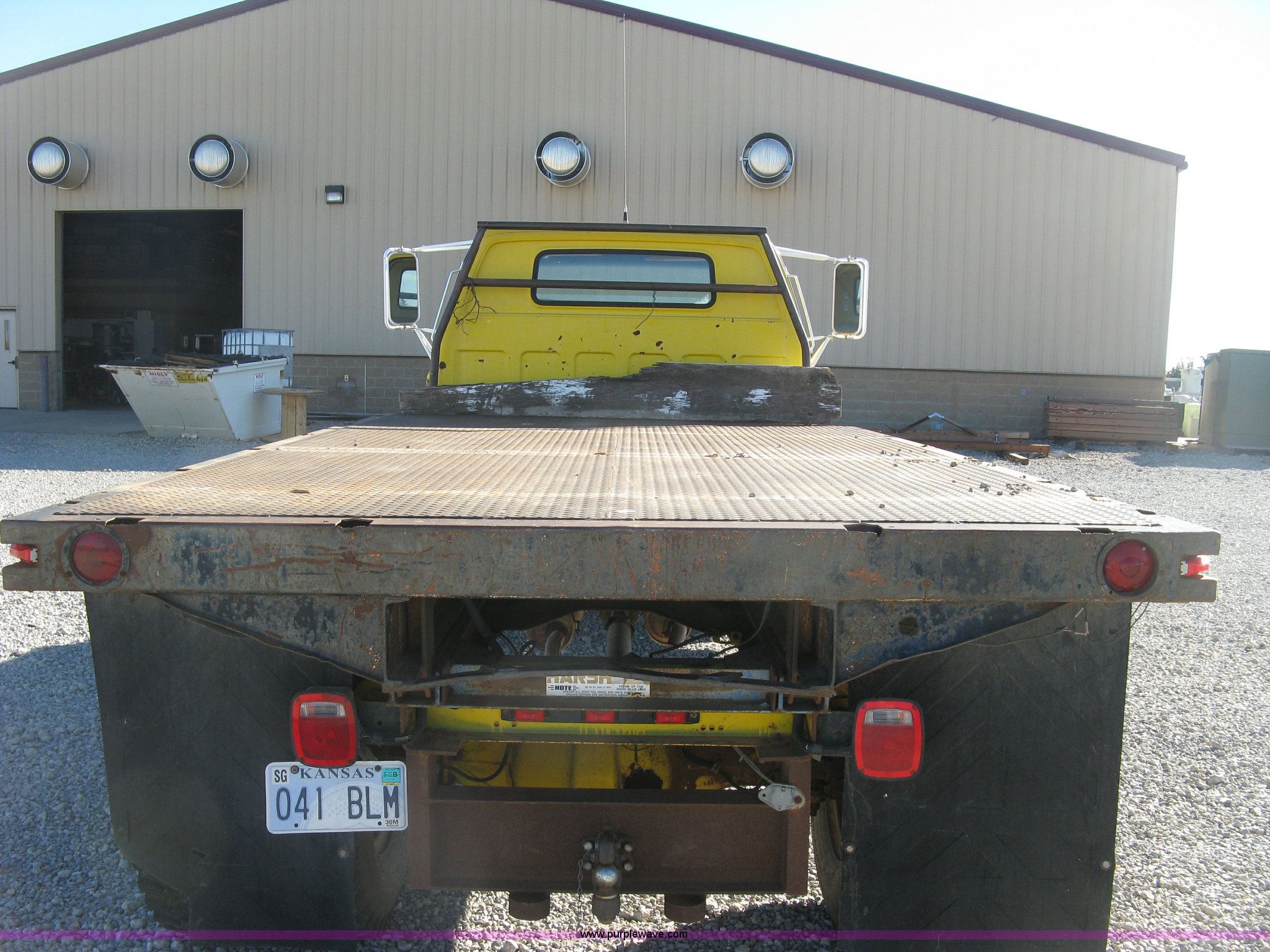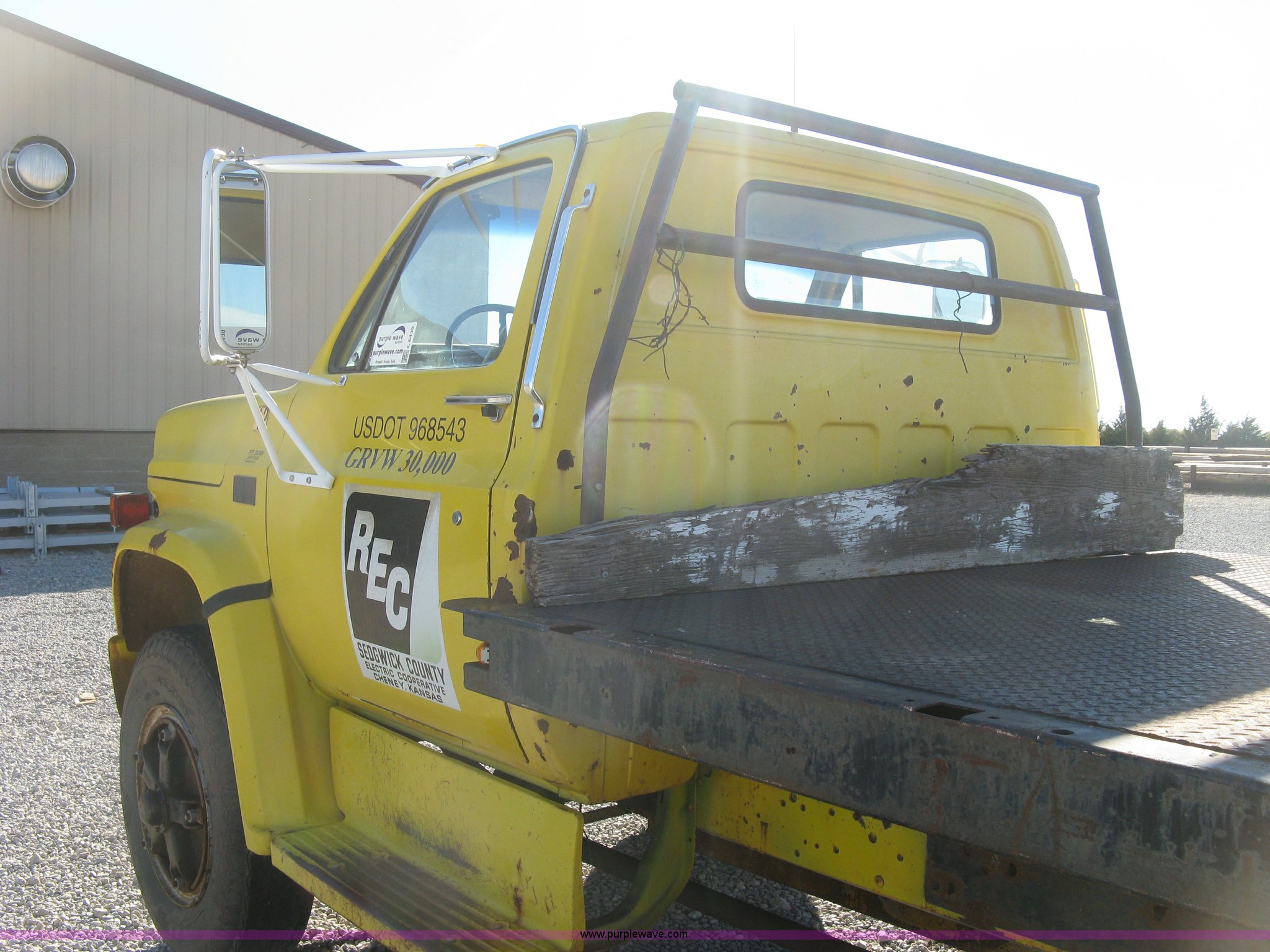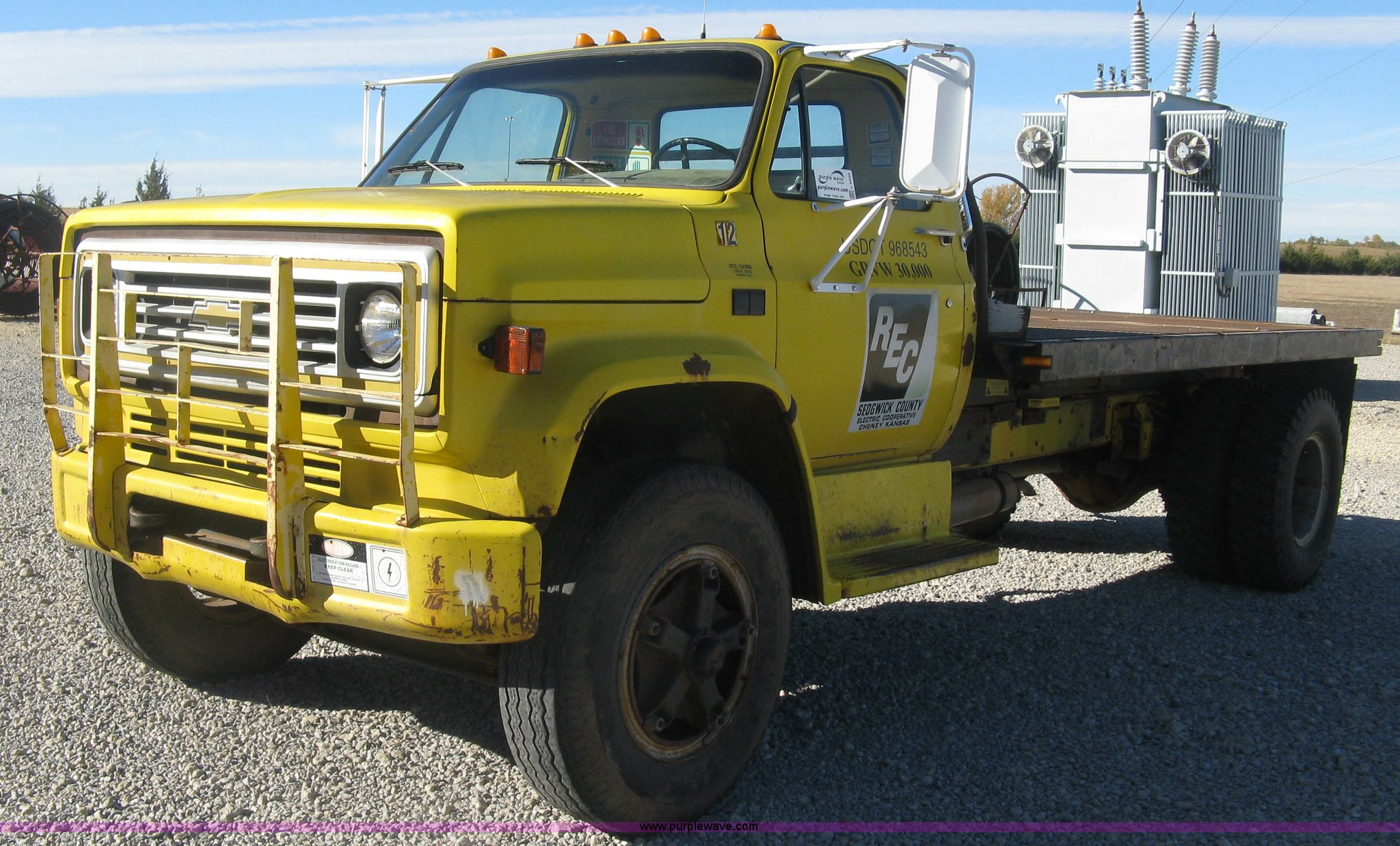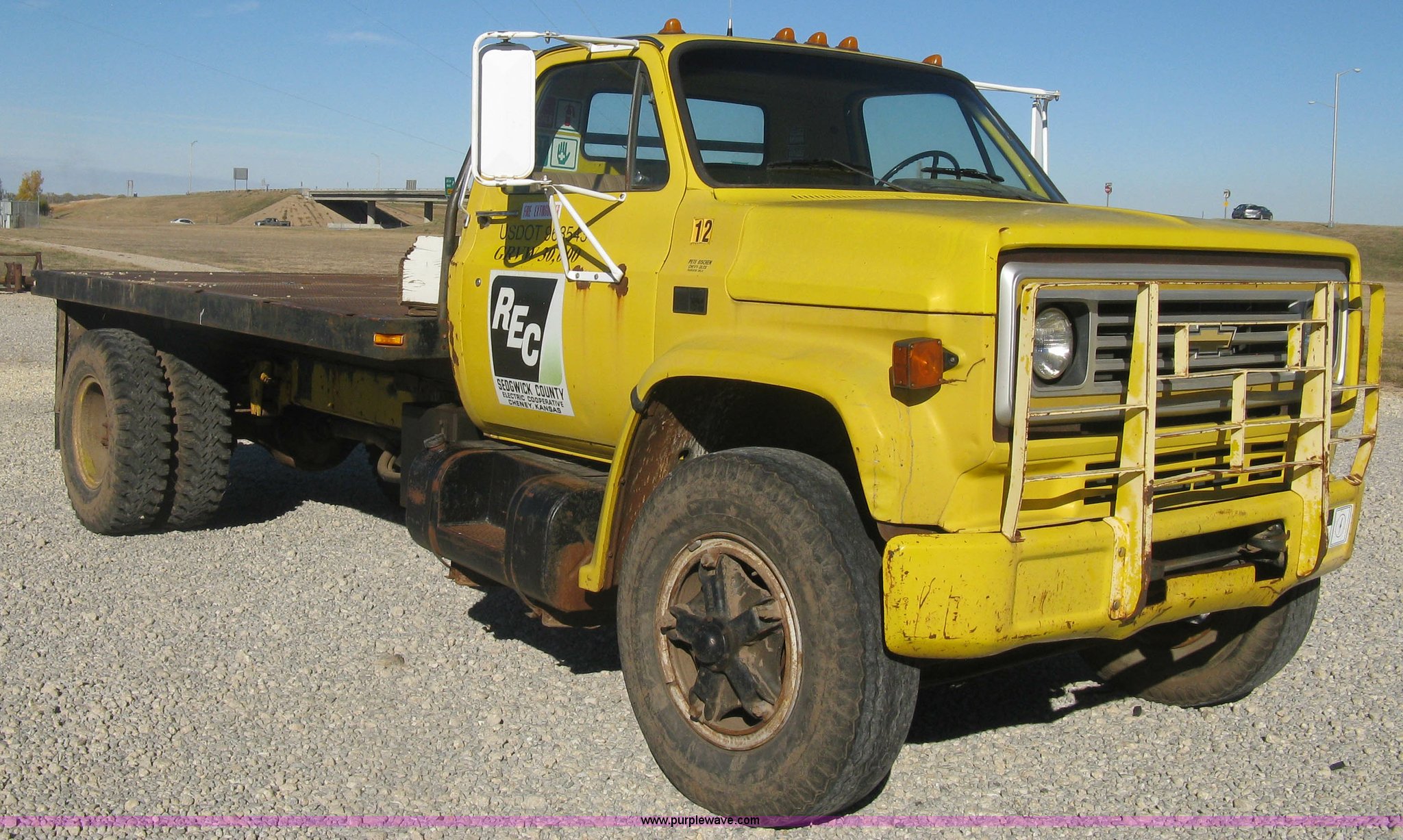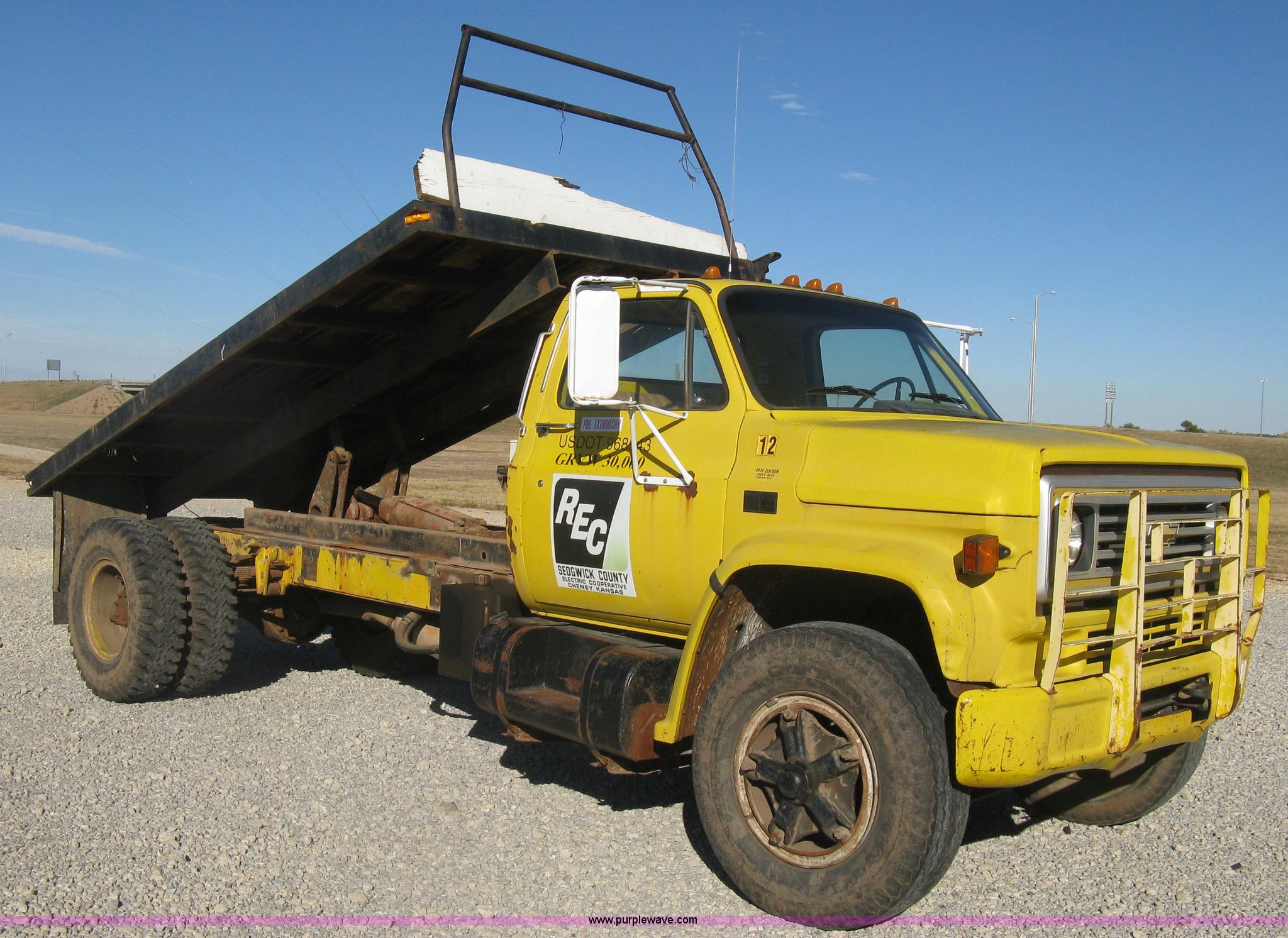 Purple Wave is selling a used Flat Bed Truck in Kansas. This item is a 1986 Chevrolet C70 Custom Deluxe flatbed truck with the following: 117,516 miles on odometer, 7.0L V8 gas engine, Five speed manual transmission, Two speed rear end, Heat, AM/FM, Manual windows and locks, Vinyl interior, Electric trailer brake booster, CB radio, Front tow hooks, Muncie PTO, Flatbed, 162"L x 94"W, Stake side pockets, Harsh single ram hoist, Ball/pintle hitch, Trailer wiring, Dual exhaust stacks, Spring suspension, 10.00-20 front tires, GVWR 30,000 lbs, FAWR 9,000 lbs, RAWR 21,200 lbs, Interior/exterior cosmetic damage, Scratches, Dents, Grill plastic damage, Unit# 12