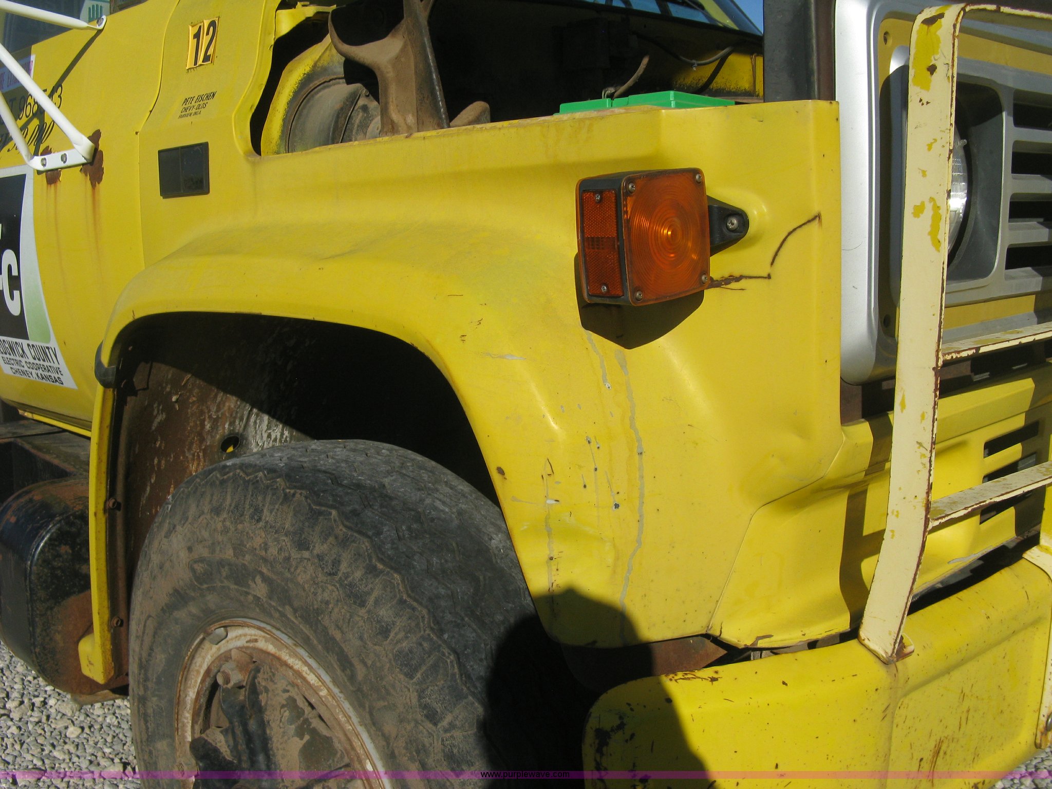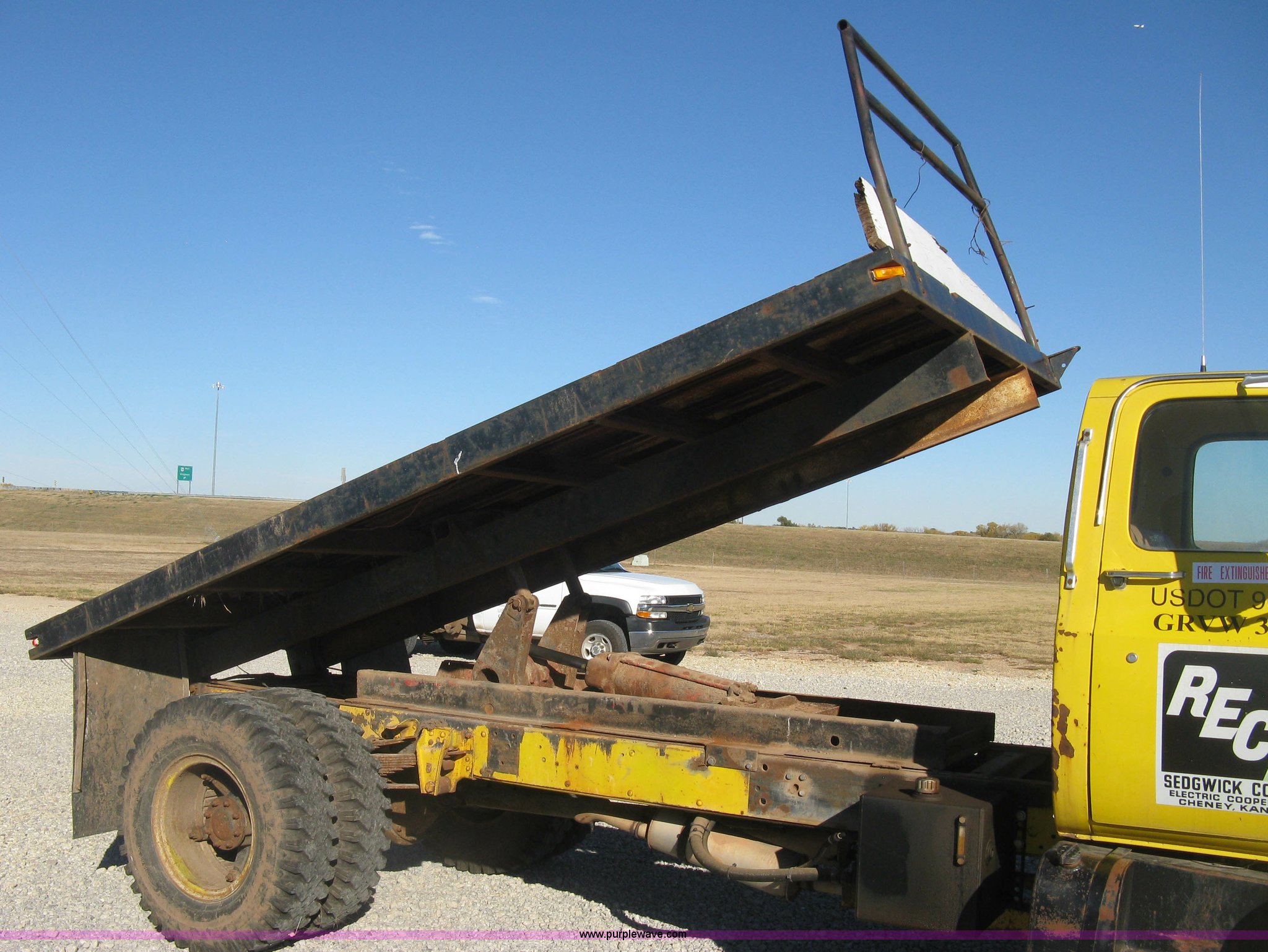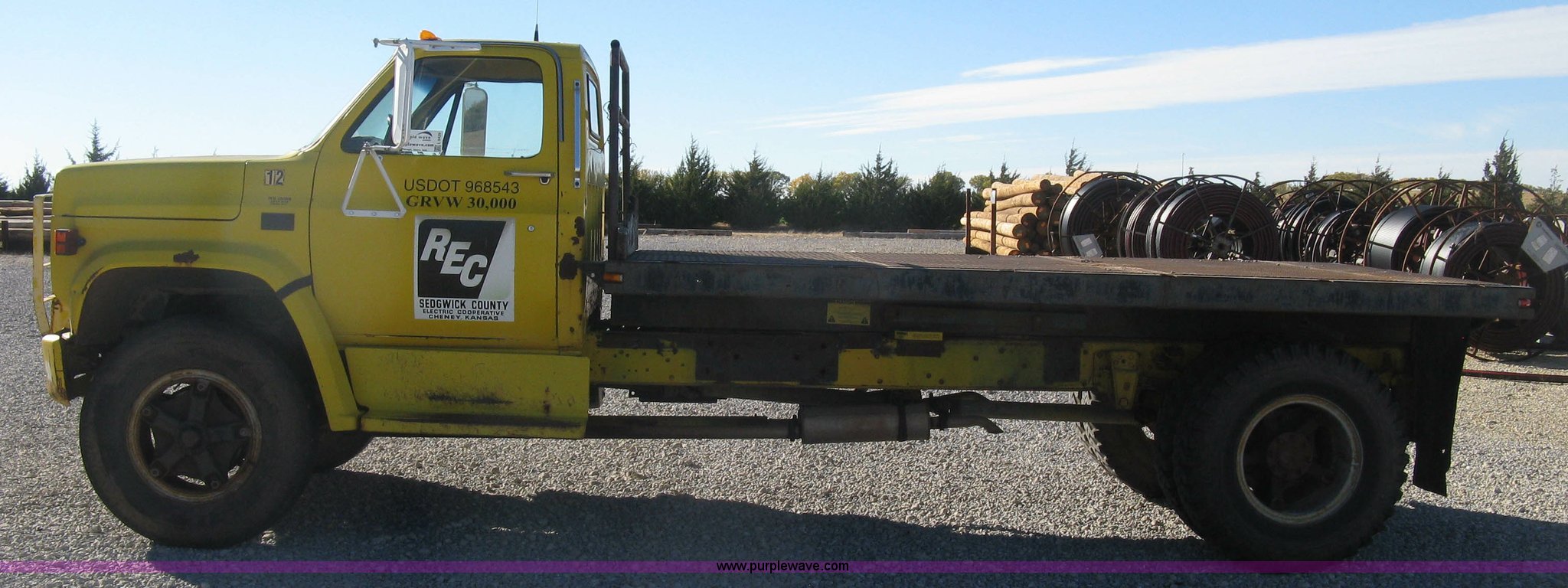 1986 Chevrolet C70 Custom Deluxe flatbed truck. 117,516 miles on odometer, 7.0L V8 gas engine, Five speed manual transmission, Two speed rear end, Heat, AM/FM, Manual windows and locks, Vinyl interior, Electric trailer brake booster, CB radio, Front tow hooks, Muncie PTO, Flatbed 162"L x 94"W , Stake side pockets, Harsh single ram hoist , Ball/pintle hitch, Trailer wiring, Dual exhaust stacks, Spring suspension, 10.00-20 front tires, GVWR 30,000 lbs, FAWR 9,000 lbs, RAWR 21,200 lbs, Interior/exterior cosmetic damage, Scratches , Dents, Grill plastic damage, Unit# 12. 1GBL7D1E0GV107996. Sedgwick County Electric Cooperative. 1355 S 383rd St W. Cheney , KS 67025