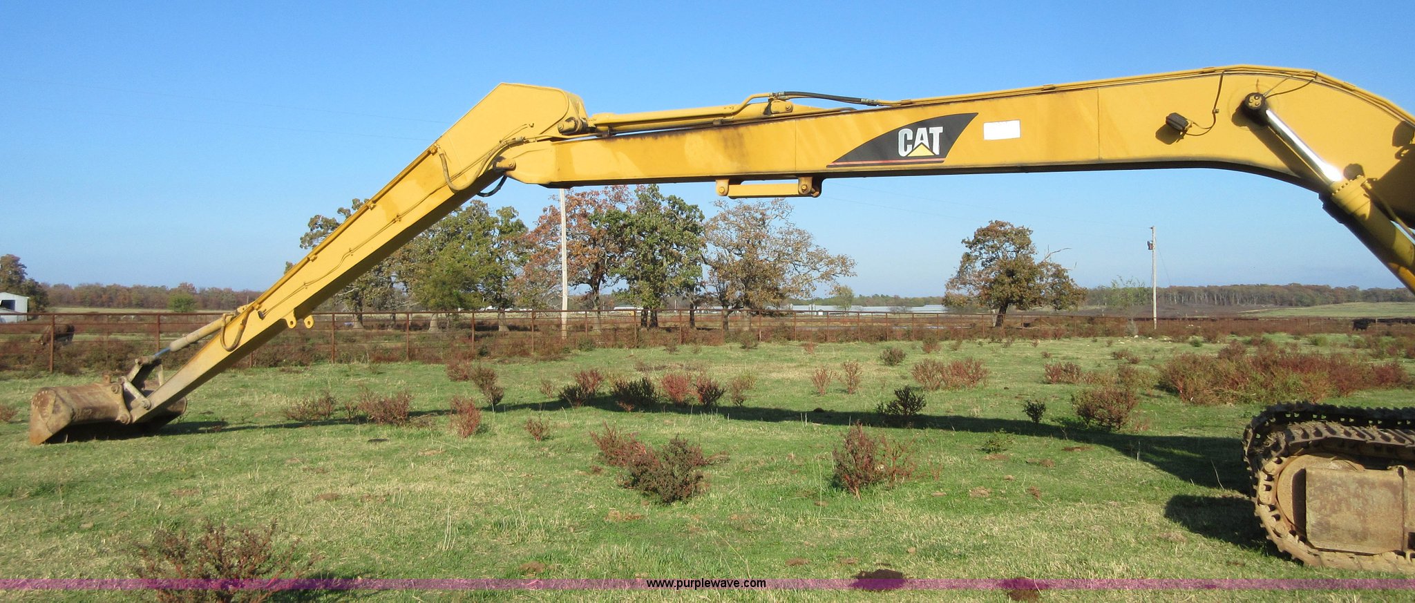 1996 Caterpillar 320L long reach excavator. 12,871 hours on meter, Caterpillar six cylinder turbo diesel engine, Hydrostatic transmission, EROPS, Suspension seat, Wipers, Front work lights, 20' stick length, 60" clean out bucket, Steel triple grouser track pads, 46,277 lbs. base operating weight, Serial 9KK05124. View equipment video. Cates Farm. 7660 N. Highway 82. Spavinaw, OK 74366