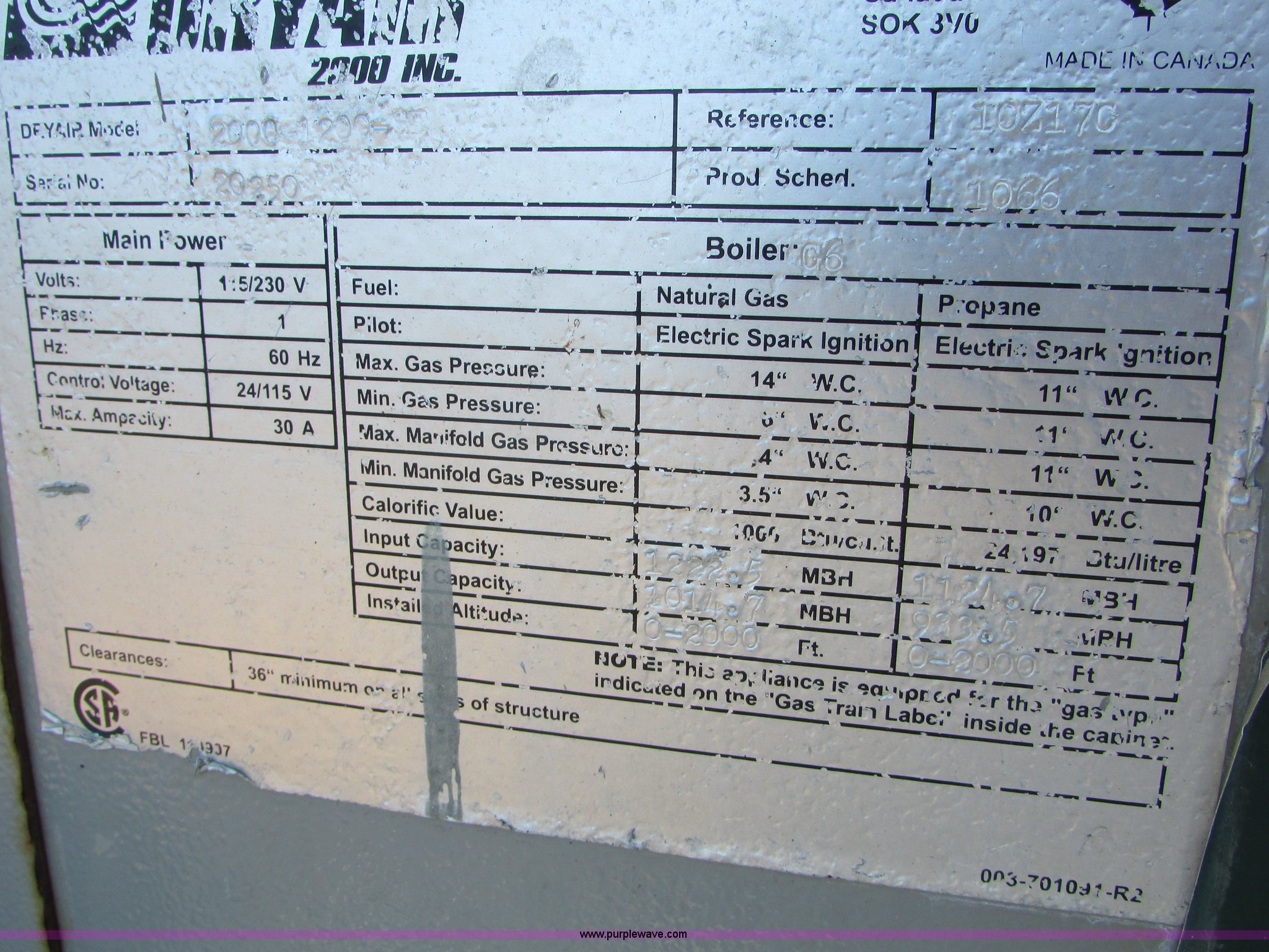 DryAir heater system. Boiler Model 2900-12007, Gas or propane fired, 1,200,000 BTU, Serial 20250, (6) fan coils Model 200, 200,000 BTU, Ref. 17Z080, 29Z080, 10Z170, 17Z080, 10Z300, 07Z026, Gas converter, (2) four station manifolds 2" x 1", (4) 2" x 50' hoses, (12) 1" x 50' hoses. 2D9BU16111S100051. Comstock Construction Inc.. 280 11th St S. Whapeton, ND 58075