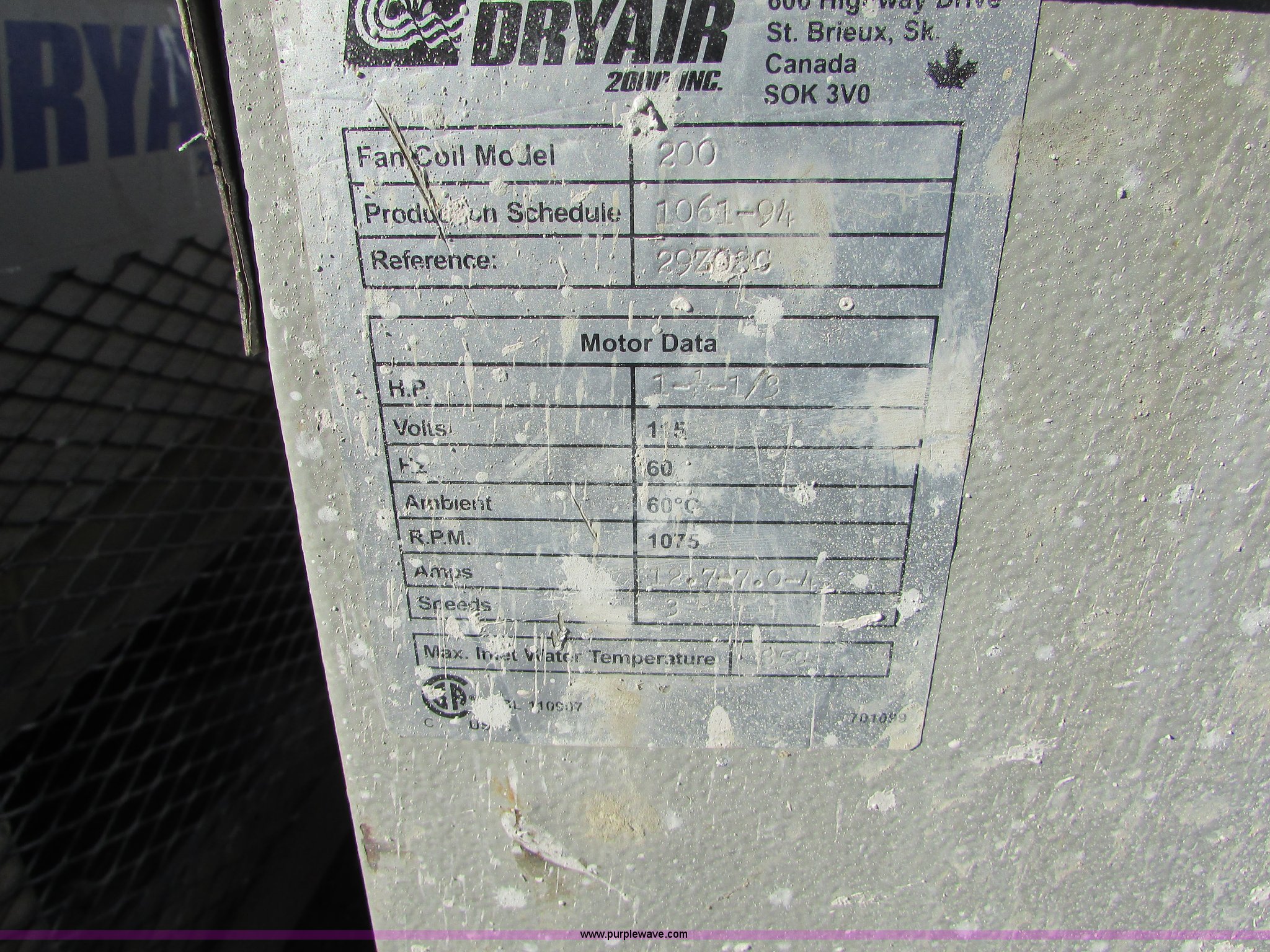 Purple Wave is selling a used Portable Heater or Fan in North Dakota. This item is a DryAir heater system with the following: Boiler, Model 2900-12007, Gas or propane fired, 1,200,000 BTU, Serial 20250, (6) fan coils, Model 200, 200,000 BTU, Ref. 17Z080, 29Z080, 10Z170, 17Z080, 10Z300, 07Z026, Gas converter, (2) four station manifolds, 2" x 1", (4) 2" x 50' hoses, (12) 1" x 50' hoses
