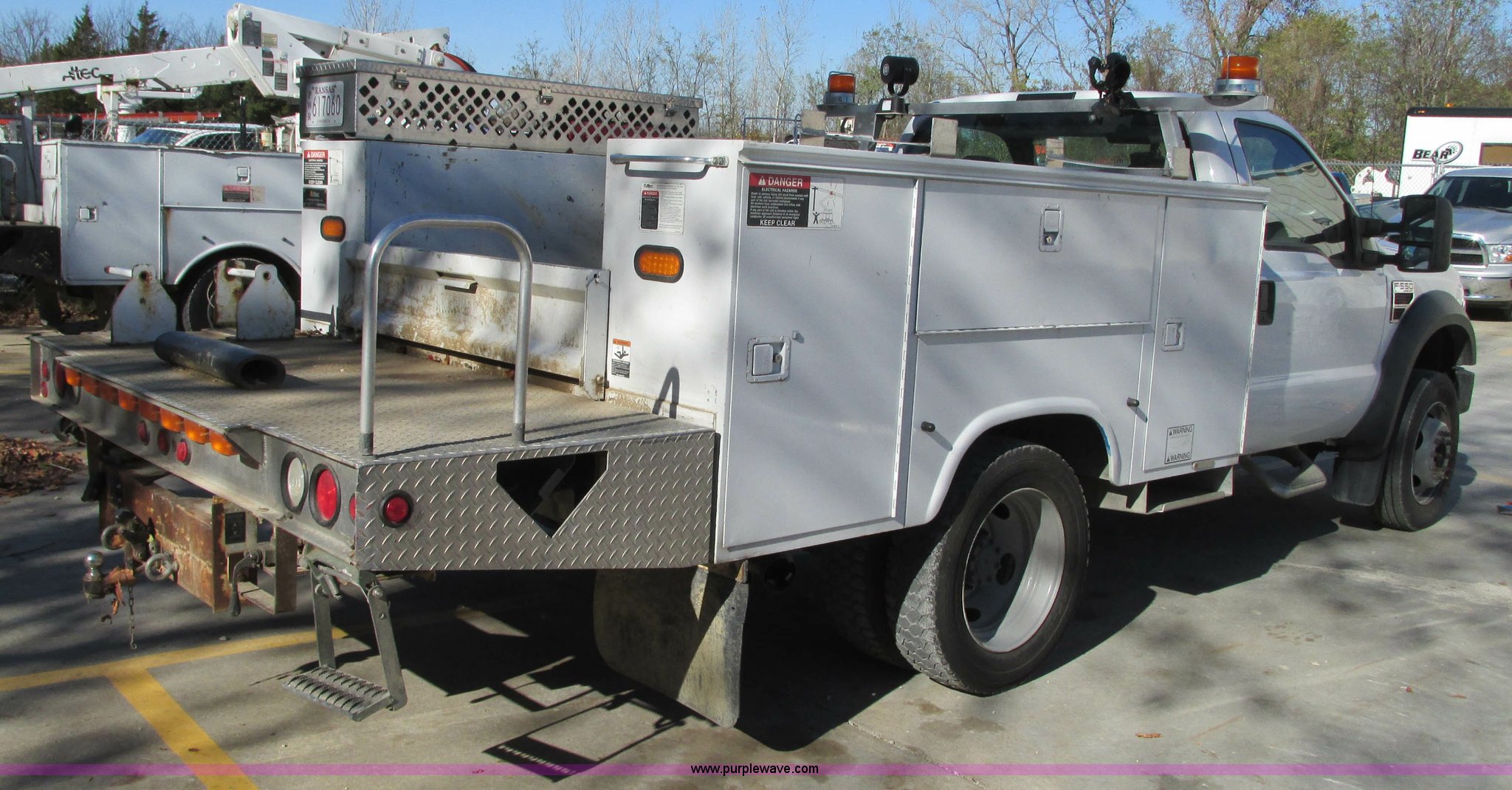 Purple Wave is selling a used Service Truck in Missouri. This item is a 2008 Ford F550 Super Duty service truck with the following: 94,595 miles on odometer, 6.4L V8 OHV 32V turbo diesel engine, Automatic transmission, AC and heat, AM/FM, Trailer brake controller, Auxiliary controls, Altec 6101D545 utility bed, (6) compartments, Work lights, Electrical outlet, Hydraulic outriggers, Backup alarm, Power inverter, Front tow hooks, Pintle hitch, Trailer wiring, 225/70R19.5 tires, Unit# 633