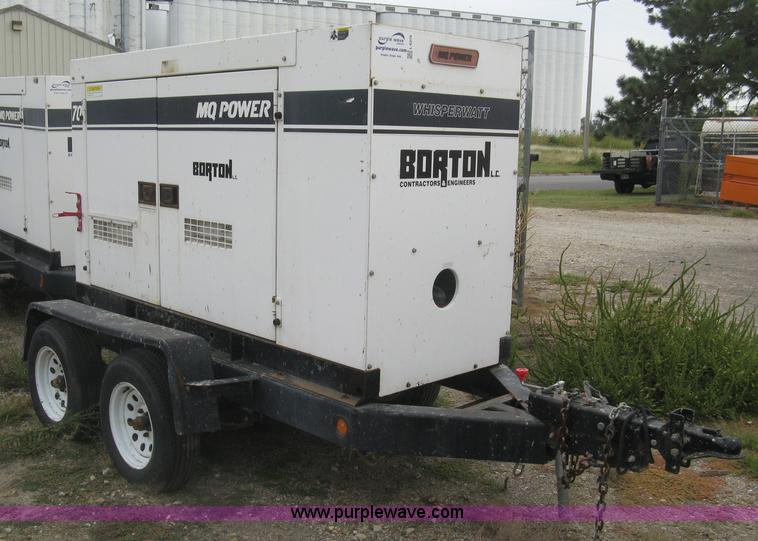 Purple Wave is selling a used Generator Set in Kansas. This item is a Multiquip DCA-70SS1U Whisperwatt 70 generator with the following: 3,159 hours on meter, Isuzu FF-4BG1T four cylinder turbo diesel engine, 87 HP, AC generator, Model DB-0831I2, Three phase, 60 Hz, 70 kVA, 240/480V, Single phase, 60 Hz, 40 kVA, 240/120V, 39.6 gallon fuel tank, 2 5/16" ball hitch, Spring suspension, Surge brakes, ST205/75D14 tires, Serial 7350615, Unit# 17-0615
