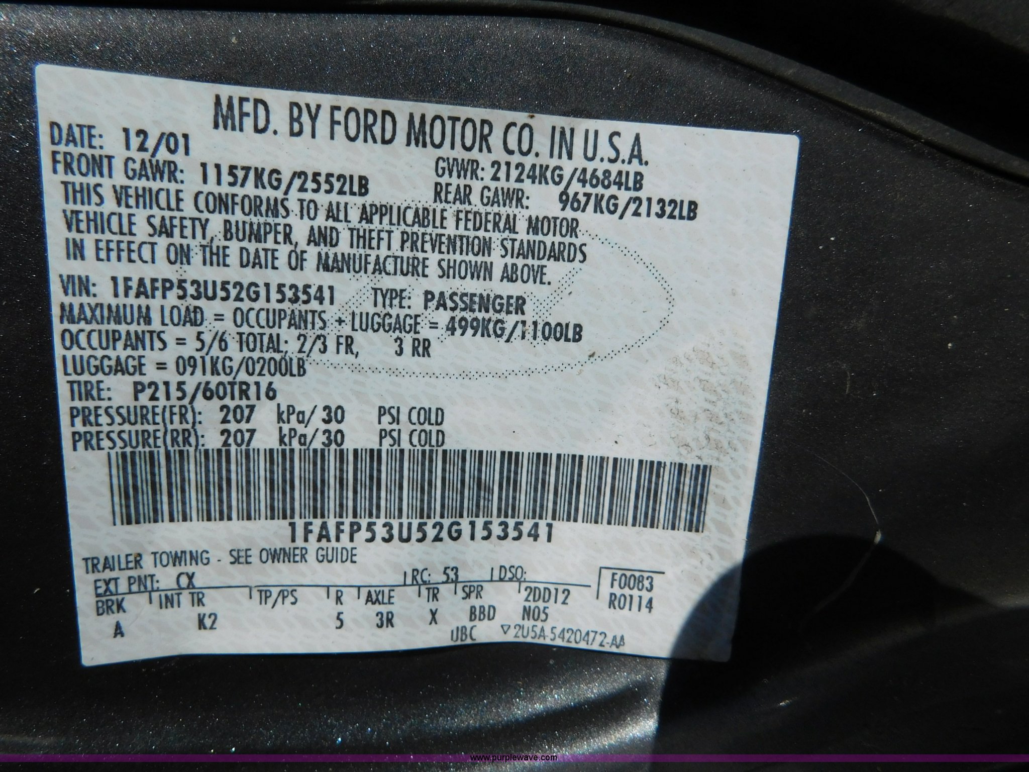 Purple Wave is selling a used Passenger Vehicle in Kansas. This item is a 2002 Ford Taurus with the following: 113,855 miles on odometer, Miles may vary, still in use, 3.0L V6 OHV 12V gas engine, Automatic transmission, AC and heat, Tilt, Cruise, AM/FM/CD, Power windows, locks, mirrors, and seat, Cloth interior, Electric pedal controls, P215/60R16 tires, Interior/exterior cosmetic damage, Pitted window, Weak battery, Decals will be removed prior to auction date, Transmission shifting issue