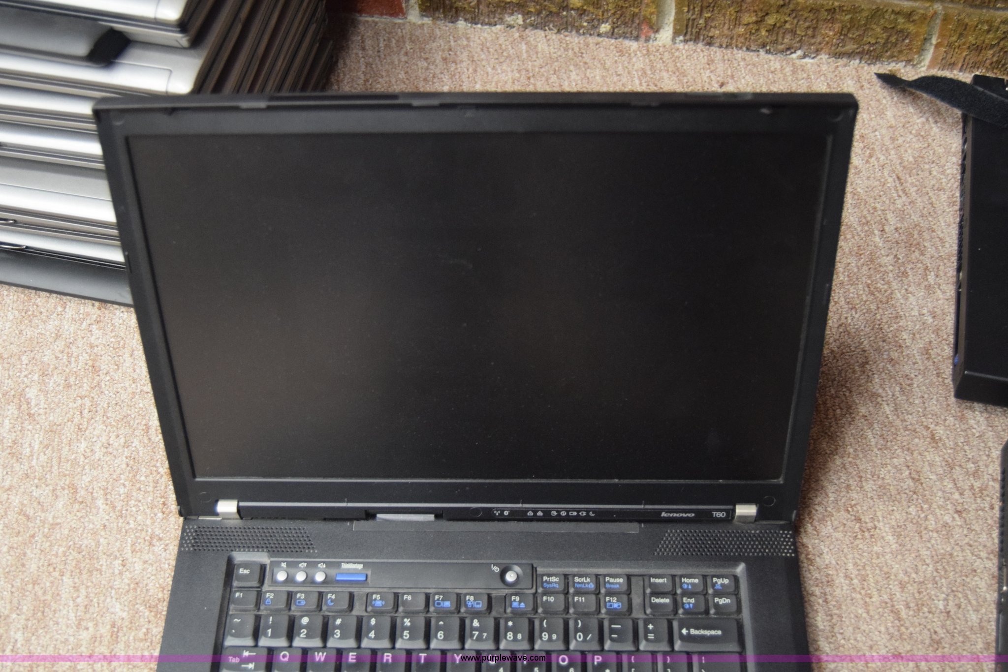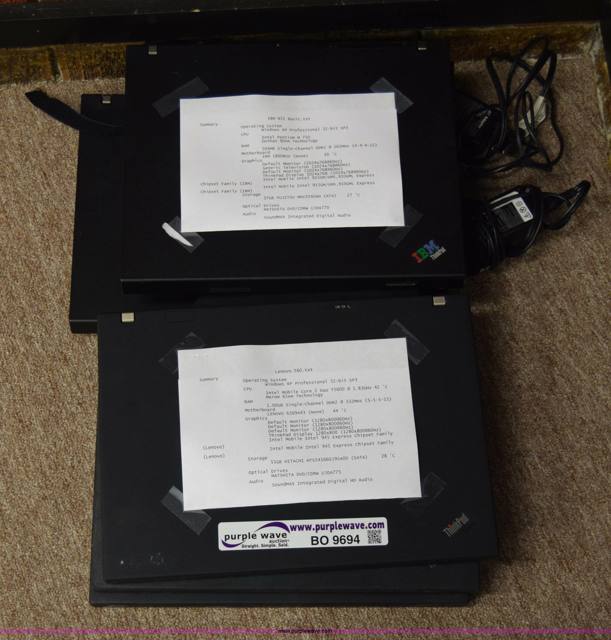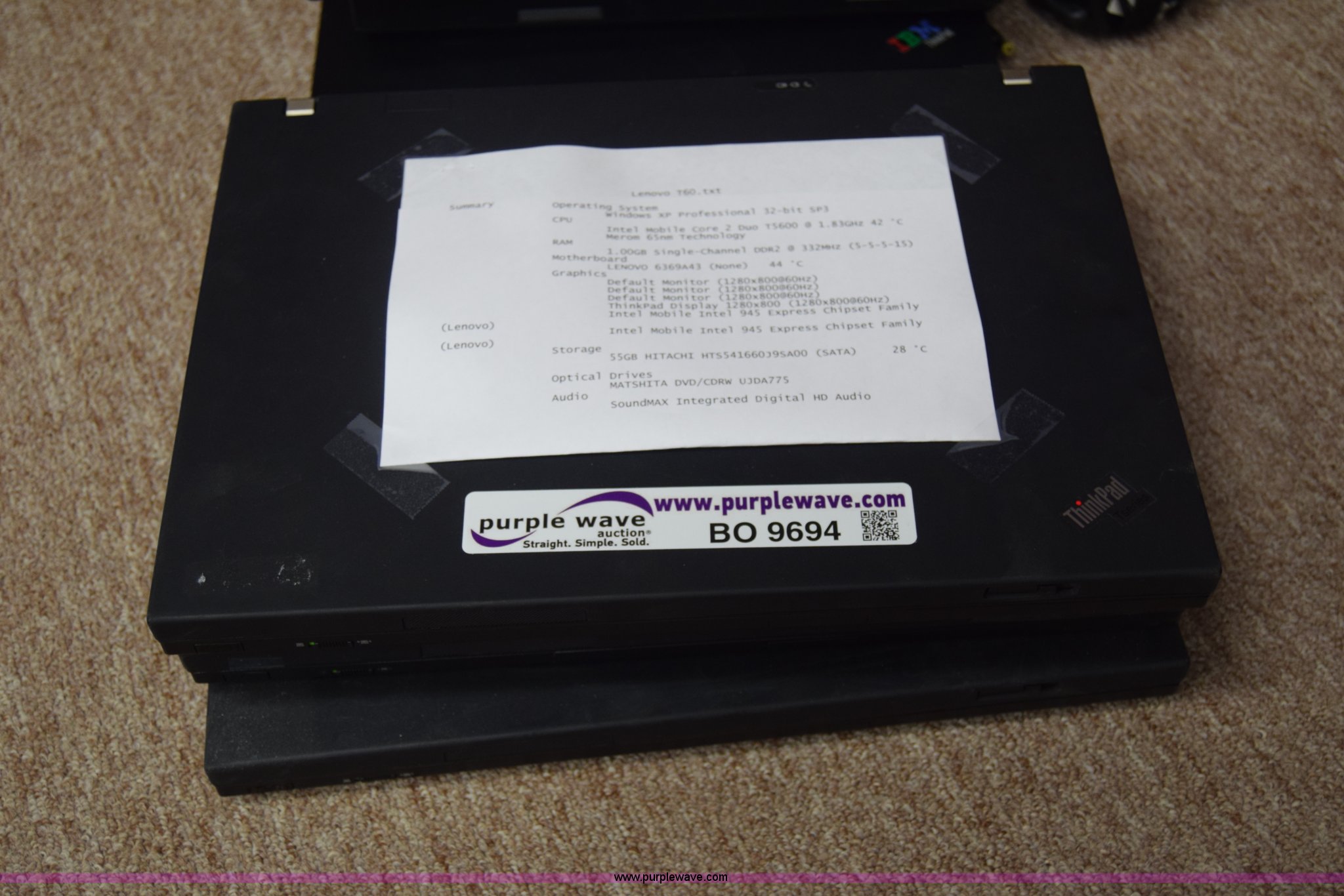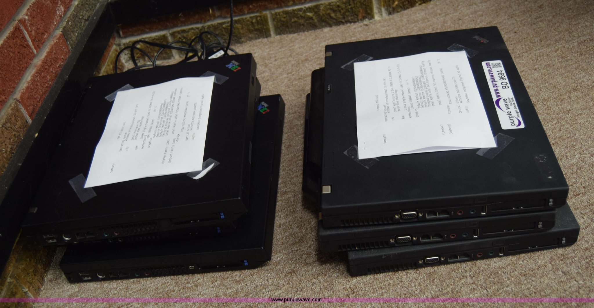 Purple Wave is selling a used Computers in Kansas. This item is a (6) laptop computers with the following: (3) Lenovo T60, 1 GB RAM, 55 GB hard drive, Windows XP Professional, (3) IBM R52, 504 MB RAM, 37 GB hard drive, Windows XP Professional
