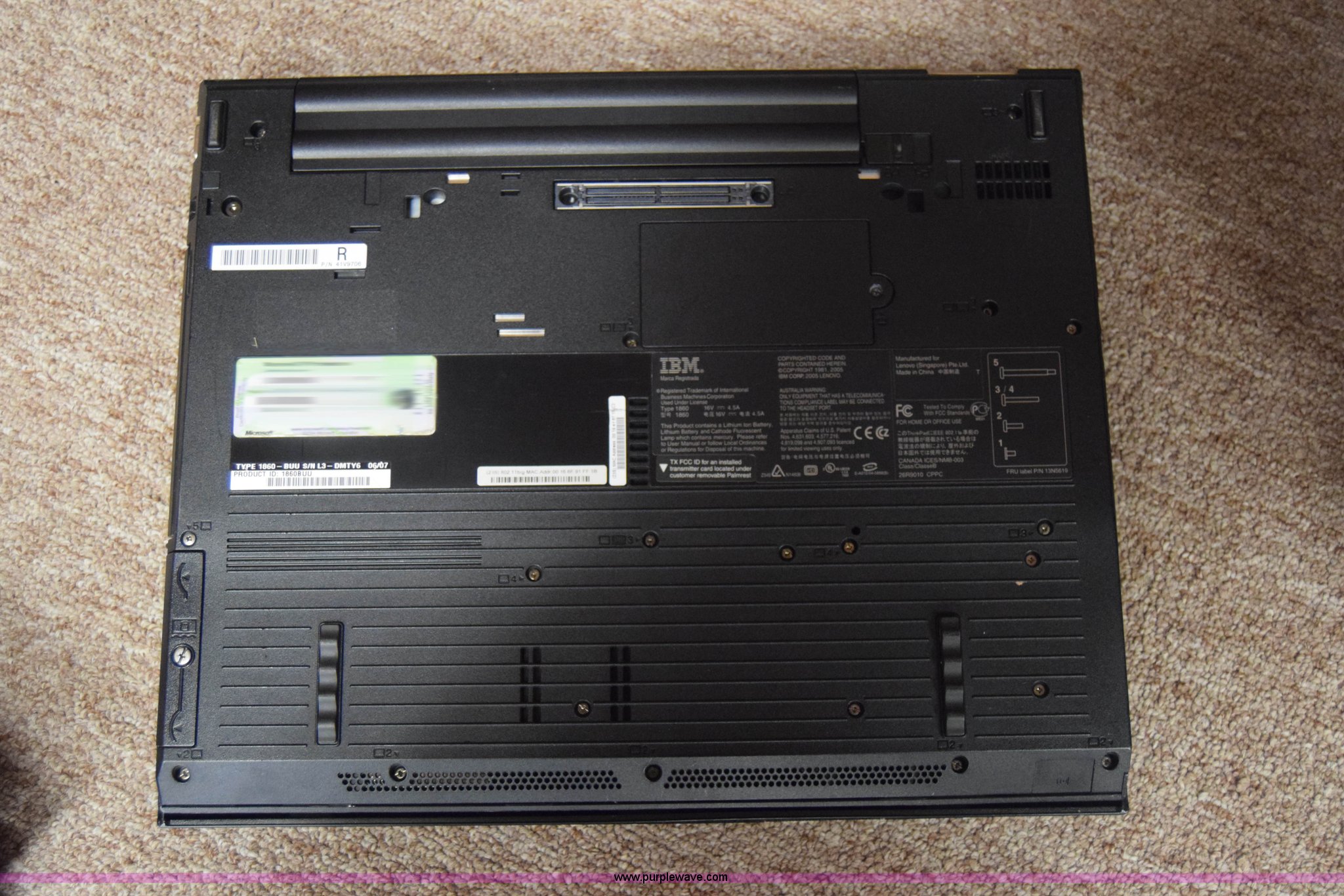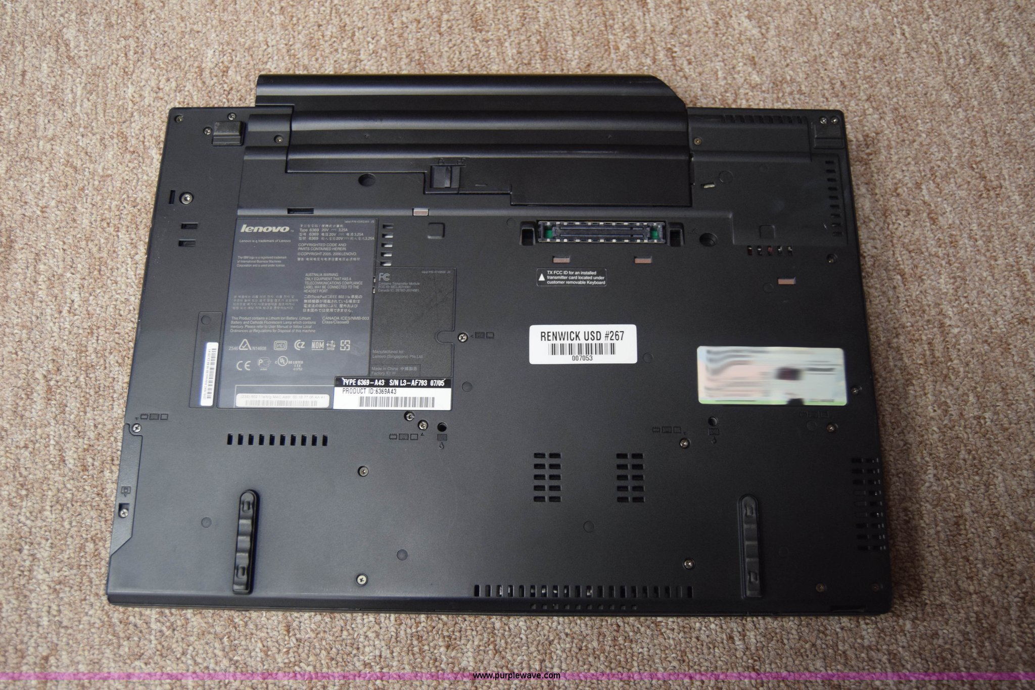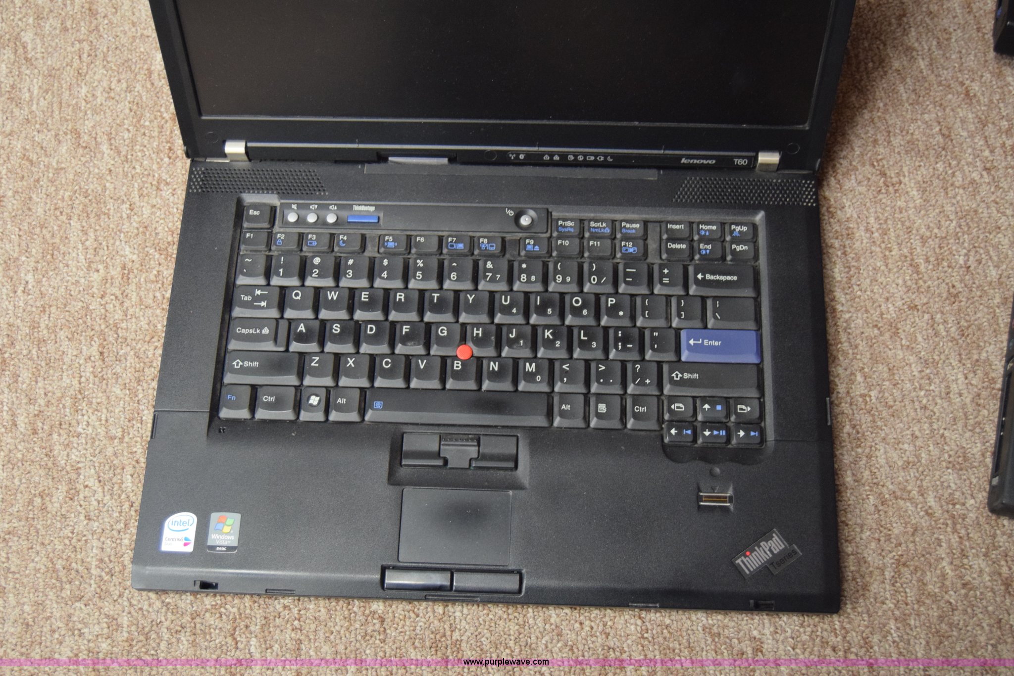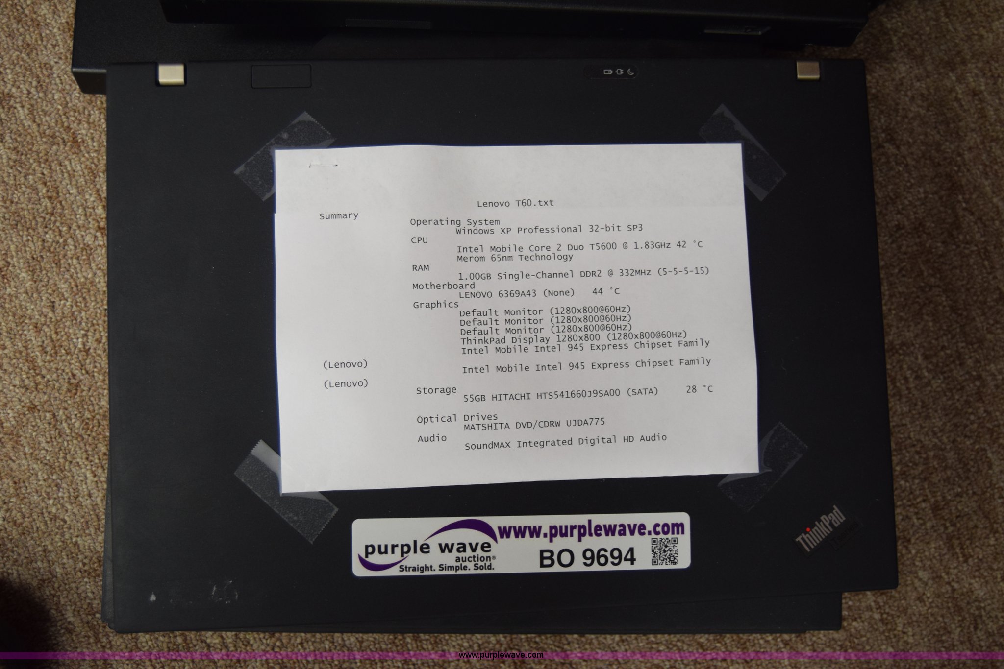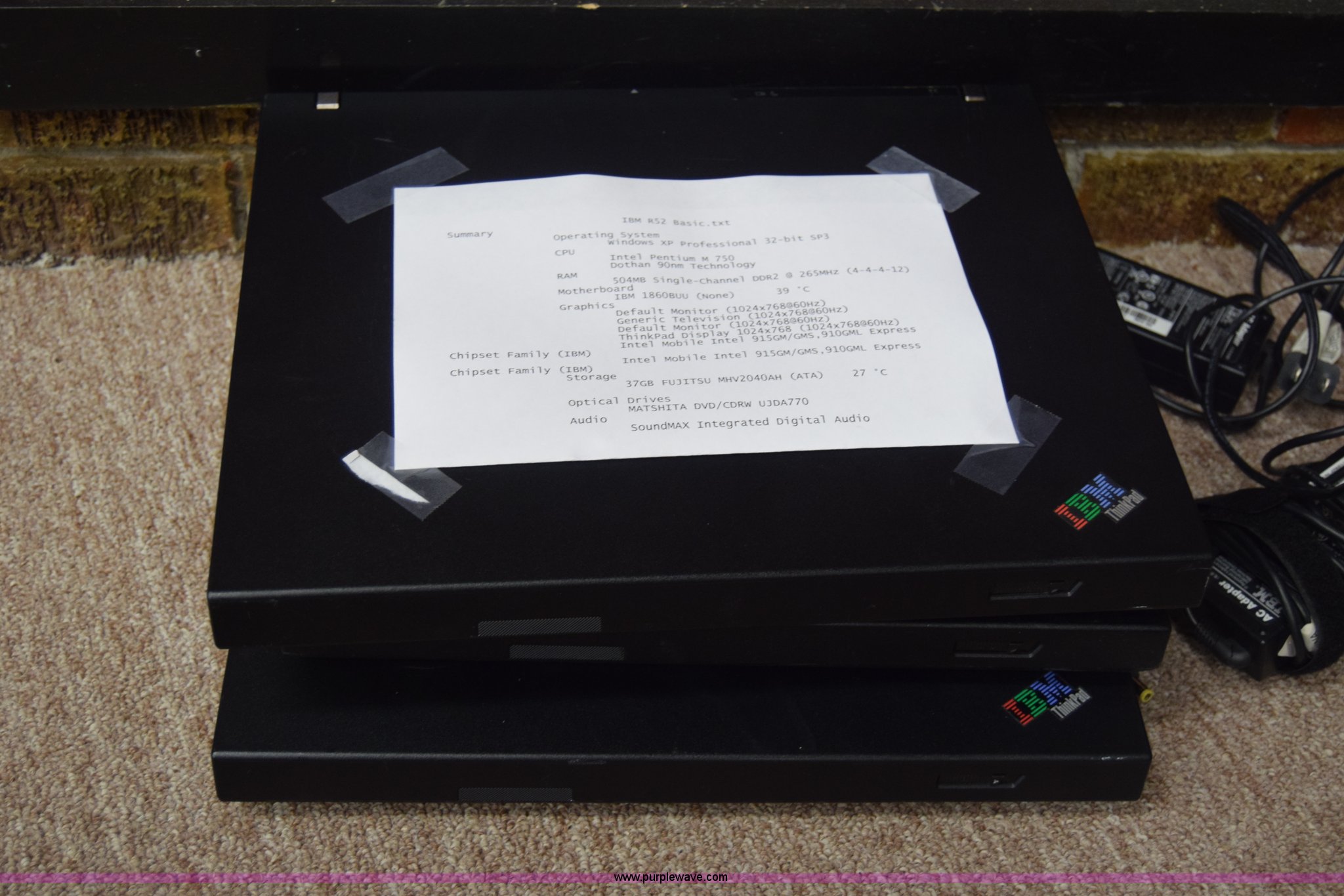 Purple Wave is selling a used Computers in Kansas. This item is a (6) laptop computers with the following: (3) Lenovo T60, 1 GB RAM, 55 GB hard drive, Windows XP Professional, (3) IBM R52, 504 MB RAM, 37 GB hard drive, Windows XP Professional