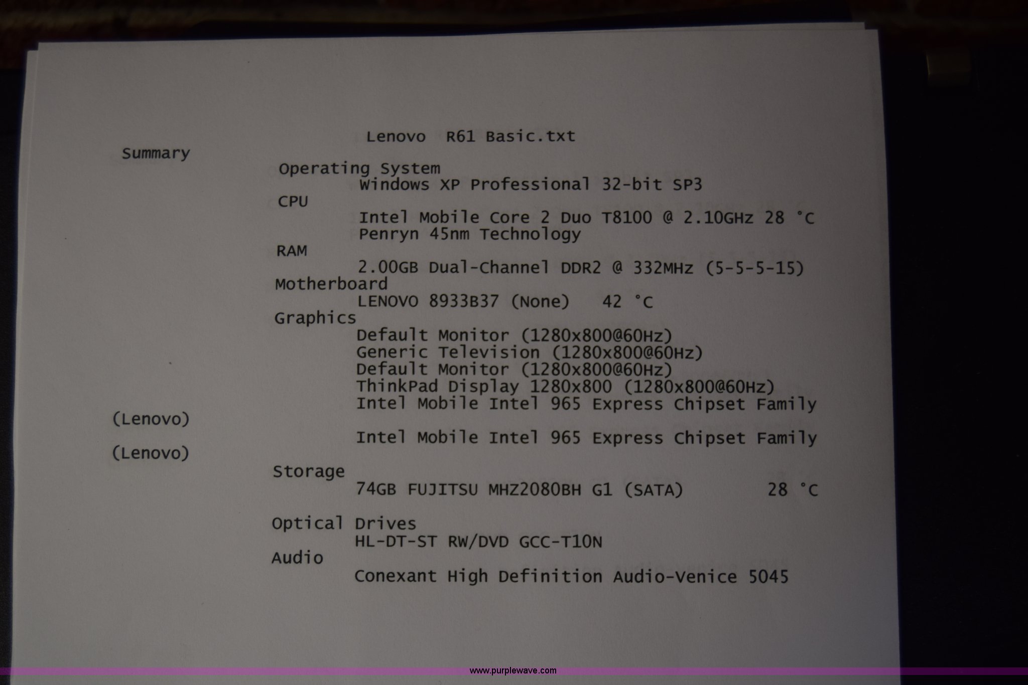 Purple Wave is selling a used Computers in Kansas. This item is a (15) Lenovo R61 laptop computers with the following: Intel Mobil Core 2 Duo processors, 2 GB RAM, 74 GB storage, Windows XP Professional