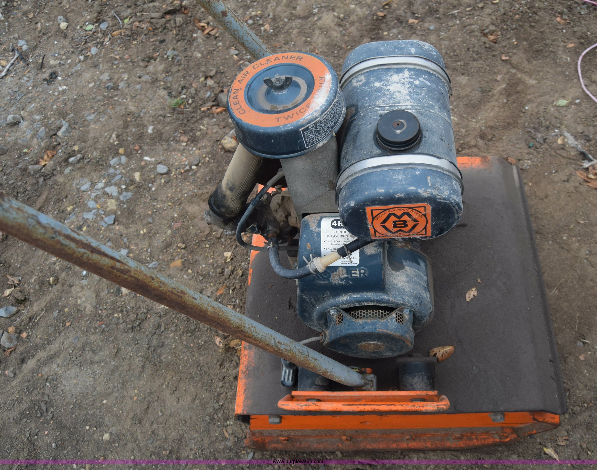 Purple Wave is selling a used Plate Compactor in Kansas. This item is a Ground Pounder K91T vibratory plate compactor with the following: Kohler gas engine, 22"L x 20W" plate, Non-operational unit