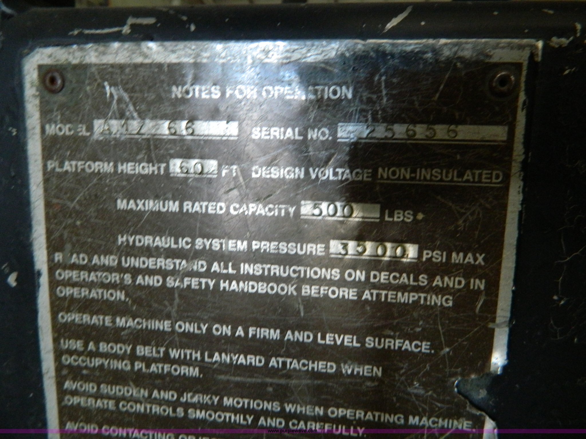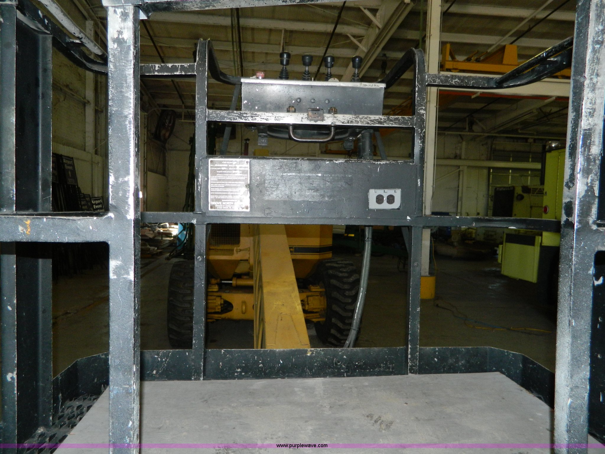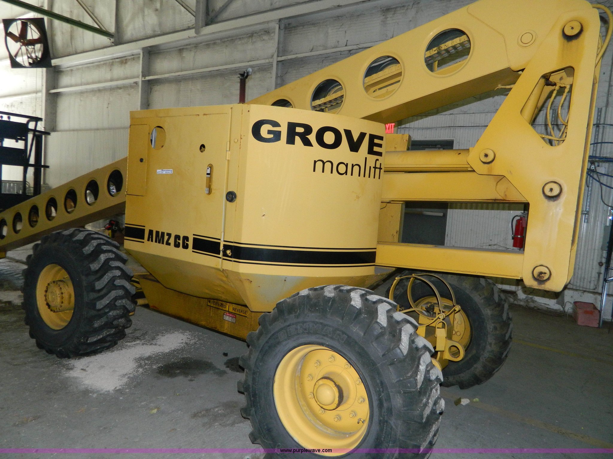 Purple Wave is selling a used Boom Lift in Kansas. This item is a Grove AM266 boom lift with the following: 6,643 hours on meter, Four cylinder dual fuel engine, Gas or propane capable, 500 lbs maximum lift capacity, 60' maximum lift height, Hydraulic leveling, Platform and ground controls, AC power outlet, Platform rotation, 15.19-5 tires, Serial 25656