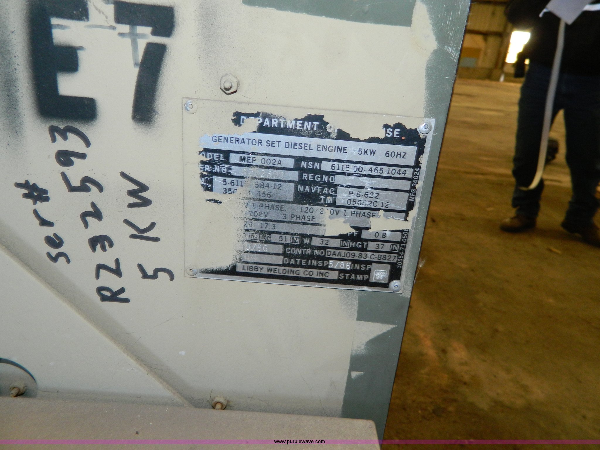 Purple Wave is selling a used Generator Set in Kansas. This item is a 1986 US Army MEP002A generator with the following: Diesel engine, 5 kW, Unknown operating condition